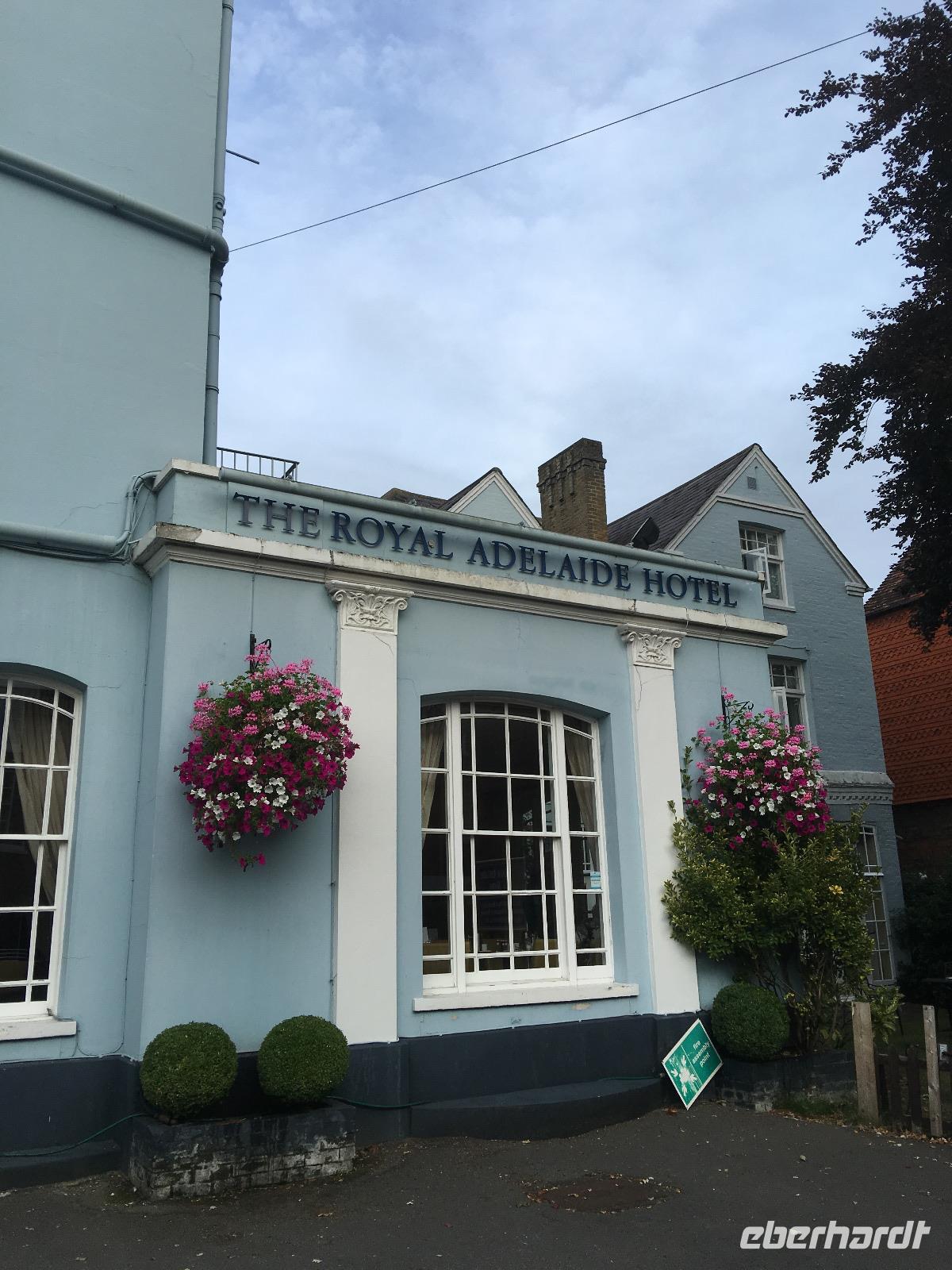 Am späten Nachmittag geht es dann mit dem Bus bis ins Städtchen Windsor, wo wir unser kleines, typisch englisches, Hotel Adelaide beziehen. Es liegt nur ein paar Gehminuten vom Zentrum Windsors entfernt und nur wenige Meter vom Long Walk zwischen dem Schloss Windsor und der Pferderennarena (Racecourse) Ascot. Im winzigen Ballroom des originellen Hotels genießen wir ein schmackhaftes 3-Gang-Menü und probieren die Herren verschiedene lokale Biere, von denen eines - das Thatcher Cider - zumindest nicht geschmeckt hat.