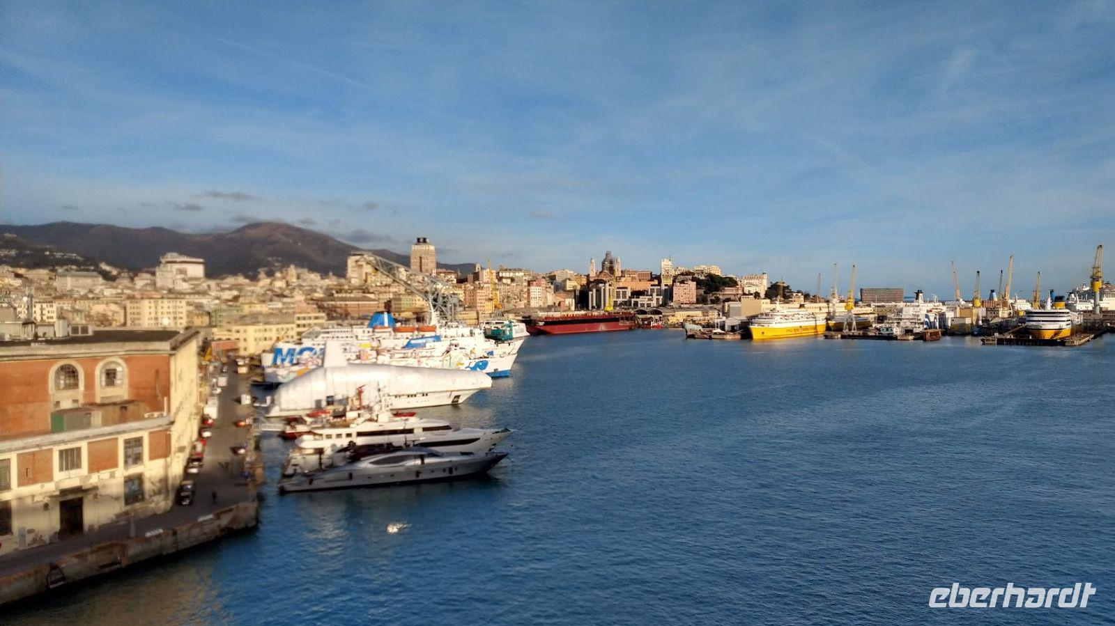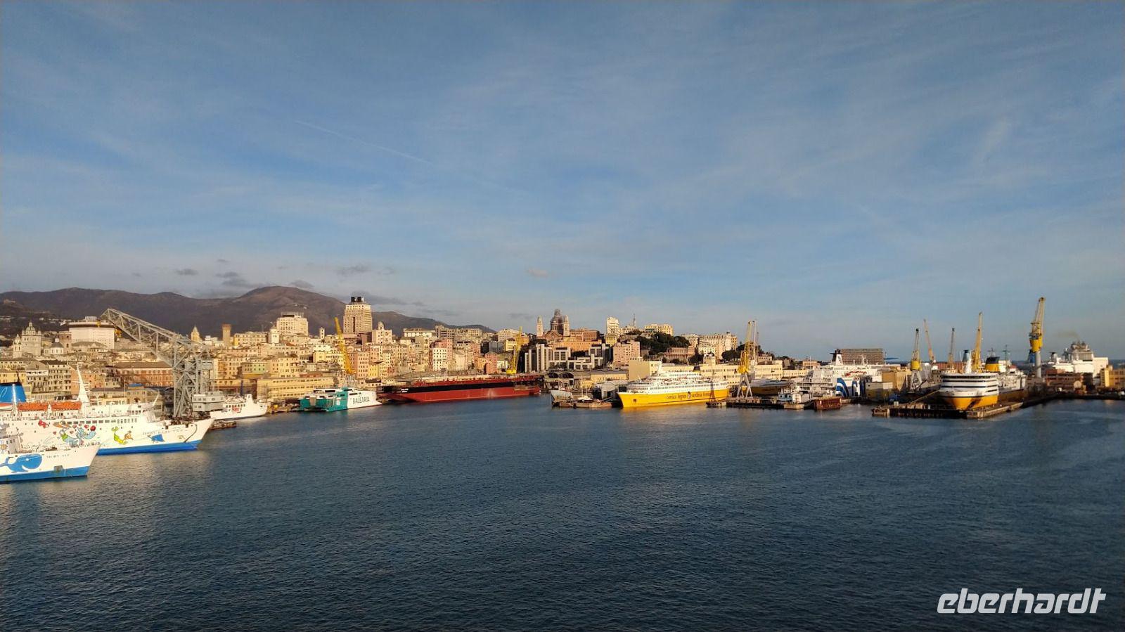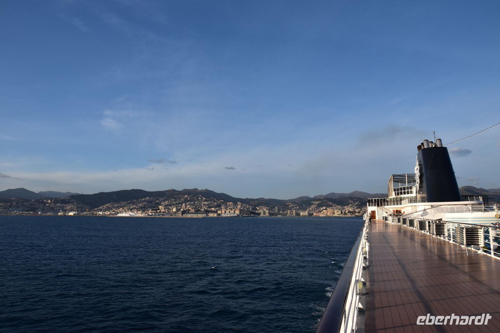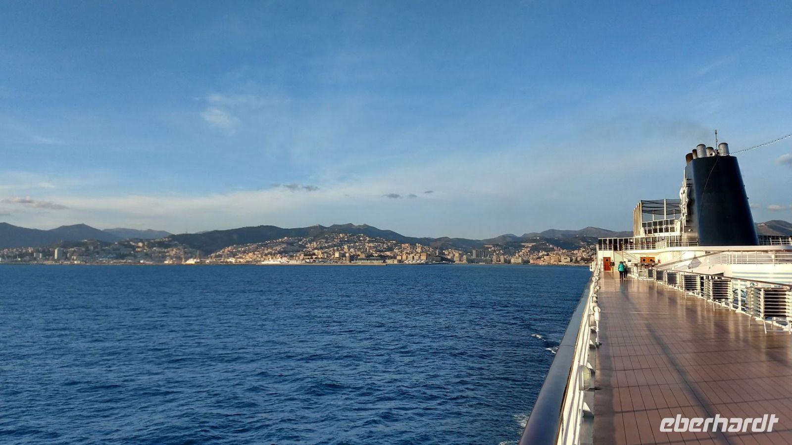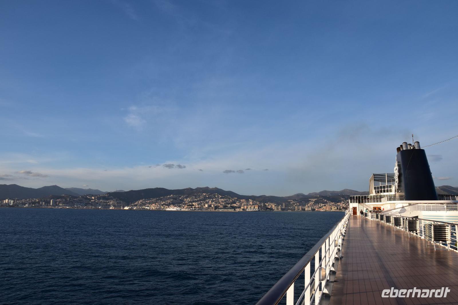 Pünktlich 17:00 Uhr erfolgt das Ablegen und die Ausfahrt aus dem Hafen von Genua