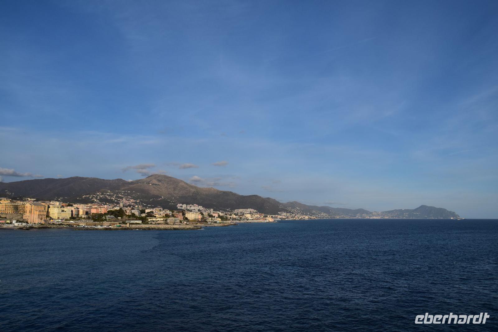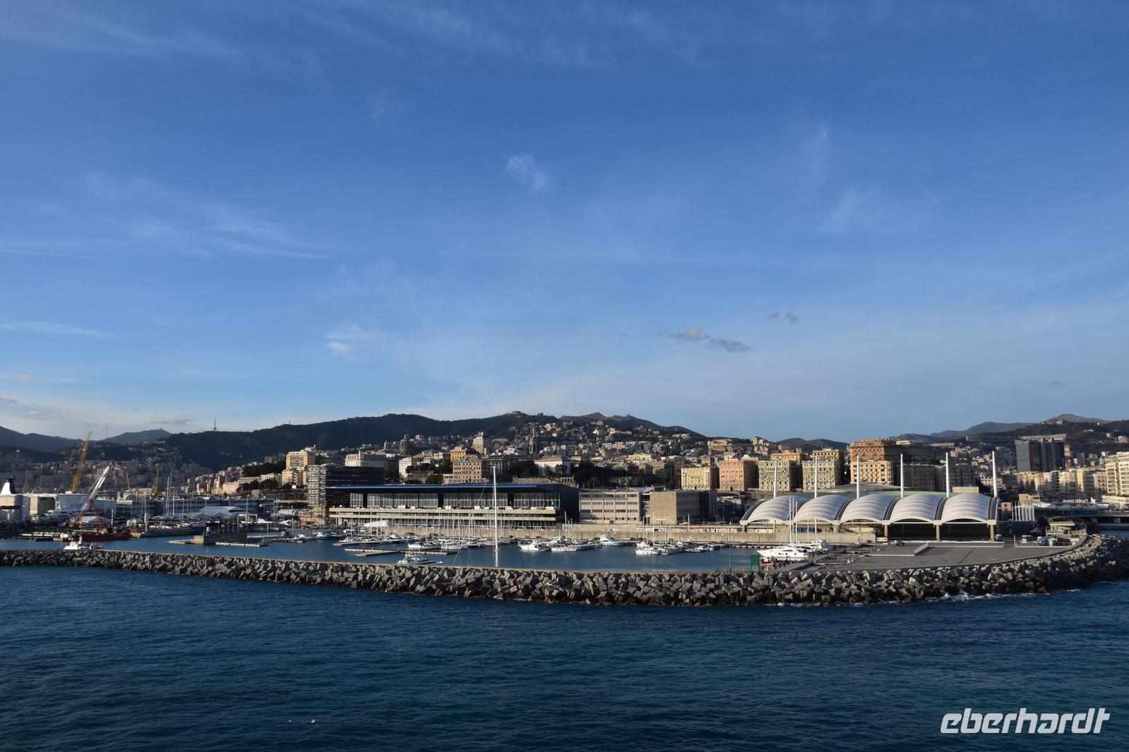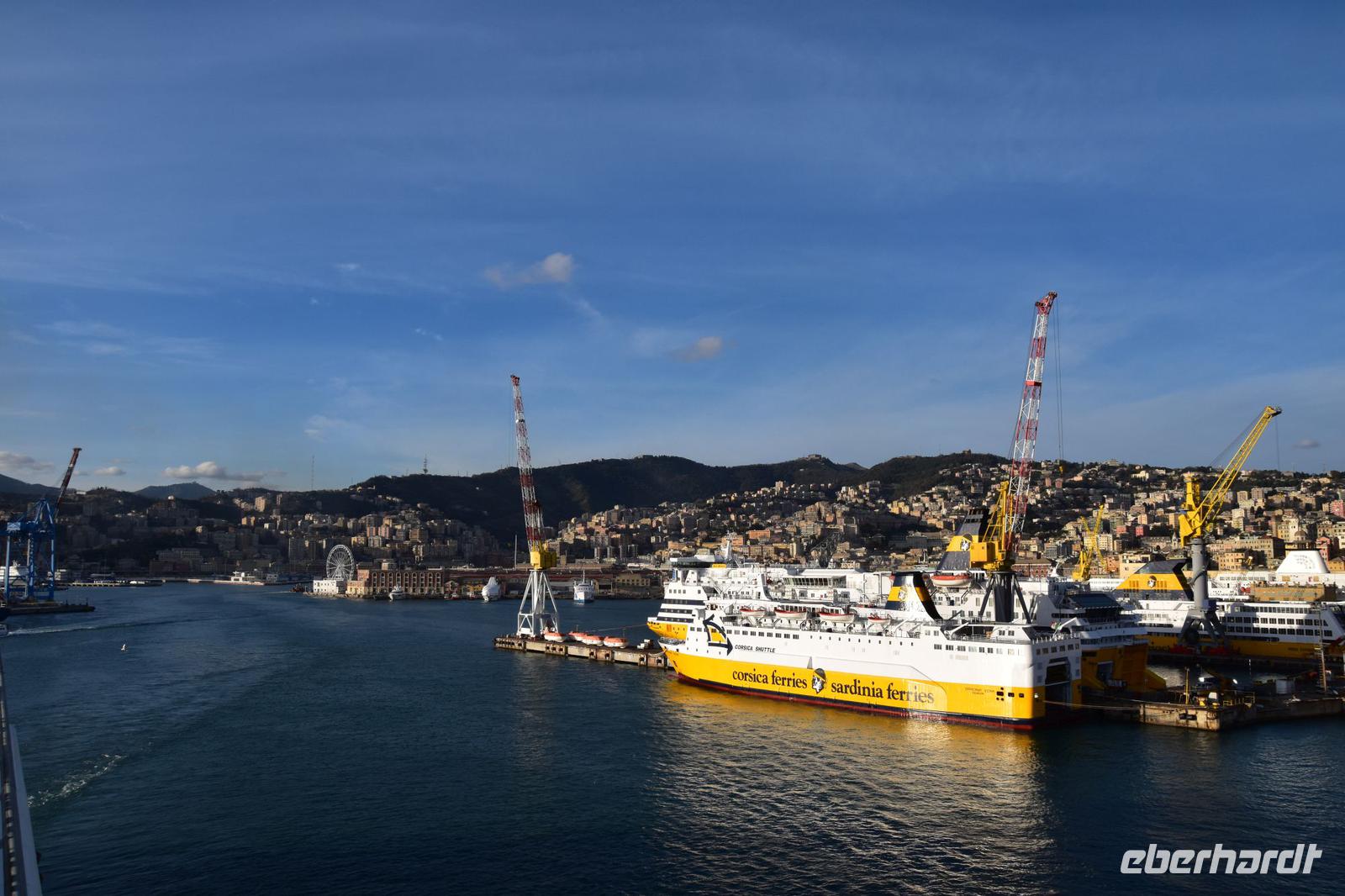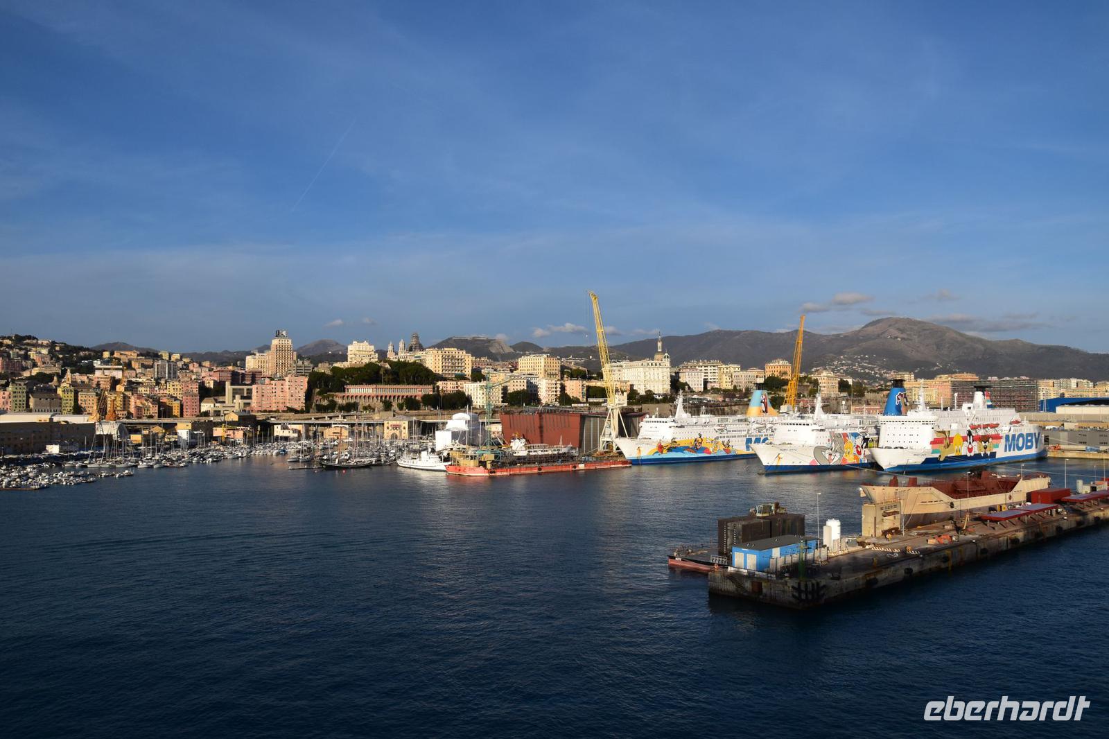 Pünktlich 17:00 Uhr erfolgt das Ablegen und die Ausfahrt aus dem Hafen von Genua