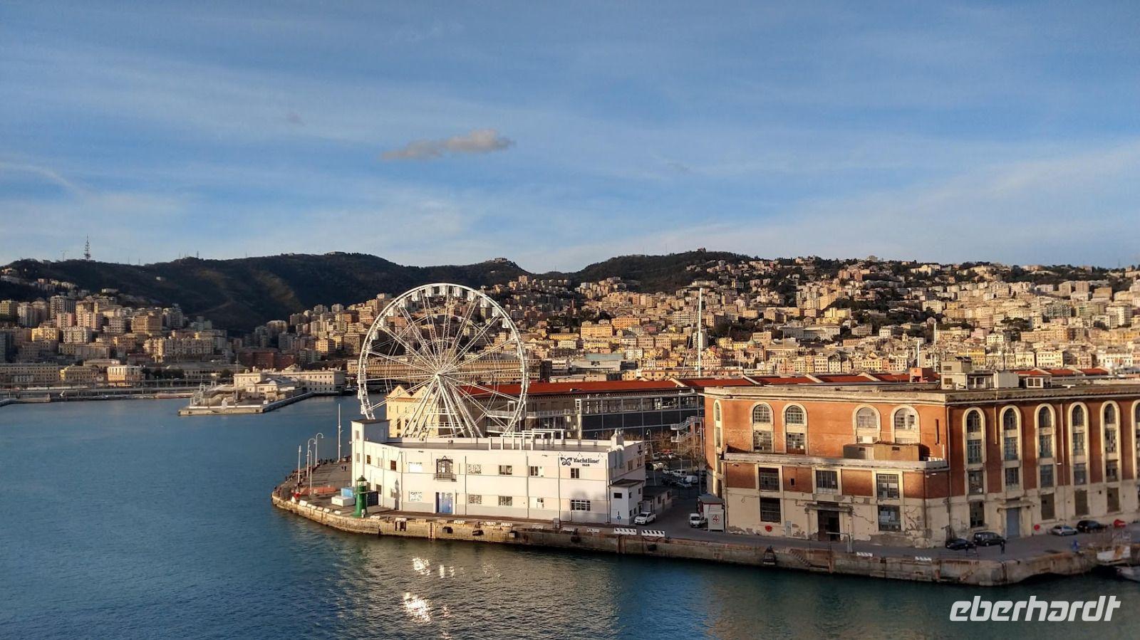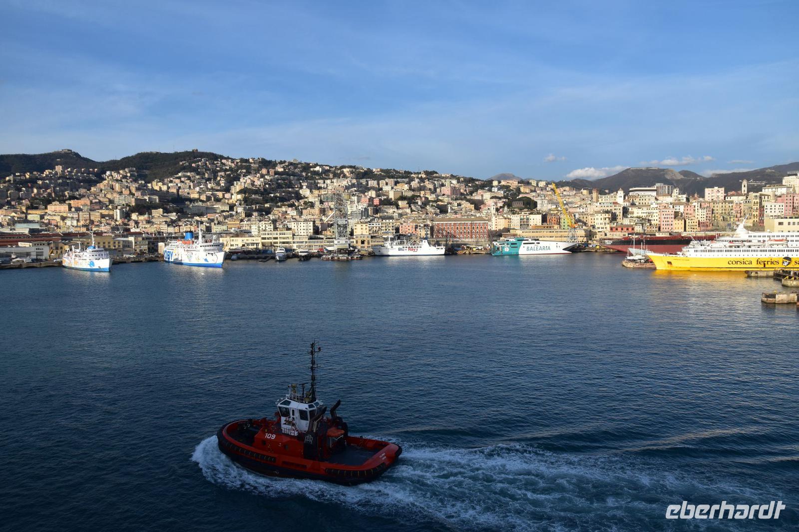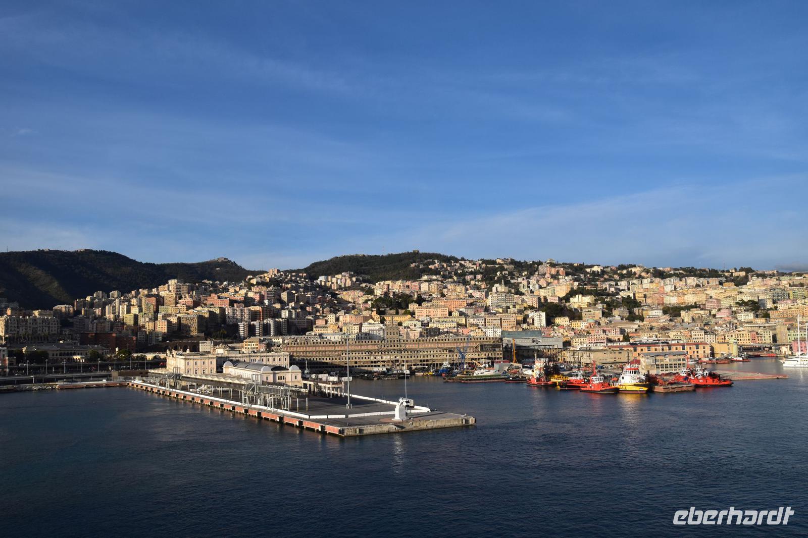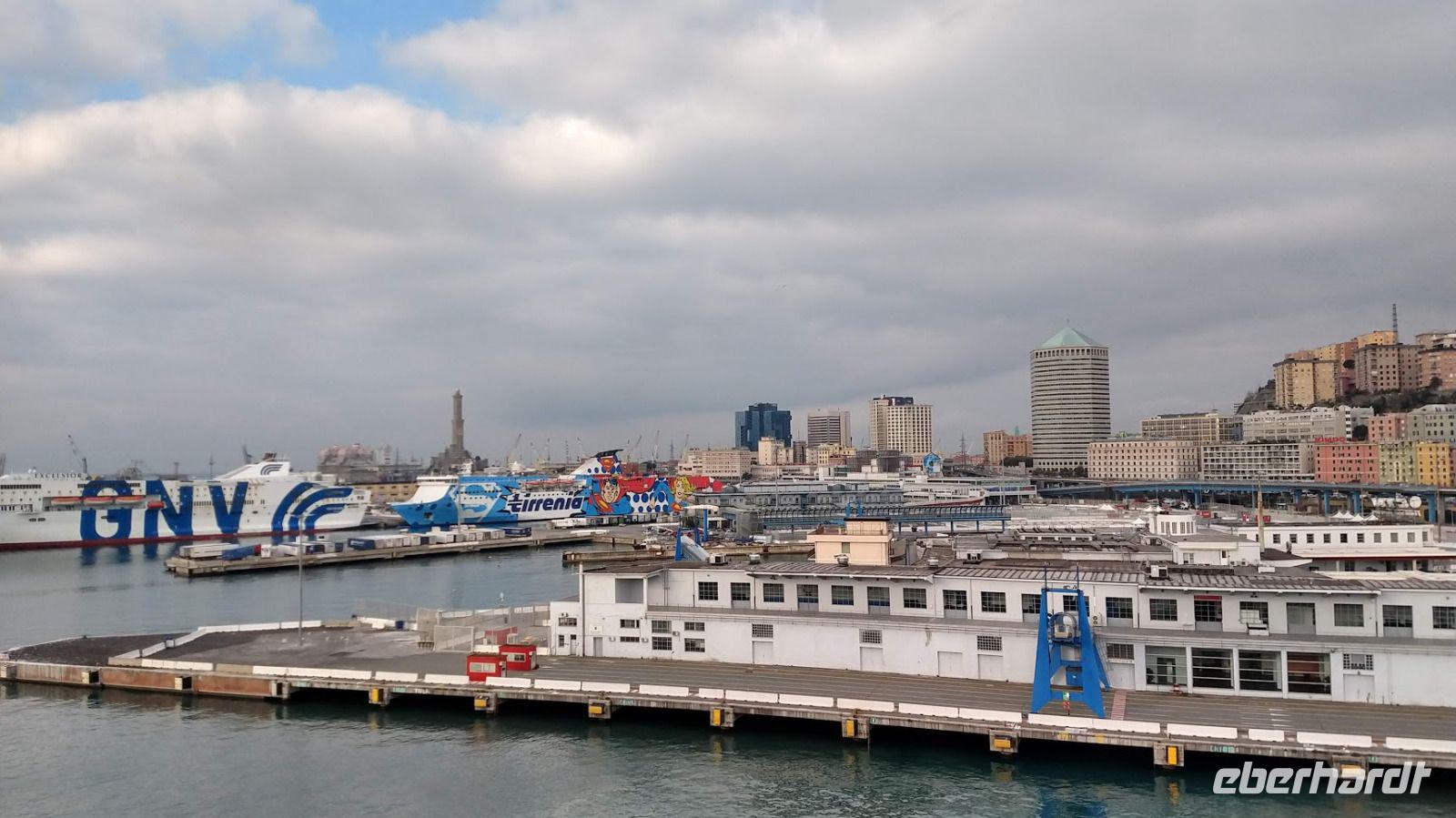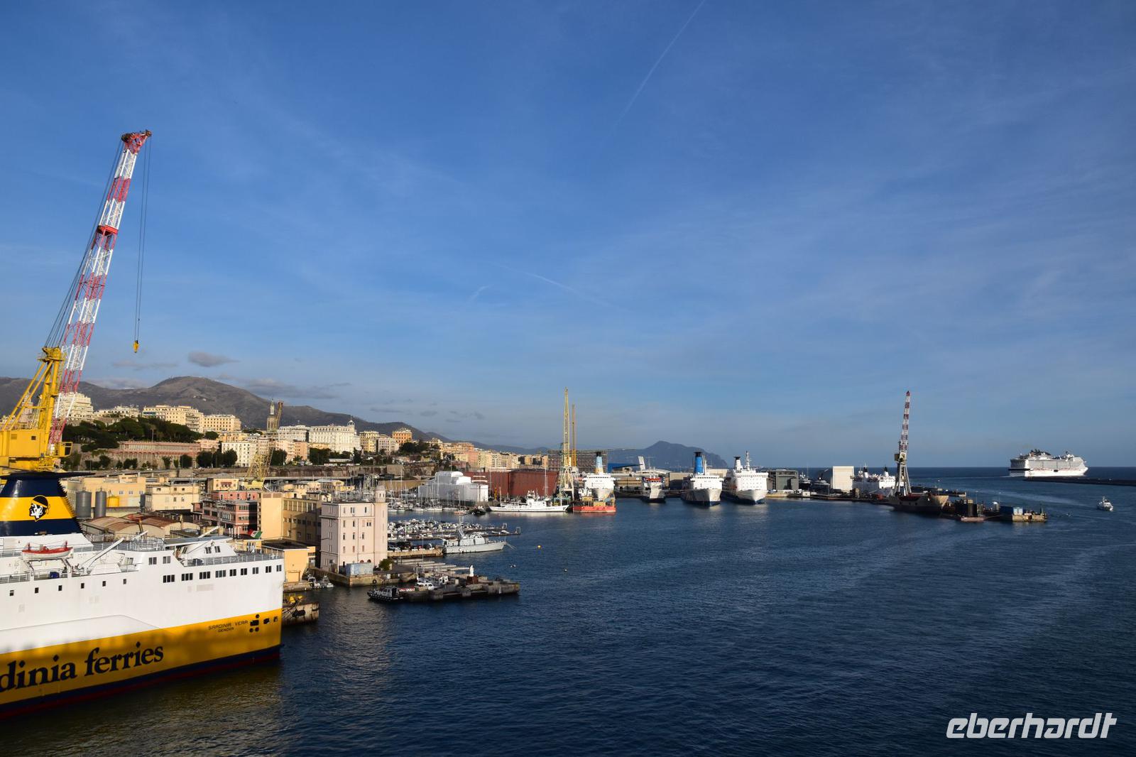 Pünktlich 17:00 Uhr erfolgt das Ablegen und die Ausfahrt aus dem Hafen von Genua