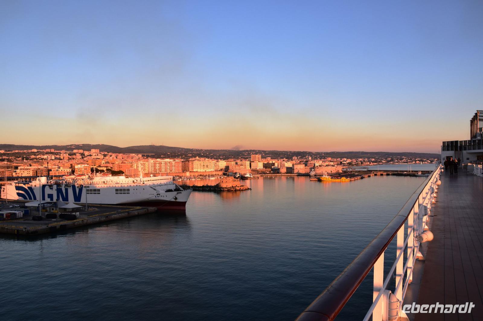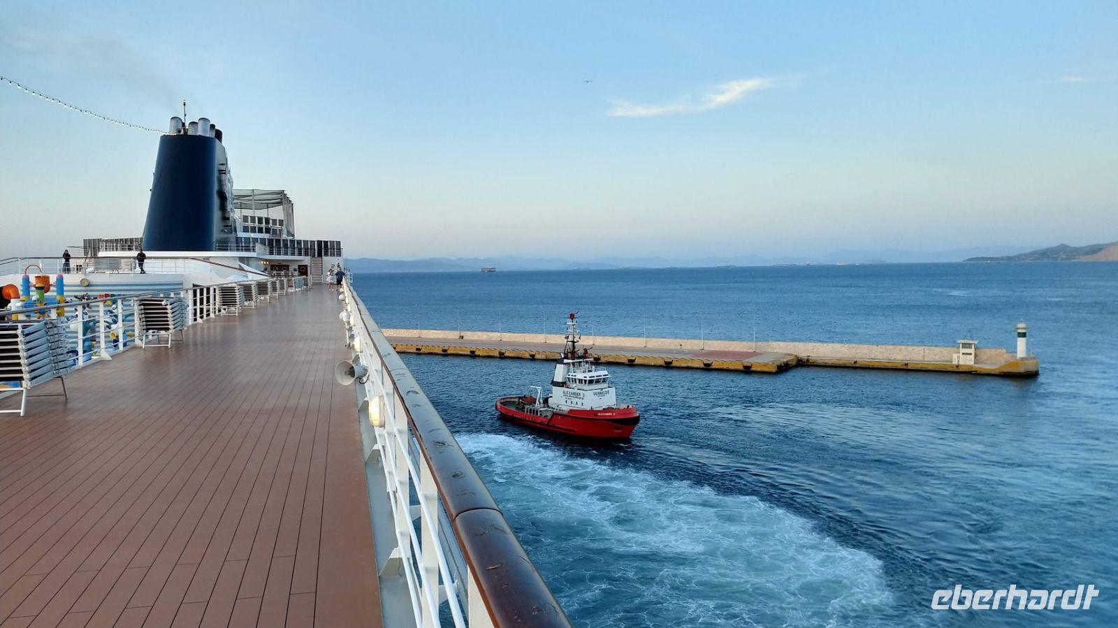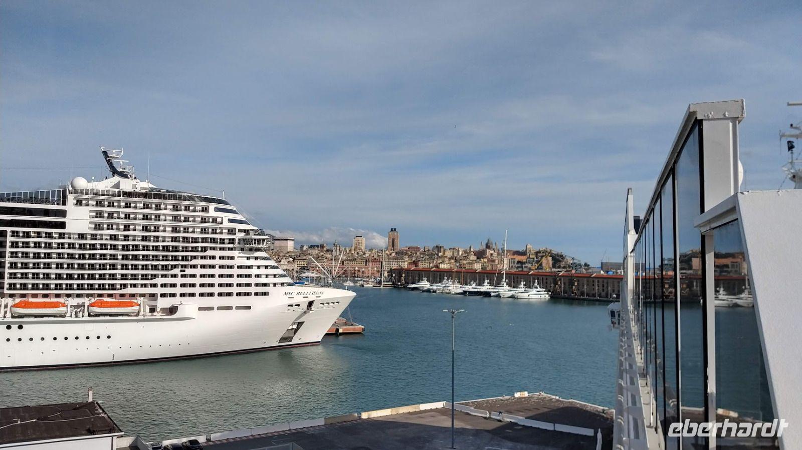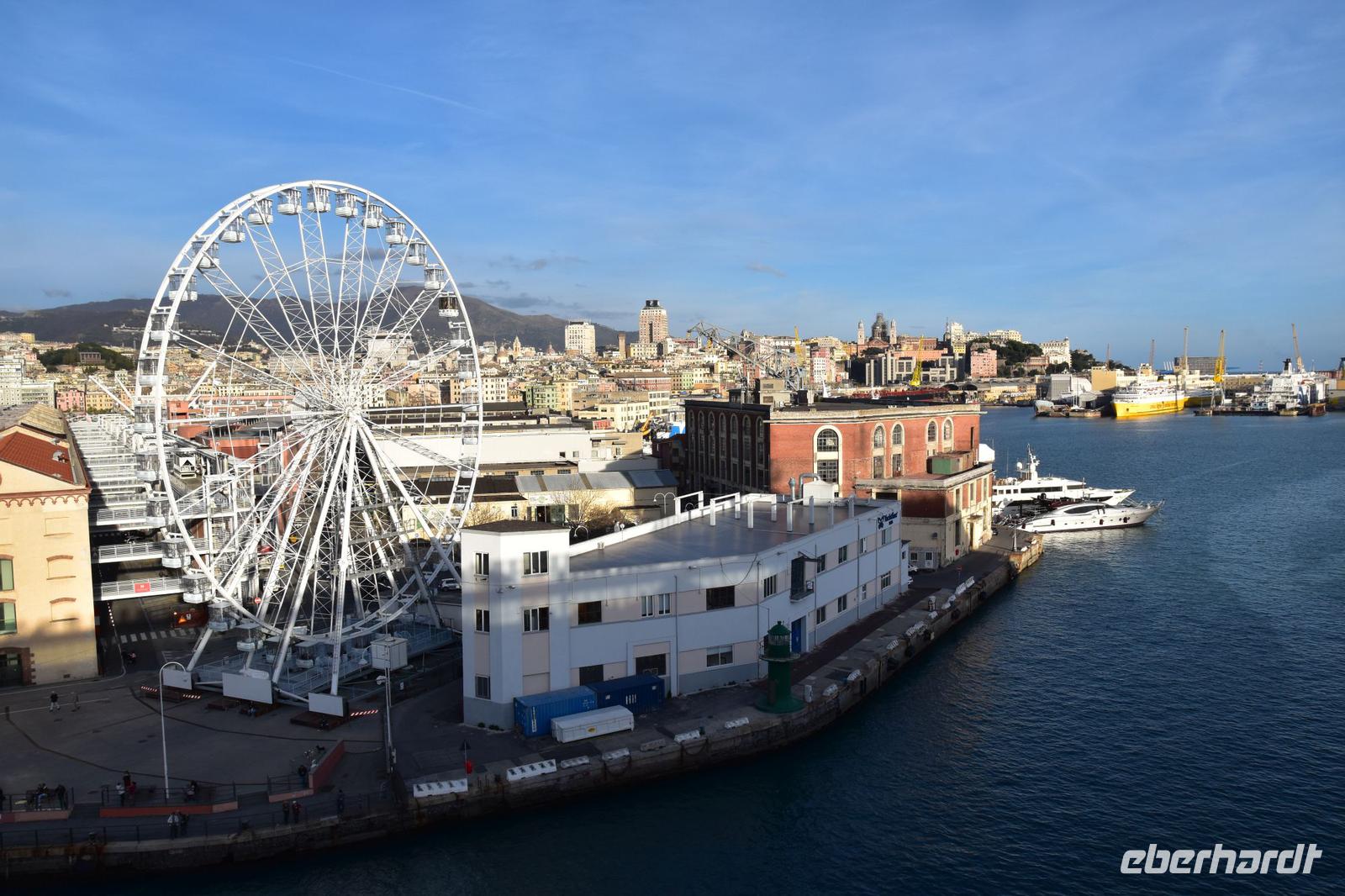 Pünktlich 17:00 Uhr erfolgt das Ablegen und die Ausfahrt aus dem Hafen von Genua