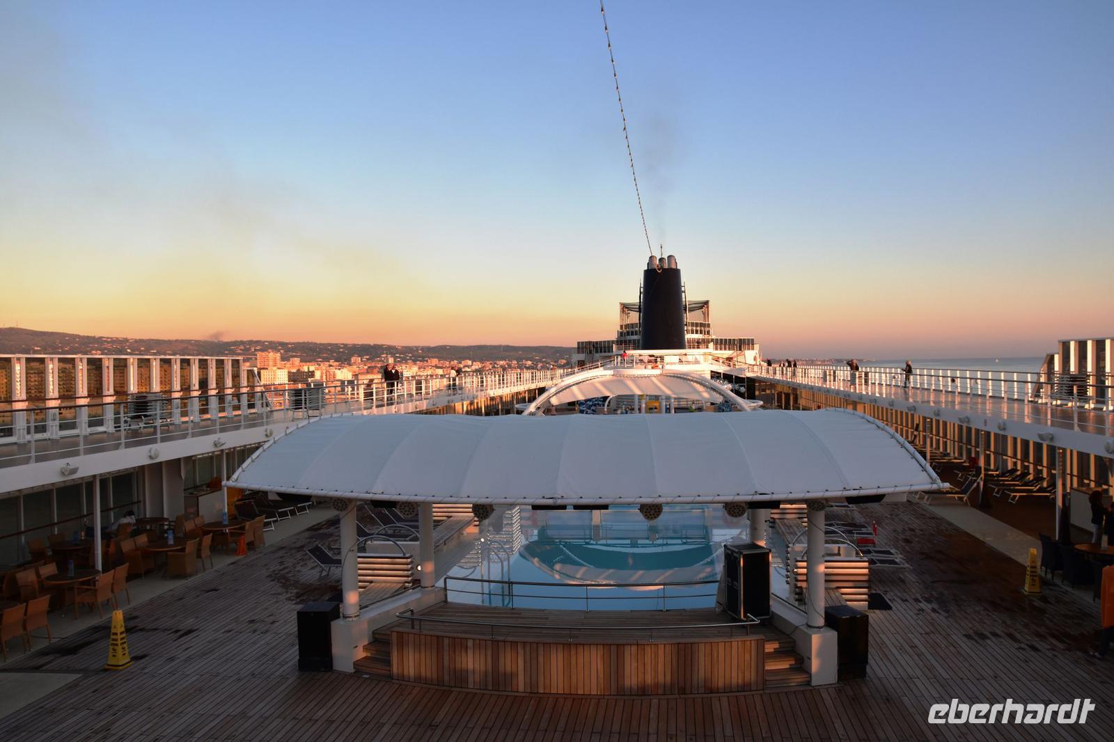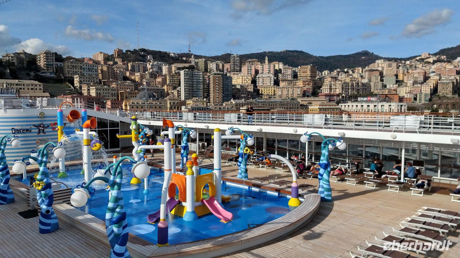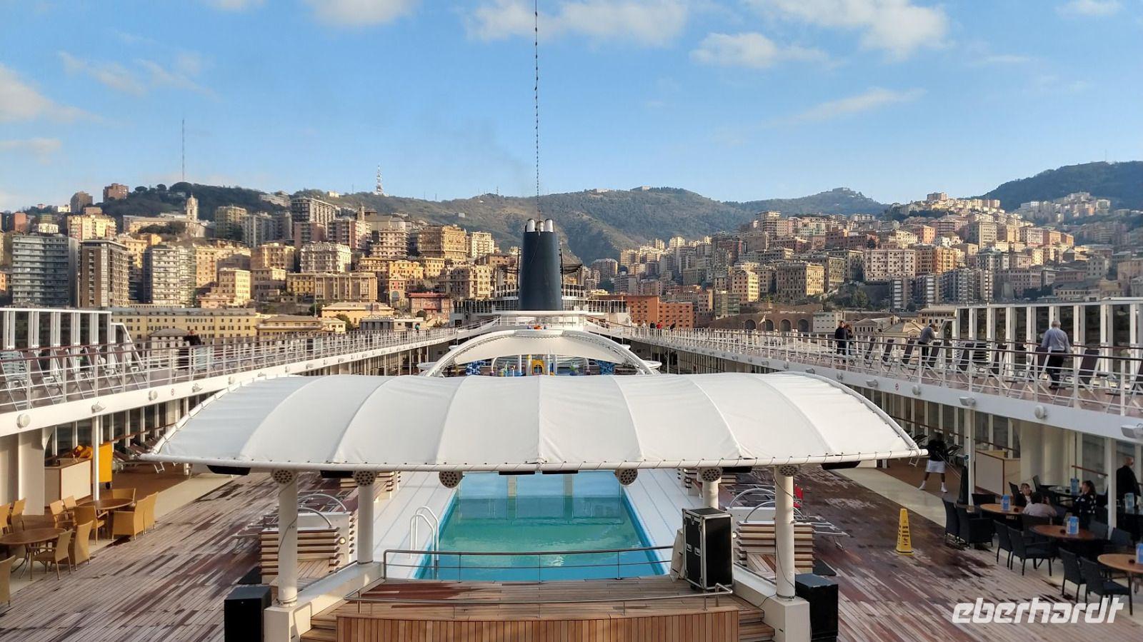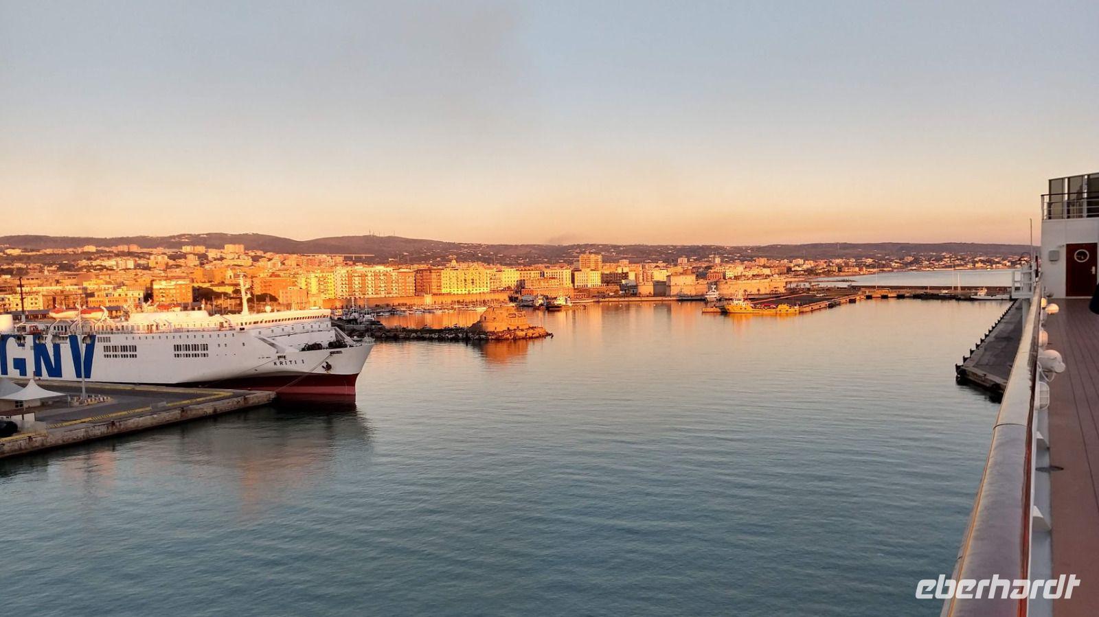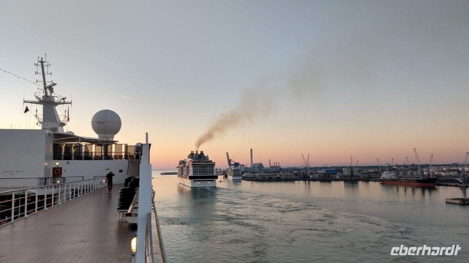 Pünktlich 17:00 Uhr erfolgt das Ablegen und die Ausfahrt aus dem Hafen von Genua
