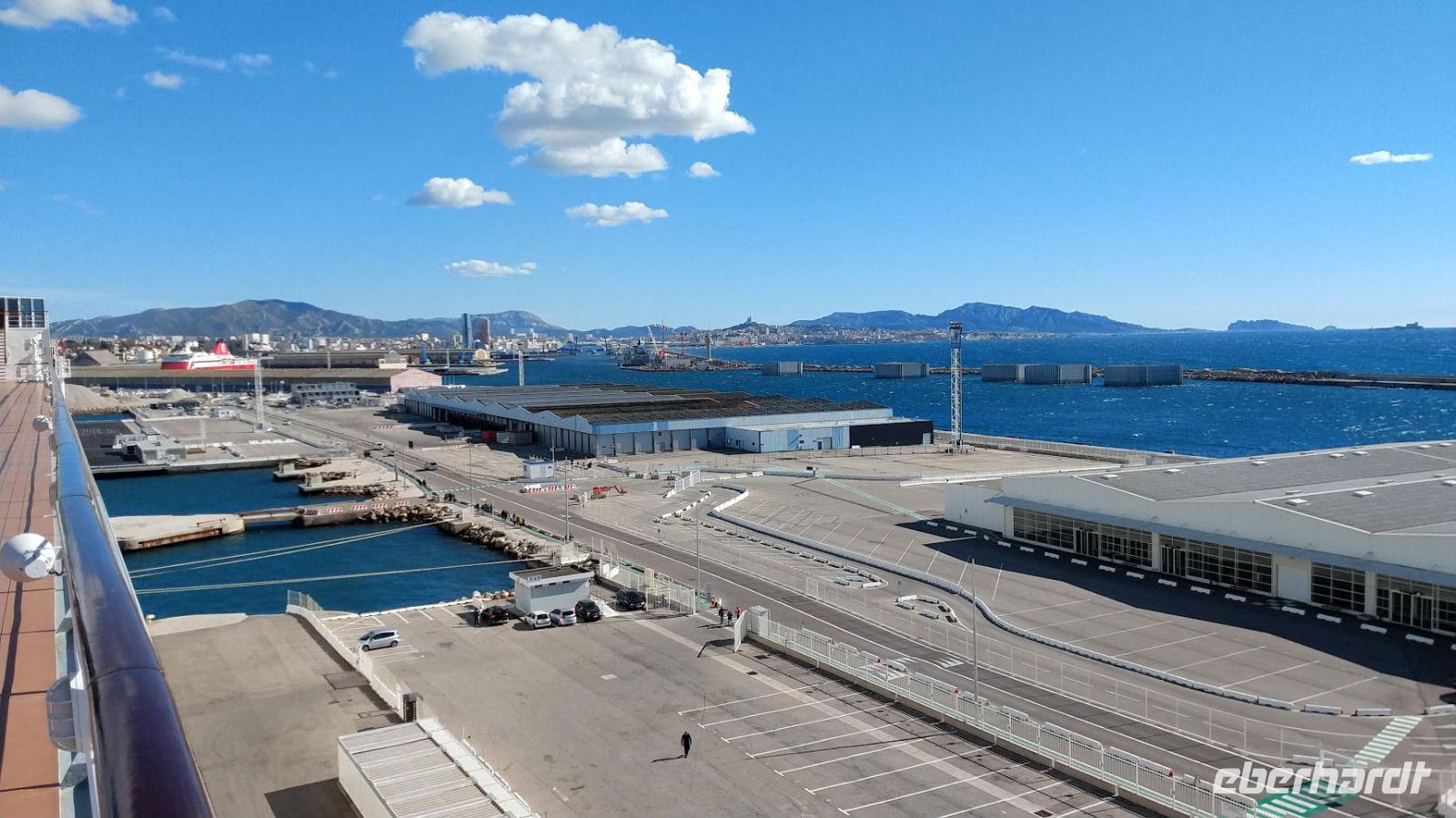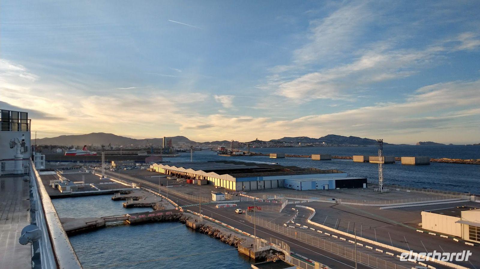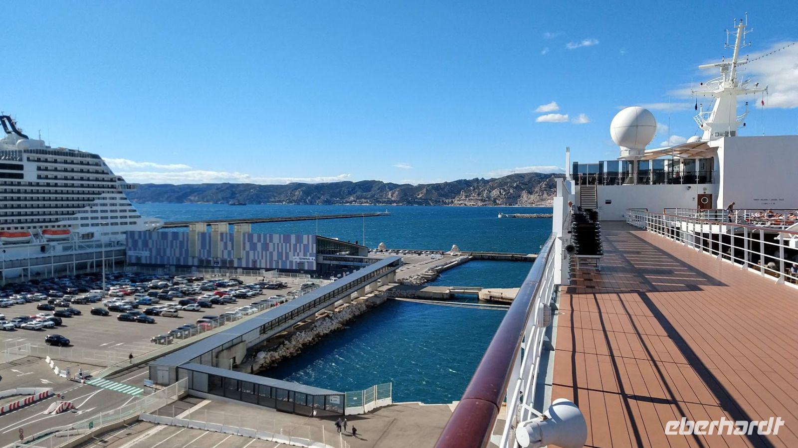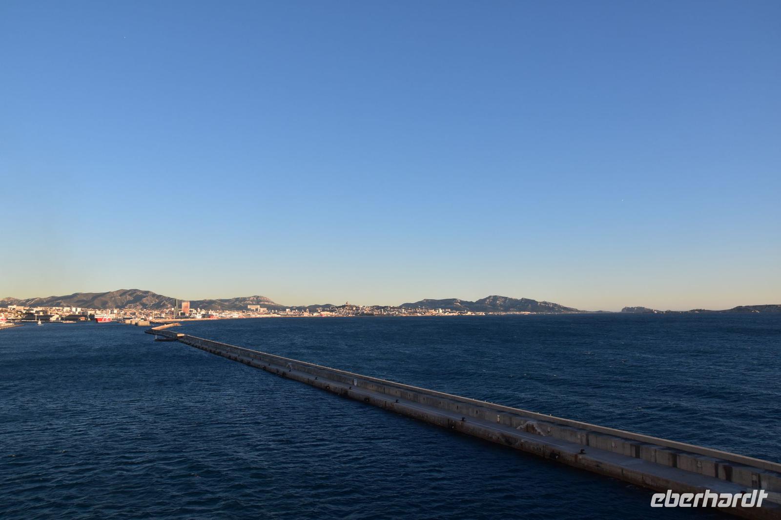 Bei ruhigem Wetter und Sonnenschein fahren wir in die weite Bucht von Marseilles ein und machen im neuen Kreuzfahrthafen fest.