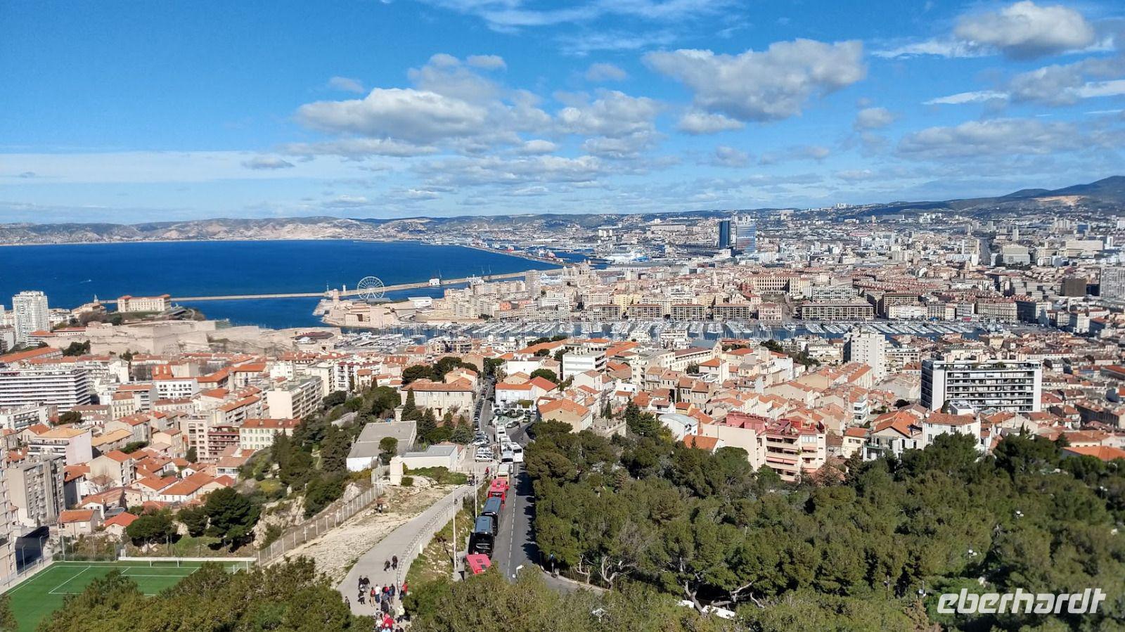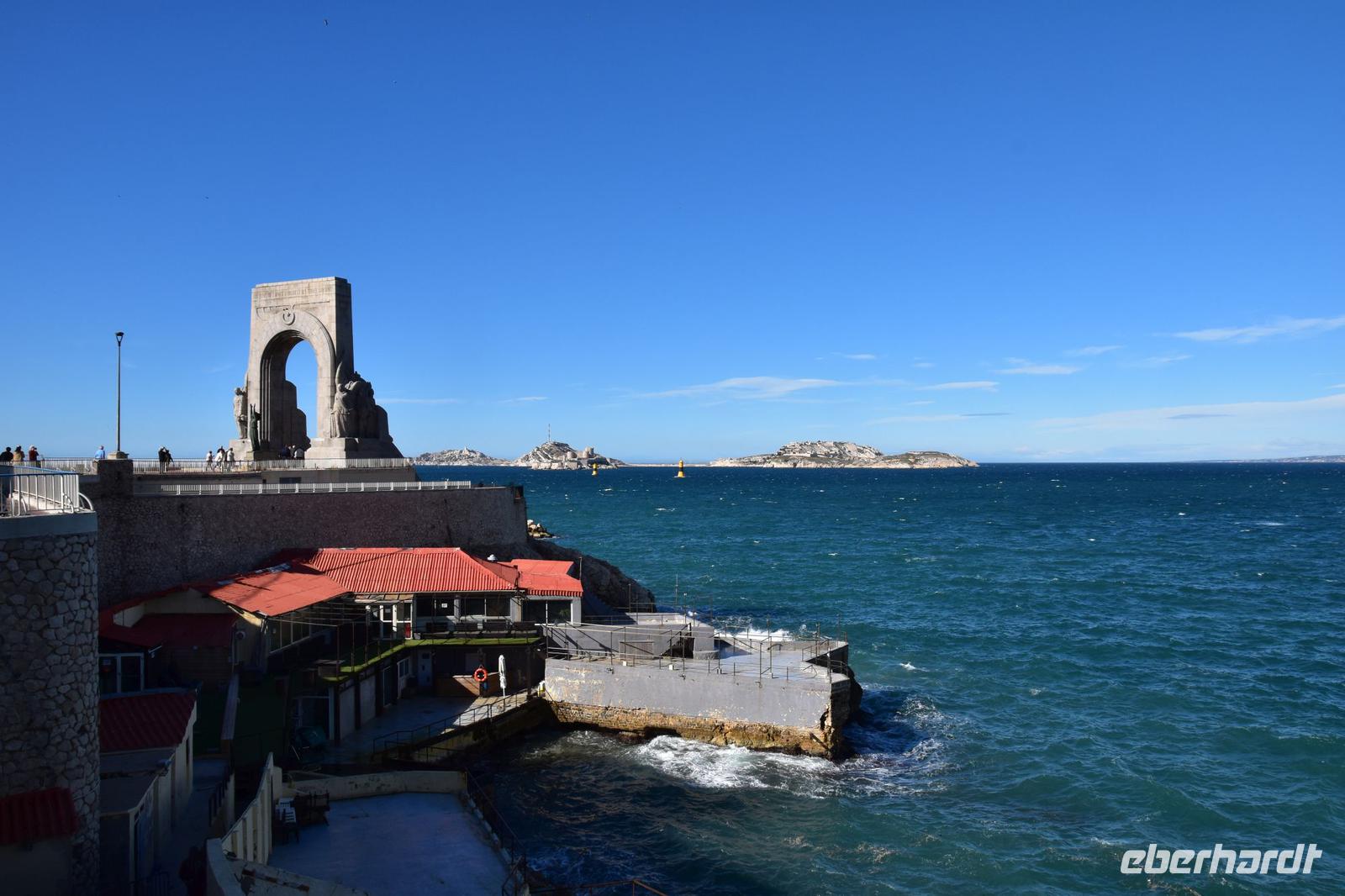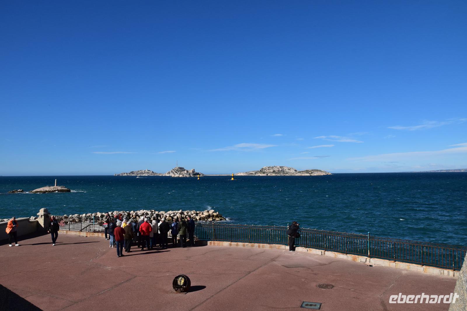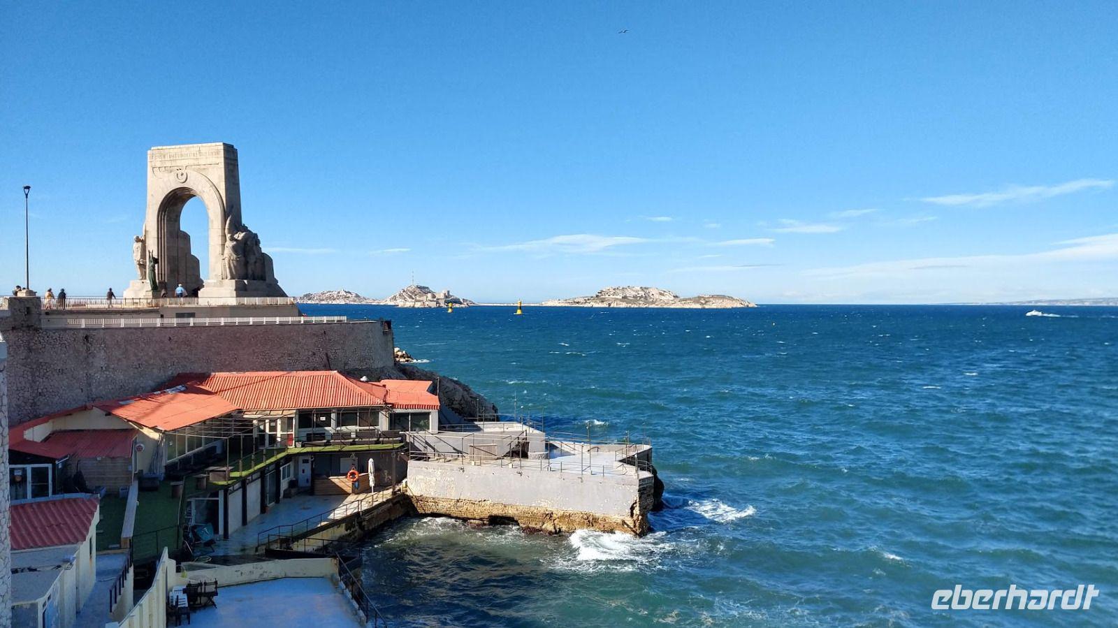 Fast alle unternehmen heute die Marseille-City Tour - eine Stadtrundfahrt ins Zentrum der zweitgrößten Stadt Frankreichs, vorbei am Porte d'Aix, am Hauptbahnhof mit Eiffels Treppe zum sehenswerten Palais Longchamp, der Wasserkunst, und unserer ersten Station. Weiter geht es in die Altstadt und zum Altstadthafen, den wir in dichtem Verkehrsaufkommen stockend umfahren, bis wir schließlich die Küstenstraße erreichen und am La porte de L'orient aussteigen. Hier genießen wir den herrlichen Blick auf die Stadt und die Inseln davor, vor allem die mit dem berühmten Chateau d'If.