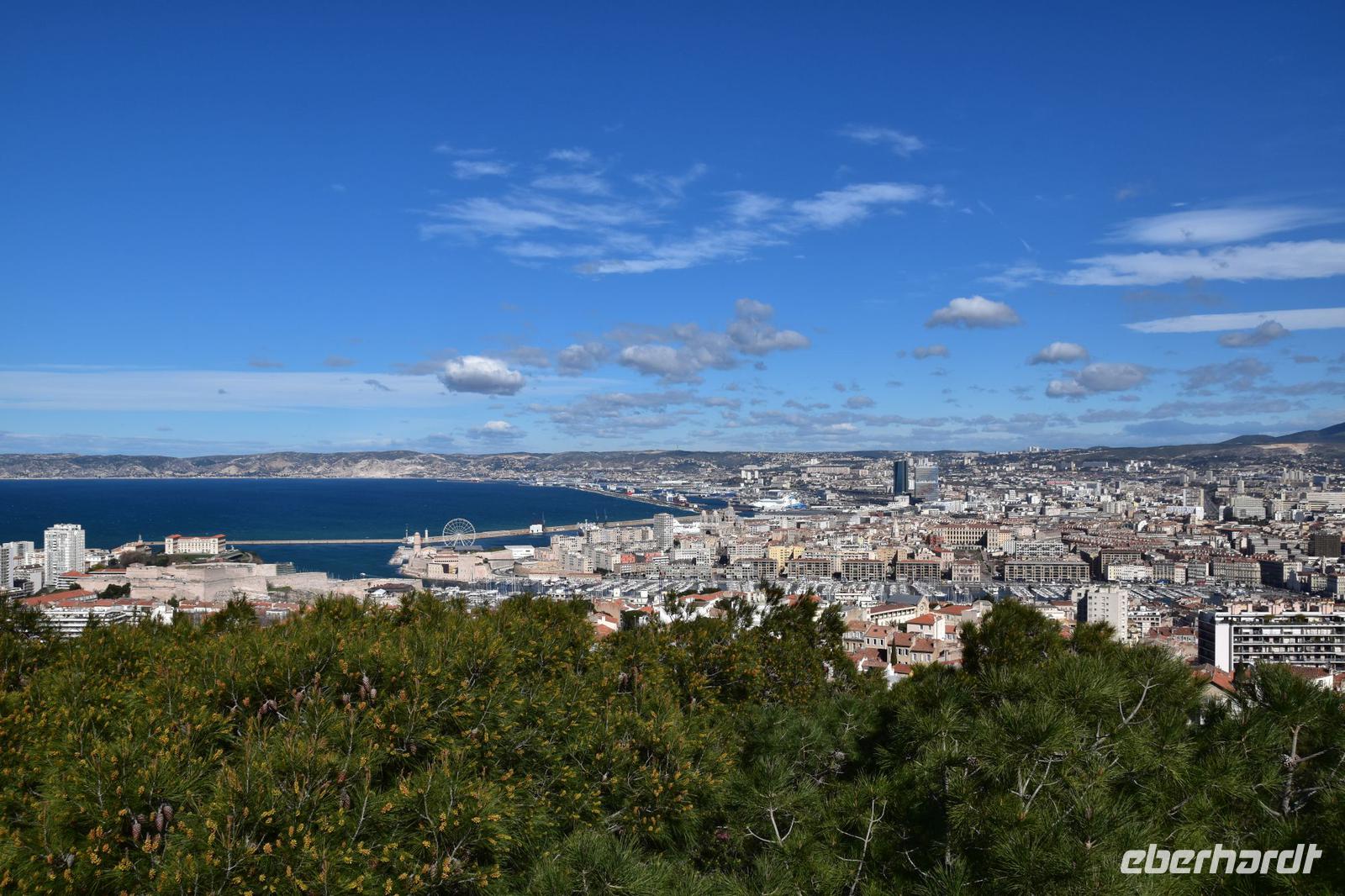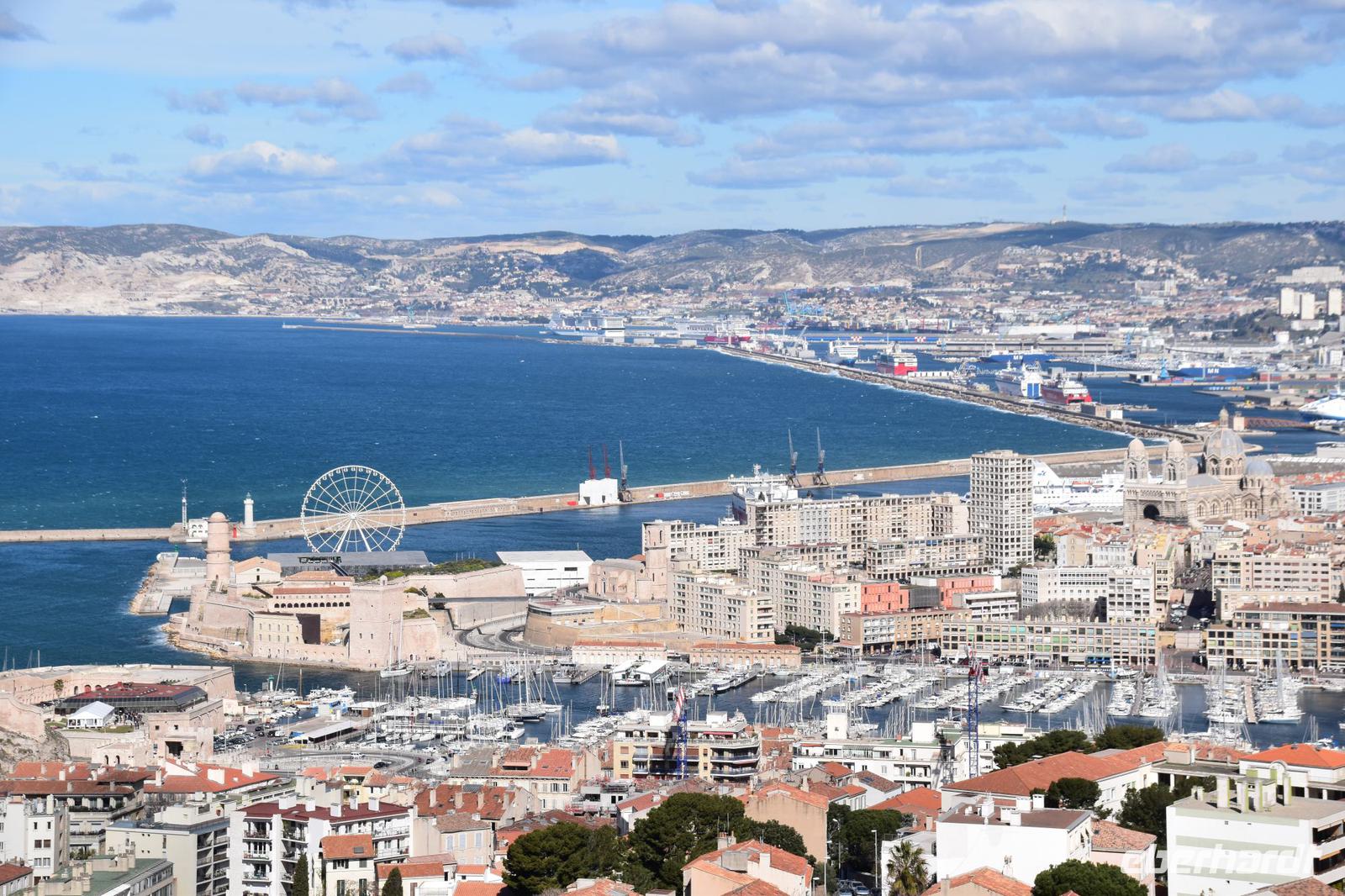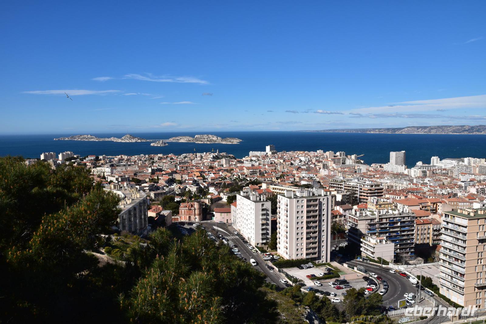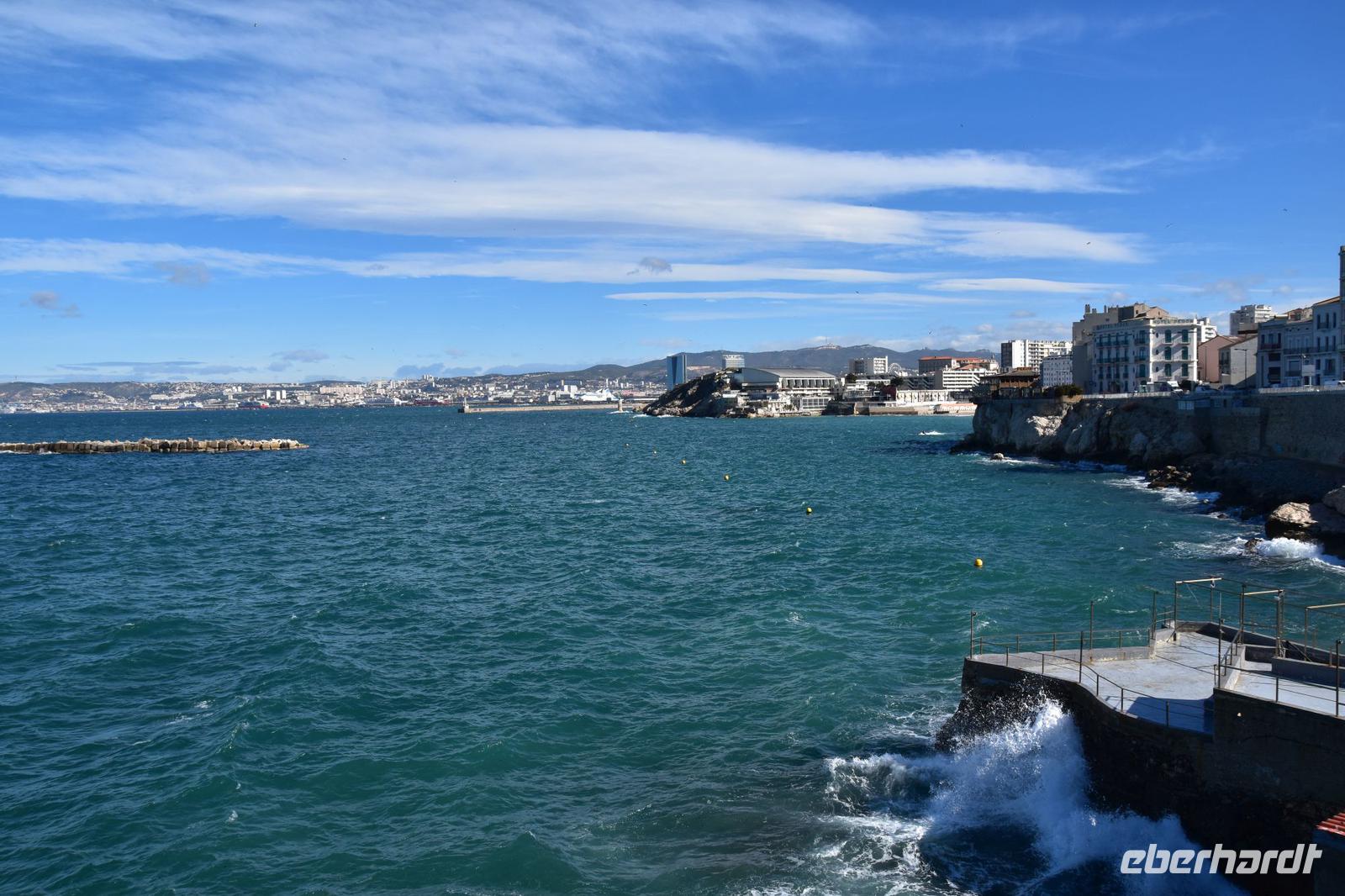 Fast alle unternehmen heute die Marseille-City Tour - eine Stadtrundfahrt ins Zentrum der zweitgrößten Stadt Frankreichs, vorbei am Porte d'Aix, am Hauptbahnhof mit Eiffels Treppe zum sehenswerten Palais Longchamp, der Wasserkunst, und unserer ersten Station. Weiter geht es in die Altstadt und zum Altstadthafen, den wir in dichtem Verkehrsaufkommen stockend umfahren, bis wir schließlich die Küstenstraße erreichen und am La porte de L'orient aussteigen. Hier genießen wir den herrlichen Blick auf die Stadt und die Inseln davor, vor allem die mit dem berühmten Chateau d'If.