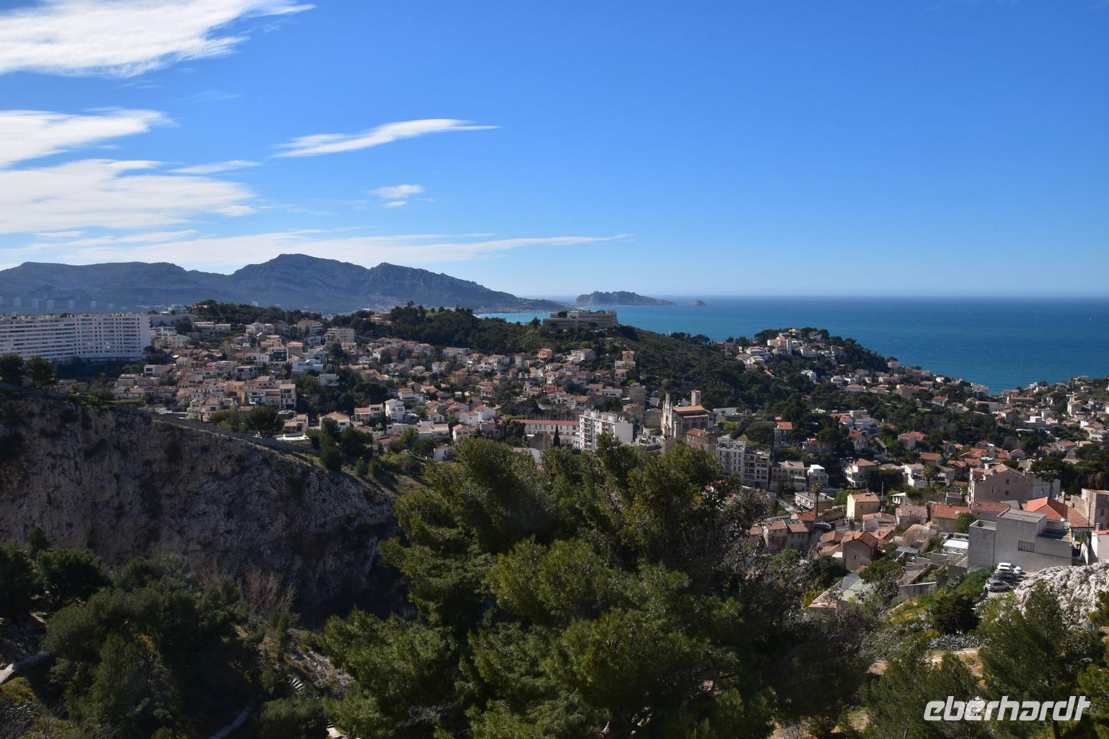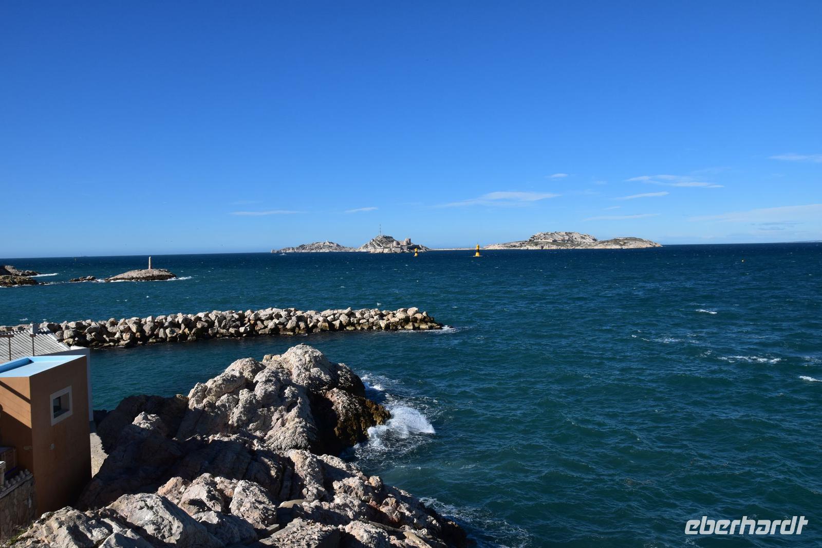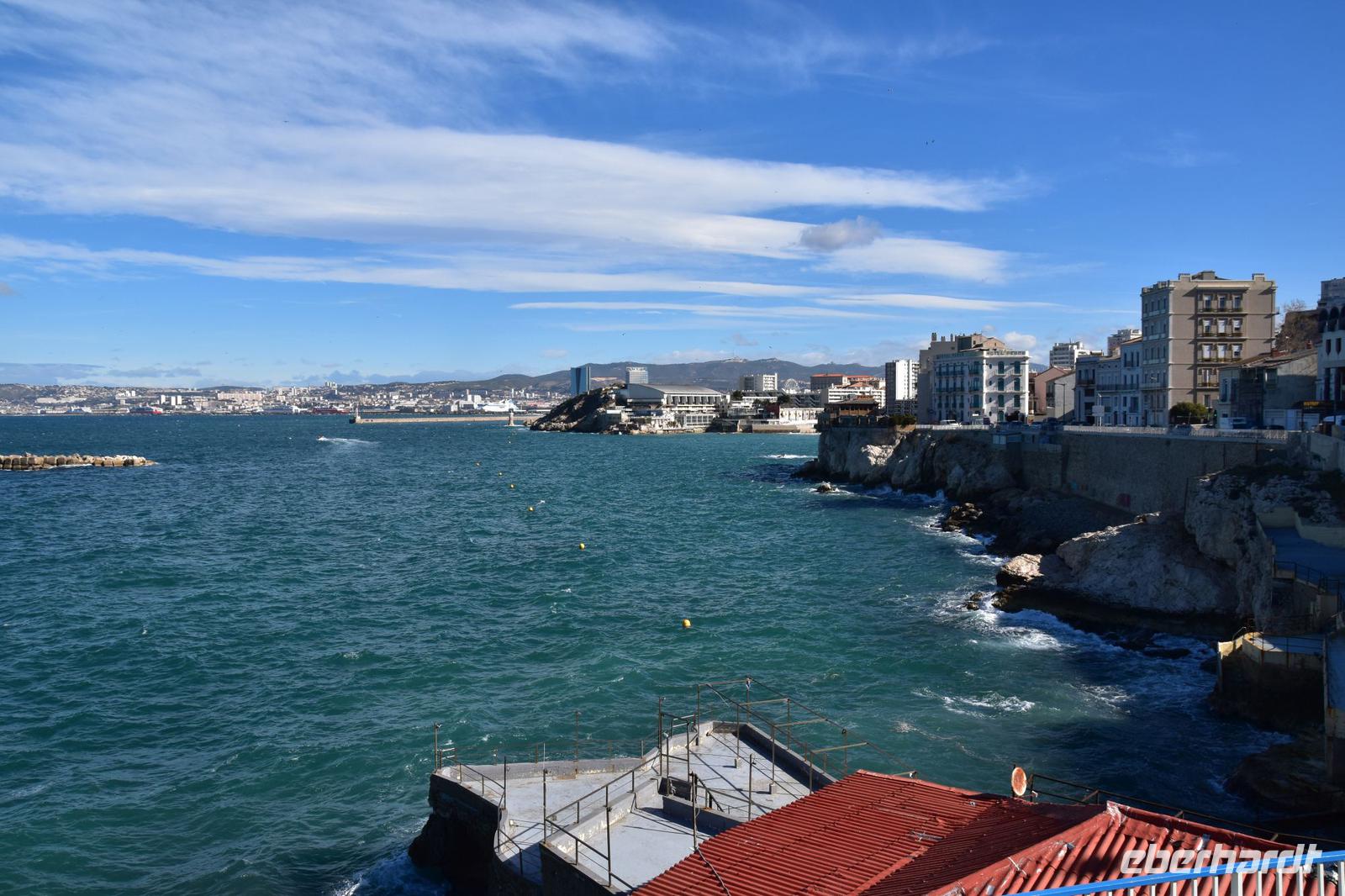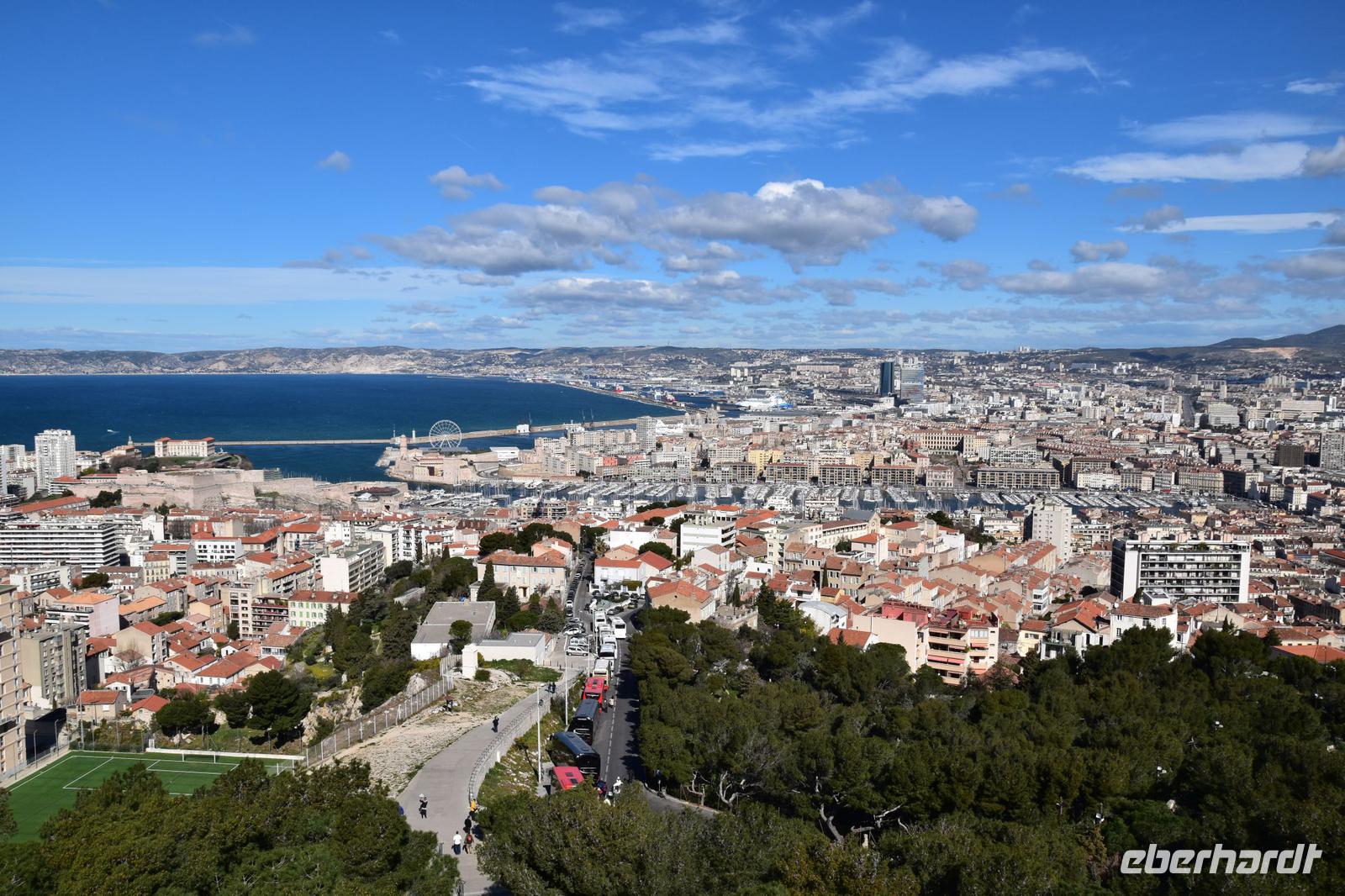 Fast alle unternehmen heute die Marseille-City Tour - eine Stadtrundfahrt ins Zentrum der zweitgrößten Stadt Frankreichs, vorbei am Porte d'Aix, am Hauptbahnhof mit Eiffels Treppe zum sehenswerten Palais Longchamp, der Wasserkunst, und unserer ersten Station. Weiter geht es in die Altstadt und zum Altstadthafen, den wir in dichtem Verkehrsaufkommen stockend umfahren, bis wir schließlich die Küstenstraße erreichen und am La porte de L'orient aussteigen. Hier genießen wir den herrlichen Blick auf die Stadt und die Inseln davor, vor allem die mit dem berühmten Chateau d'If.