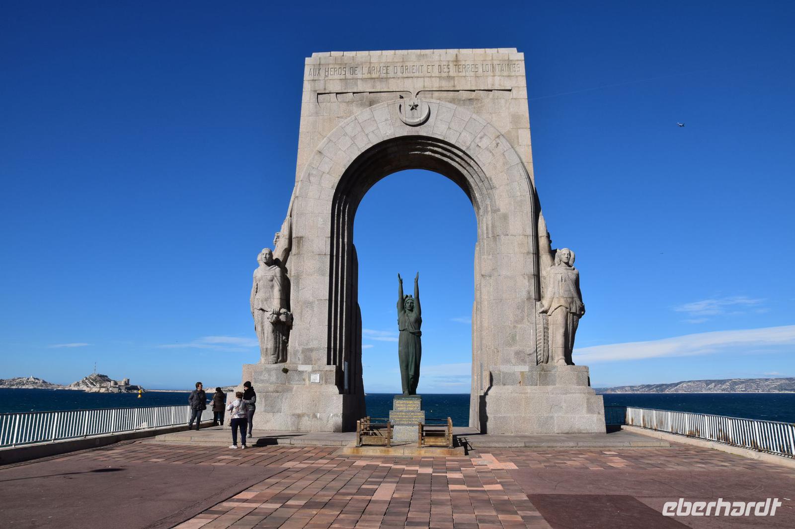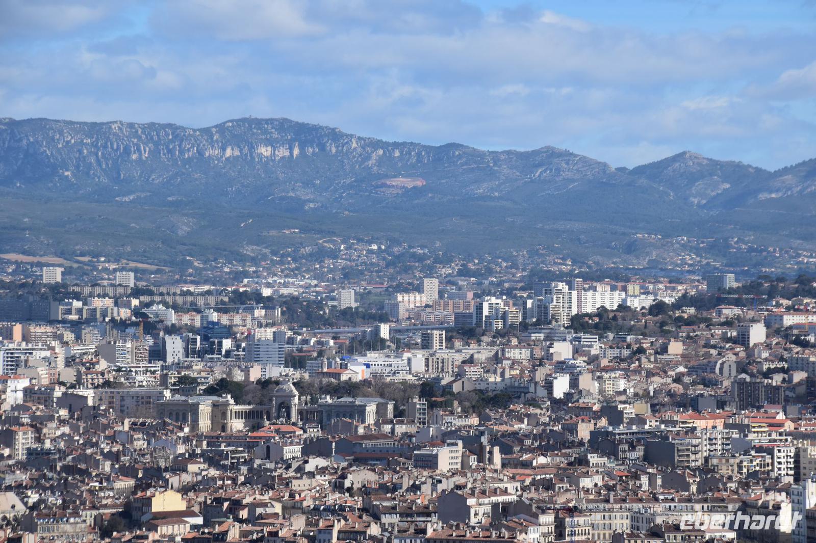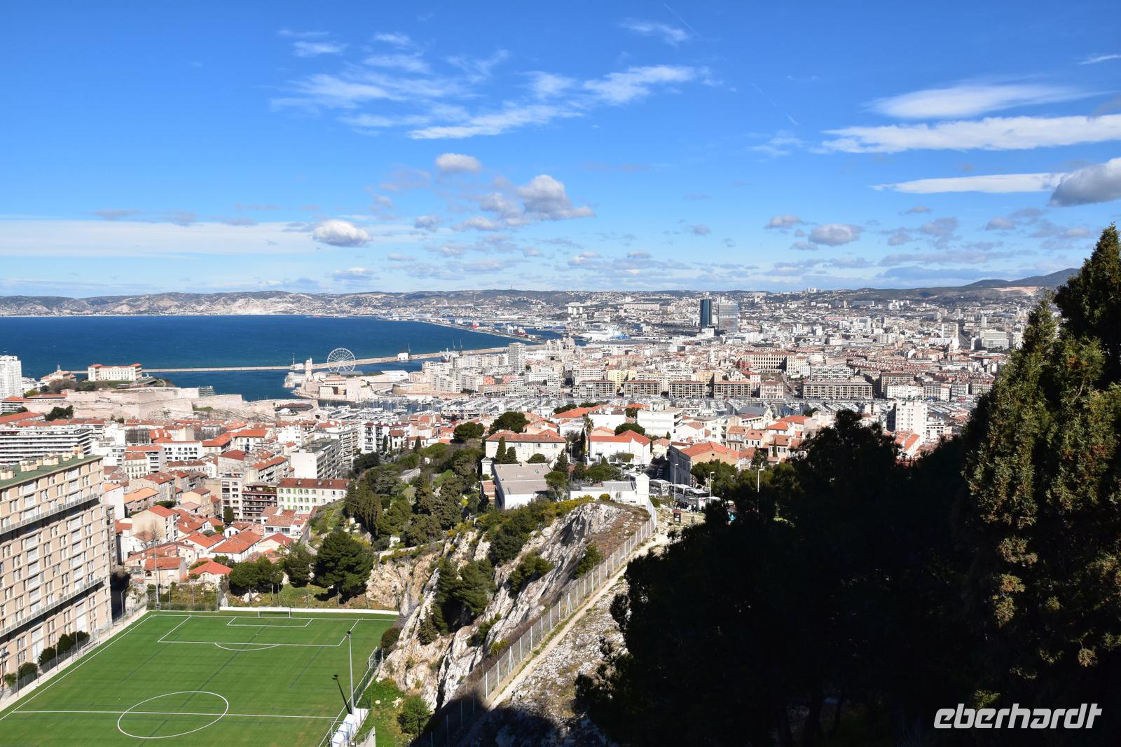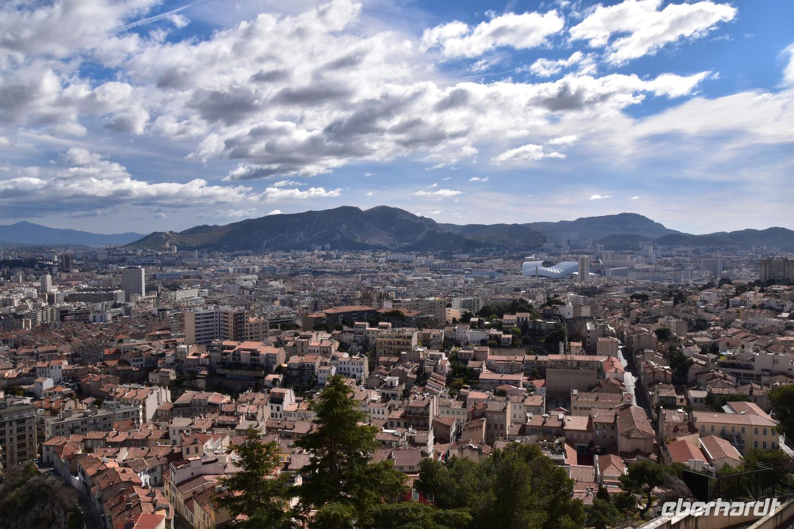Fast alle unternehmen heute die Marseille-City Tour - eine Stadtrundfahrt ins Zentrum der zweitgrößten Stadt Frankreichs, vorbei am Porte d'Aix, am Hauptbahnhof mit Eiffels Treppe zum sehenswerten Palais Longchamp, der Wasserkunst, und unserer ersten Station. Weiter geht es in die Altstadt und zum Altstadthafen, den wir in dichtem Verkehrsaufkommen stockend umfahren, bis wir schließlich die Küstenstraße erreichen und am La porte de L'orient aussteigen. Hier genießen wir den herrlichen Blick auf die Stadt und die Inseln davor, vor allem die mit dem berühmten Chateau d'If.