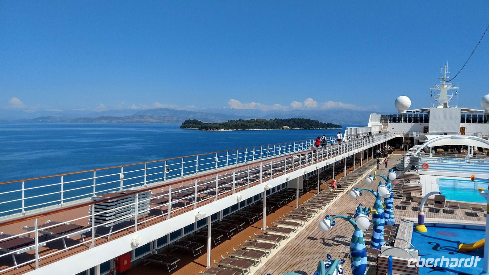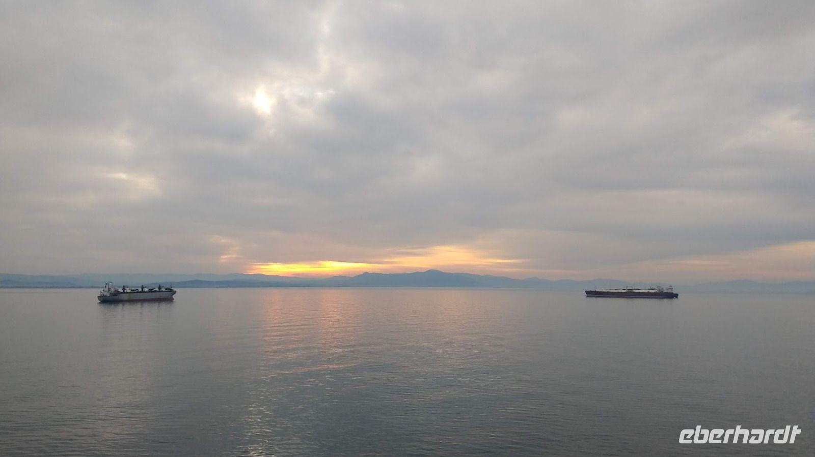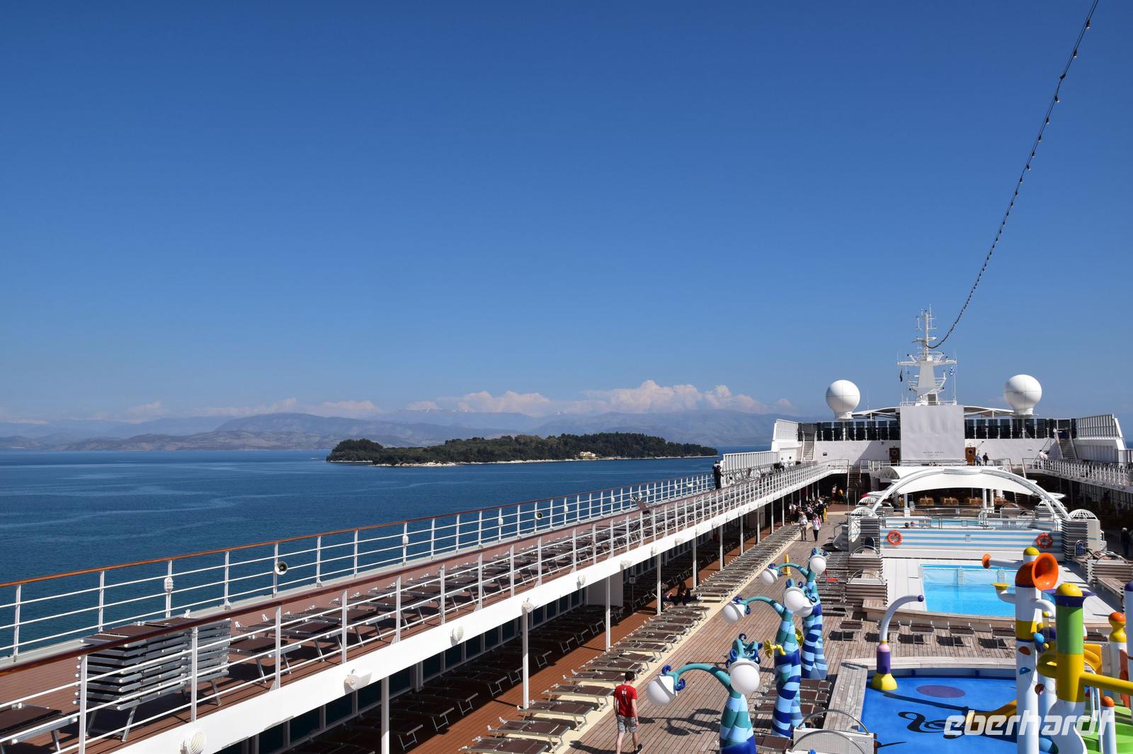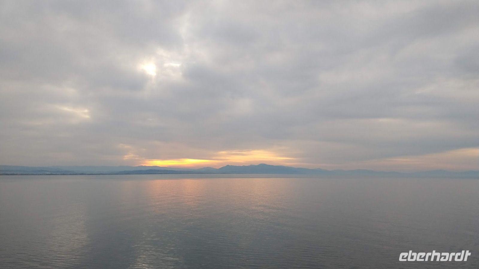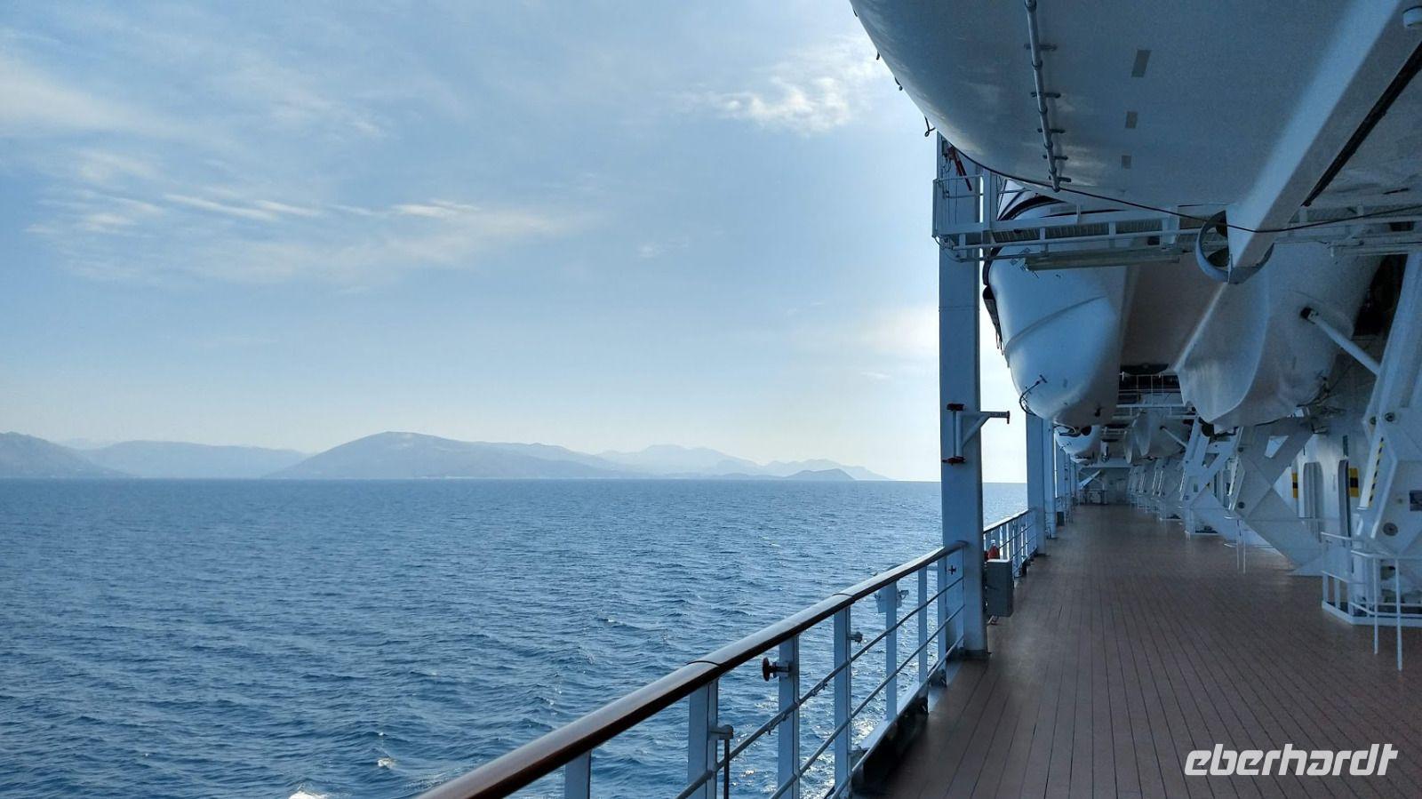Im Laufe des Vormittages erreichen wir die Ionischen Inseln und somit den Nordwesten Griechenlands. Die 2000er der griechischen und albanischen Gebirge leuchten mit ihren Schneekappen am Horizont.