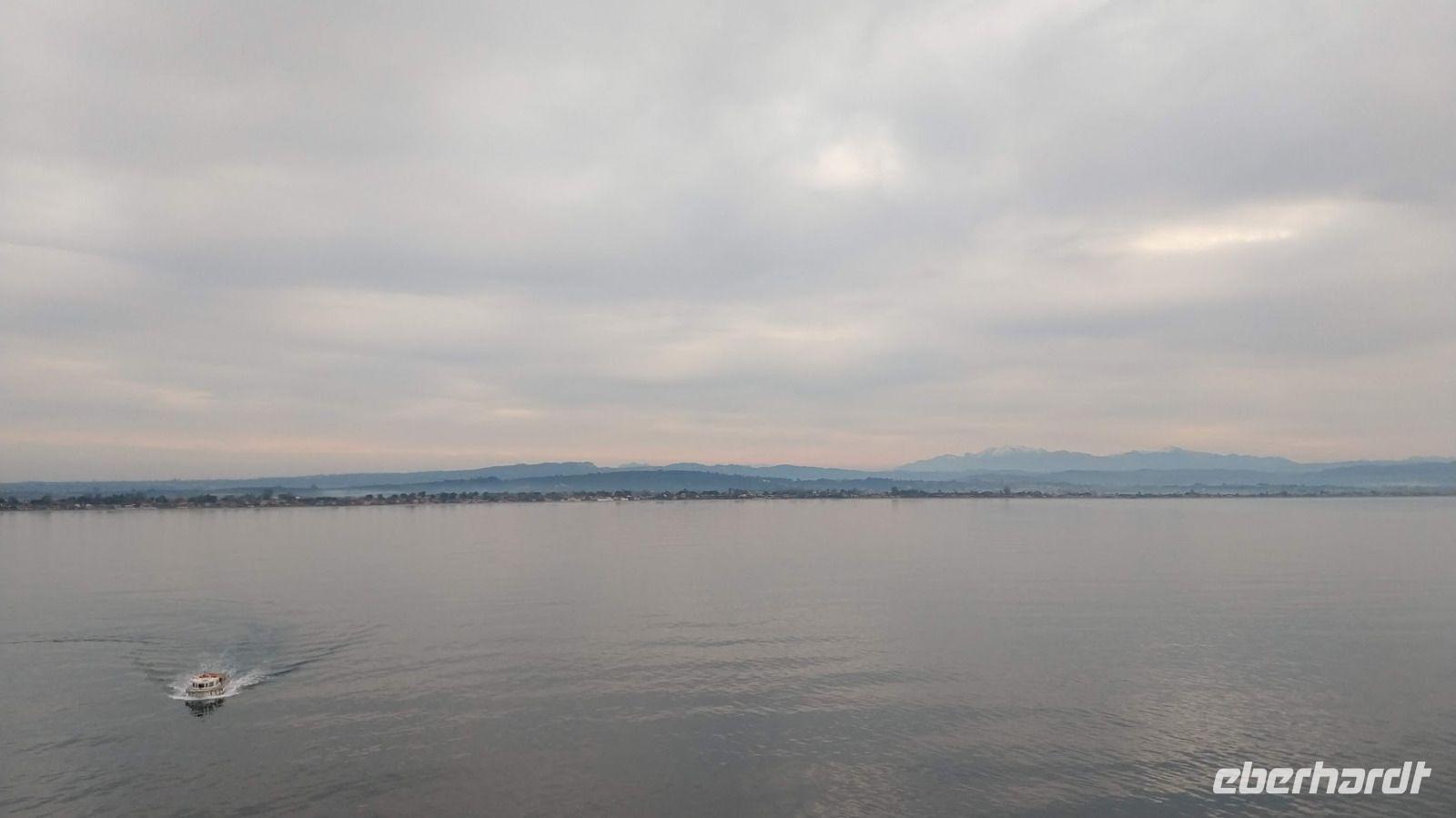Als wir am Nachmittag auslaufen, grüßen die schneebedeckten Berge noch einmal herüber.