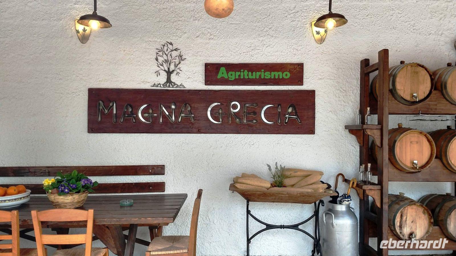 Den zweiten Teil unseres Ausfluges bildet der Besuch der Farm Magna Grecia, mit deftigen griechischen Leckereien, sehr gutem Wein, sehr guten Olivenöl und auch handwerklicher Schmuck der italienischen Besitzerin.