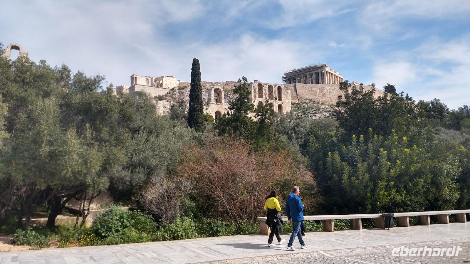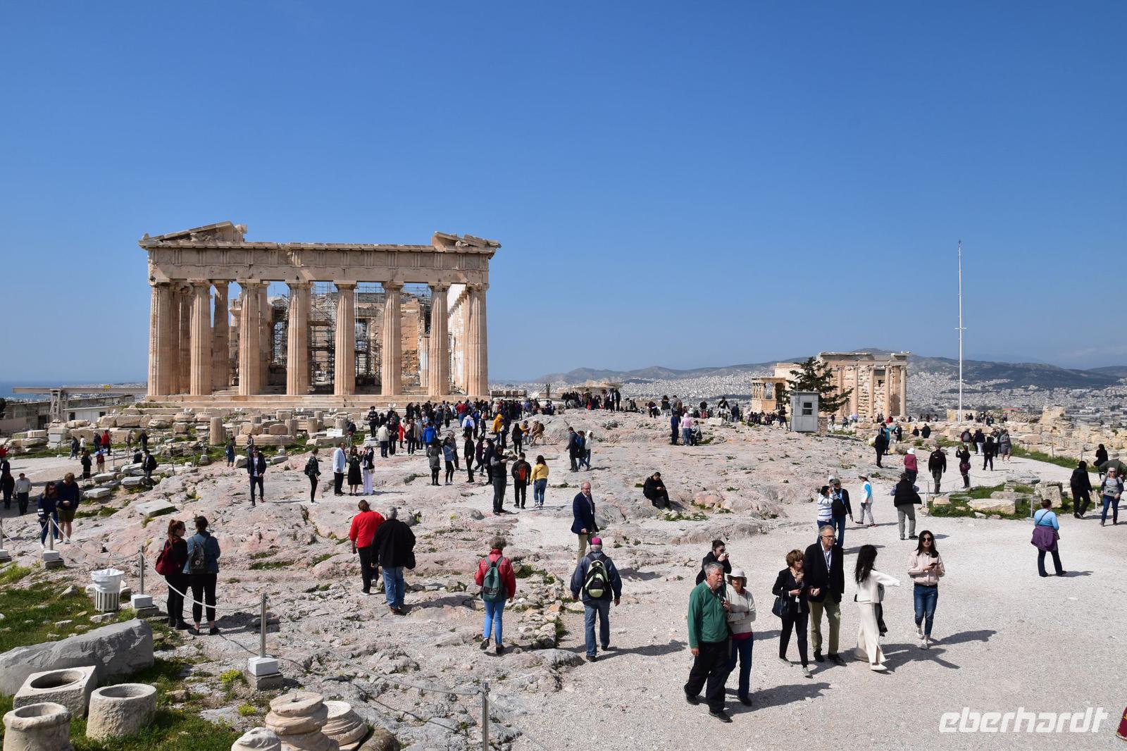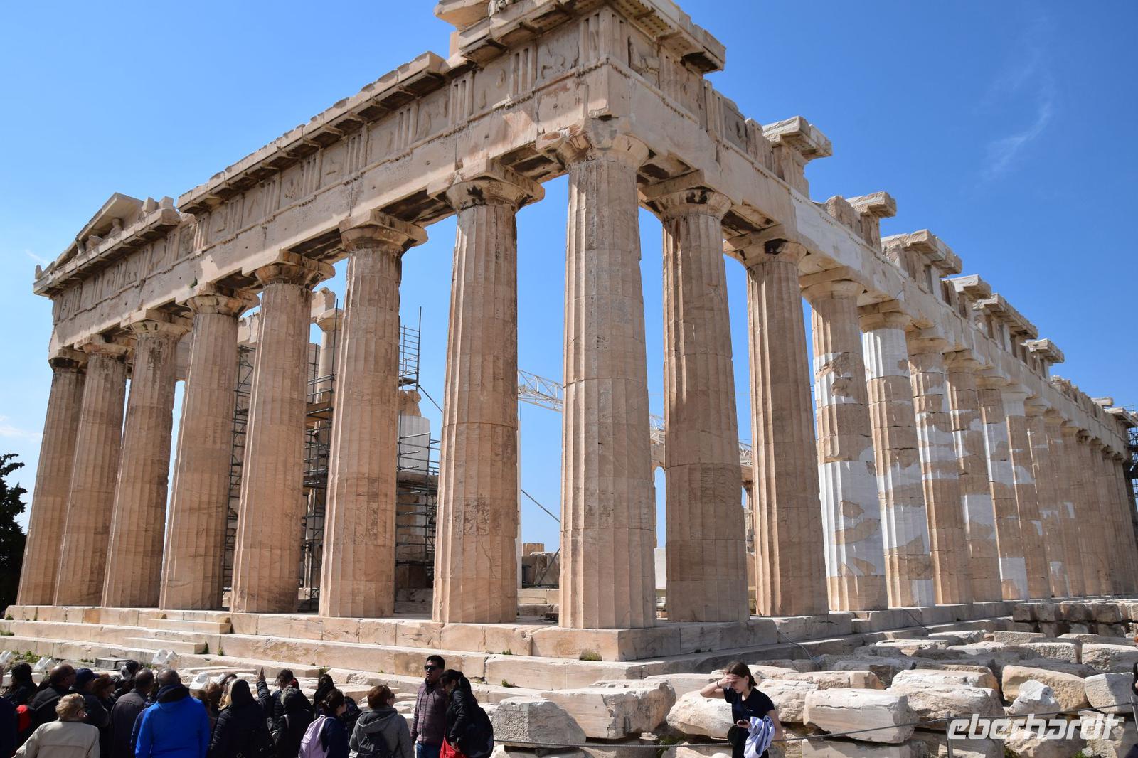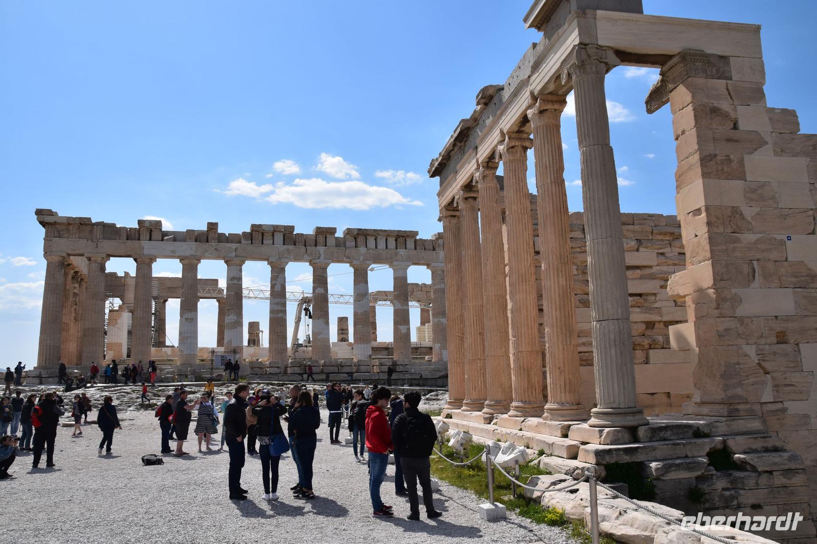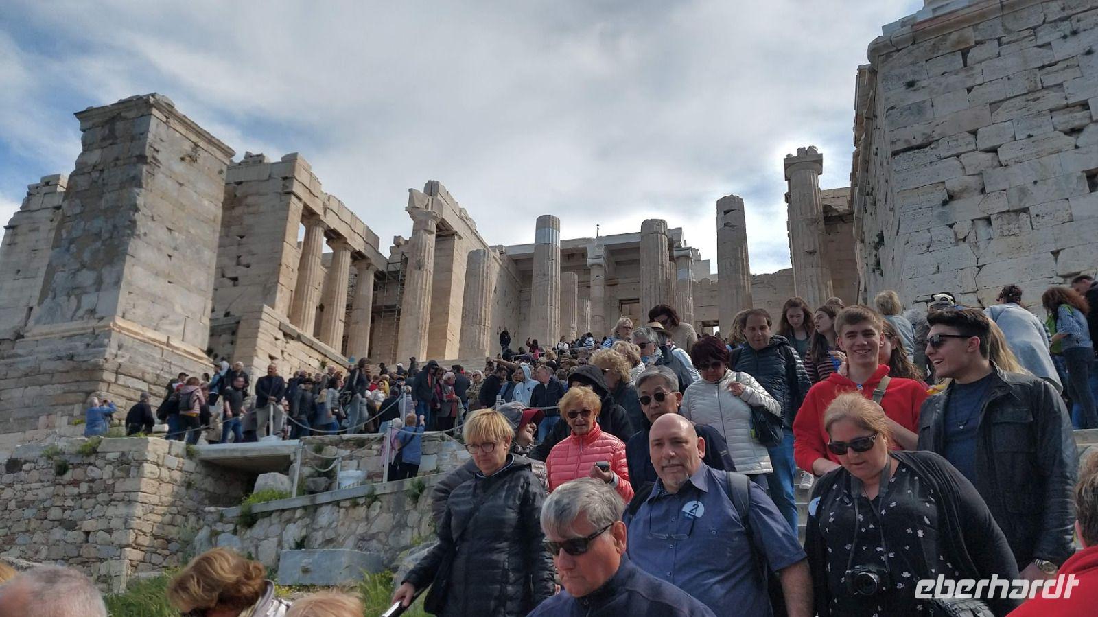 Wir treffen uns zur Panorama-Tour fahren aus dem Hafen und durch die Häuserzeilen von Piräus hinüber zur weiten Bucht vor Athen. Hier sind die Stadien und das neue Kulturzentrum der Stadt errichtet worden. Breite Alleestraßen führen zum Zentrum. Neben der großen Parkanlage mit dem Zeus-Tempel und mit römischen Ausgrabungen befinden sich die Paläste der Stadt, so auch das alte Schloss, welches heute Regierungssitz der Republik ist. Unser Hauptziel ist aber die Akropolis, die „Oberstadt" mit der Burganlage. Zu ihr klettern wir hinauf und besichtigen die Tempelanlagen auf dem 156 m hohen Burgberg. Perikles ließ diese Anlage nach der Zerstörung durch die Perser unter Leitung des berühmten Bildhauers Phidias um 400 vor Chr. neu errichten. Nach der verheerenden Zerstörung durch die Osmanen wurden in den letzten Jahren umfassende Rekonstruktionsarbeiten durchgeführt. Gerade befindet sich der Parthenon im Wiederaufbau.