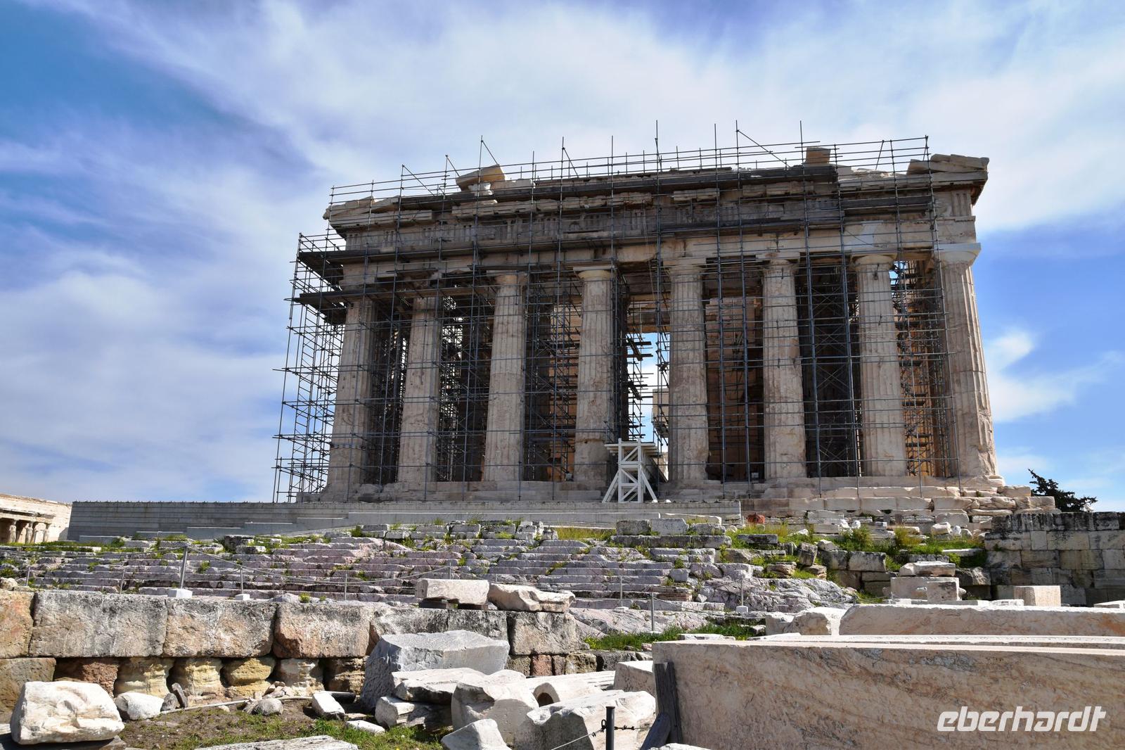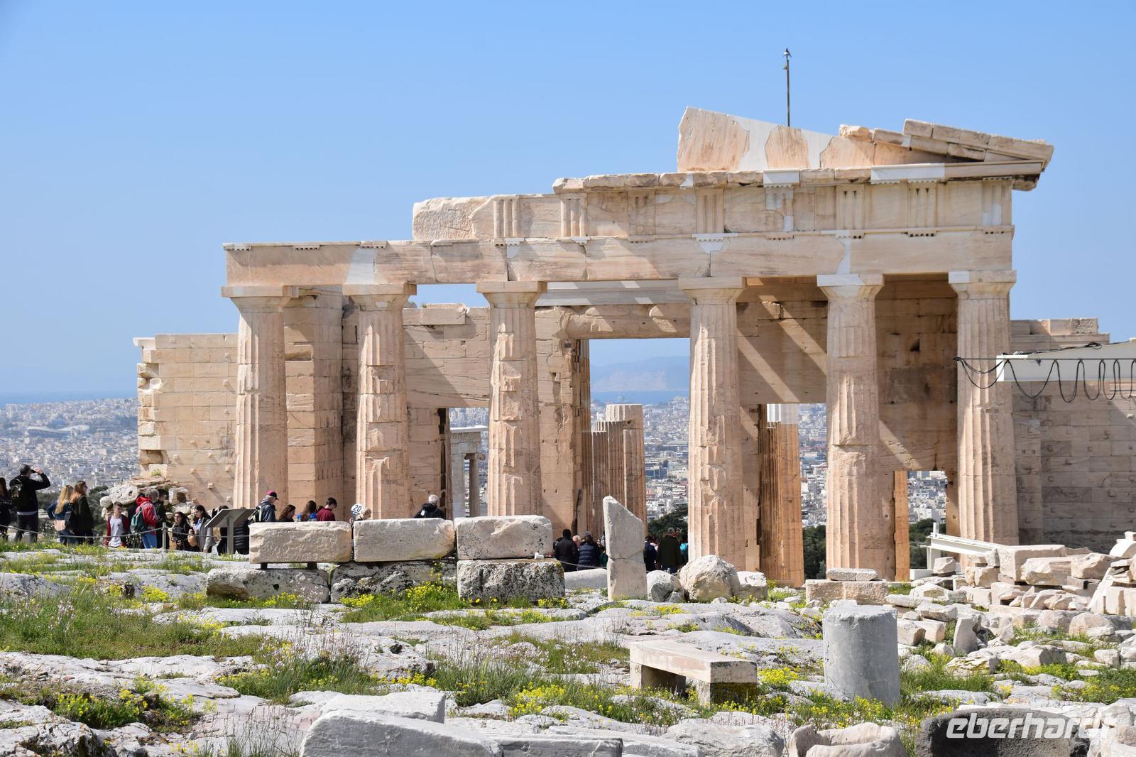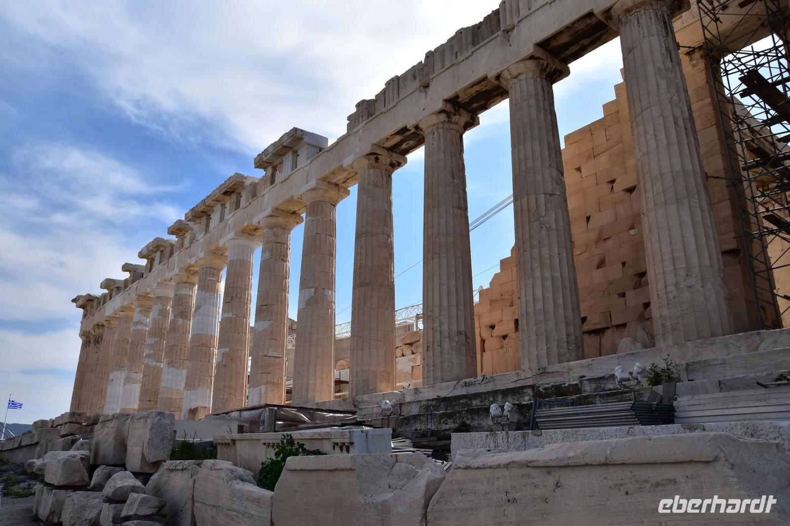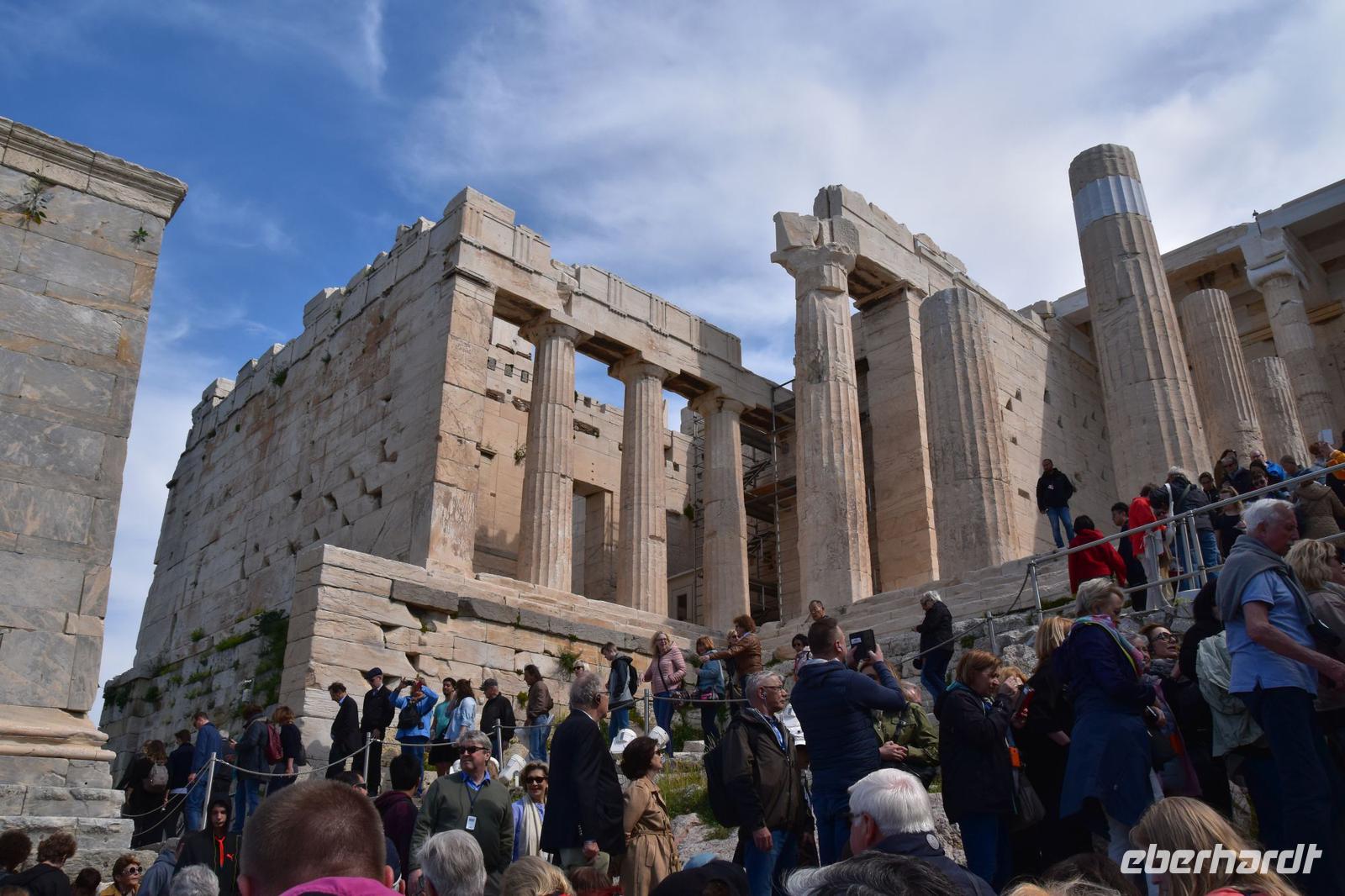 Wir treffen uns zur Panorama-Tour fahren aus dem Hafen und durch die Häuserzeilen von Piräus hinüber zur weiten Bucht vor Athen. Hier sind die Stadien und das neue Kulturzentrum der Stadt errichtet worden. Breite Alleestraßen führen zum Zentrum. Neben der großen Parkanlage mit dem Zeus-Tempel und mit römischen Ausgrabungen befinden sich die Paläste der Stadt, so auch das alte Schloss, welches heute Regierungssitz der Republik ist. Unser Hauptziel ist aber die Akropolis, die „Oberstadt" mit der Burganlage. Zu ihr klettern wir hinauf und besichtigen die Tempelanlagen auf dem 156 m hohen Burgberg. Perikles ließ diese Anlage nach der Zerstörung durch die Perser unter Leitung des berühmten Bildhauers Phidias um 400 vor Chr. neu errichten. Nach der verheerenden Zerstörung durch die Osmanen wurden in den letzten Jahren umfassende Rekonstruktionsarbeiten durchgeführt. Gerade befindet sich der Parthenon im Wiederaufbau.