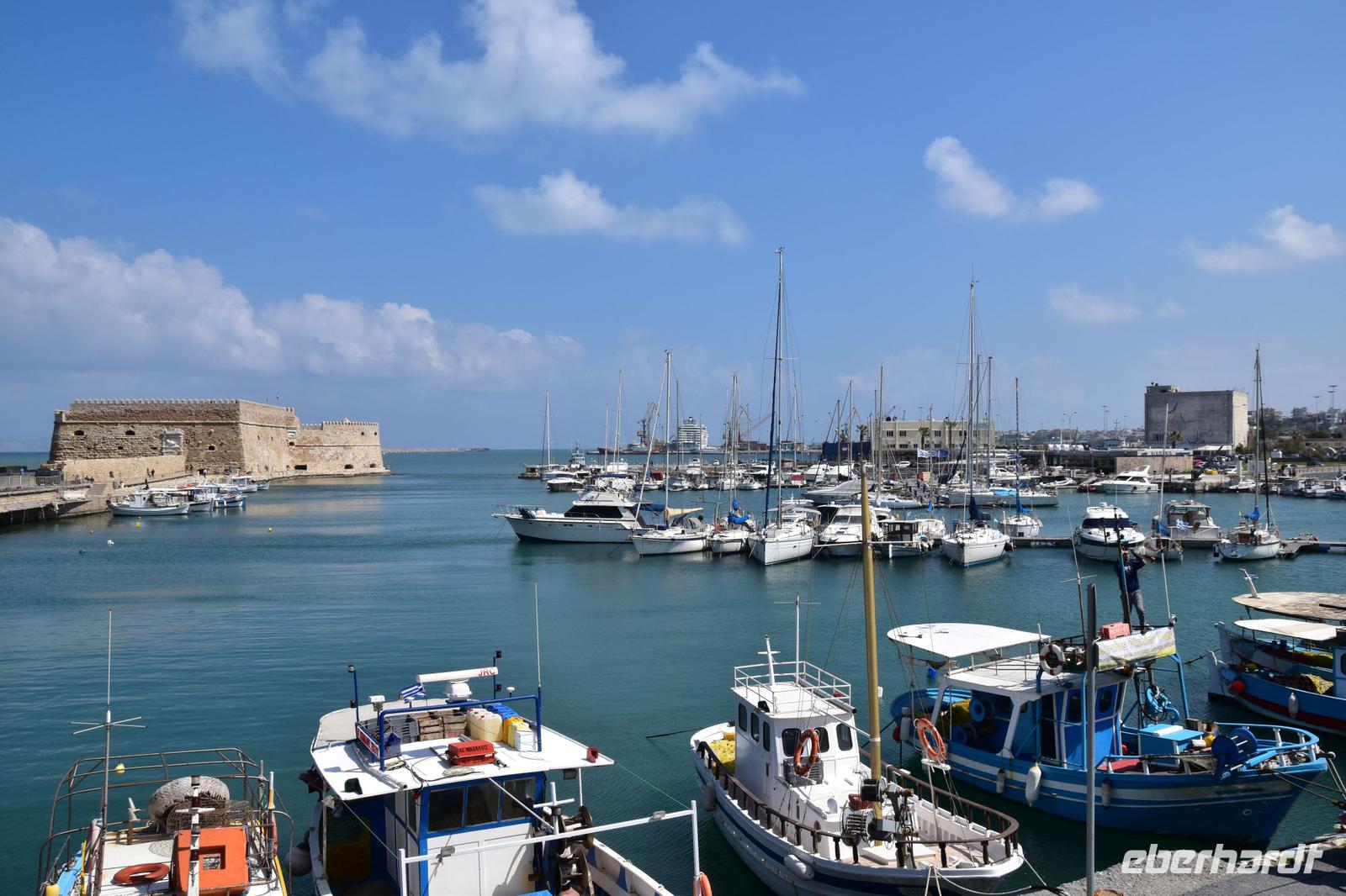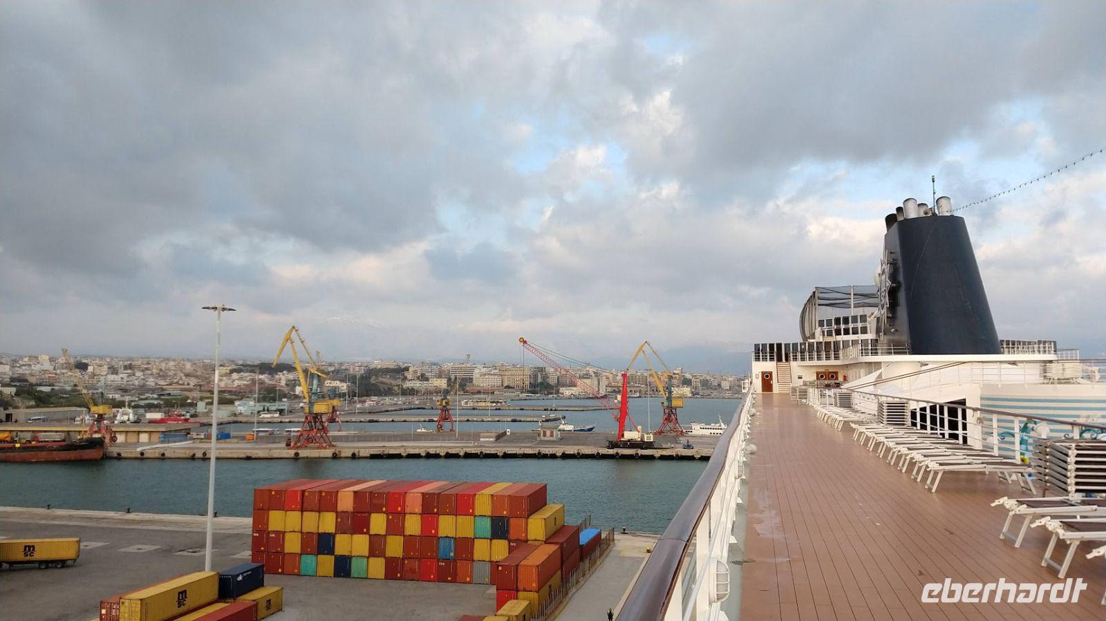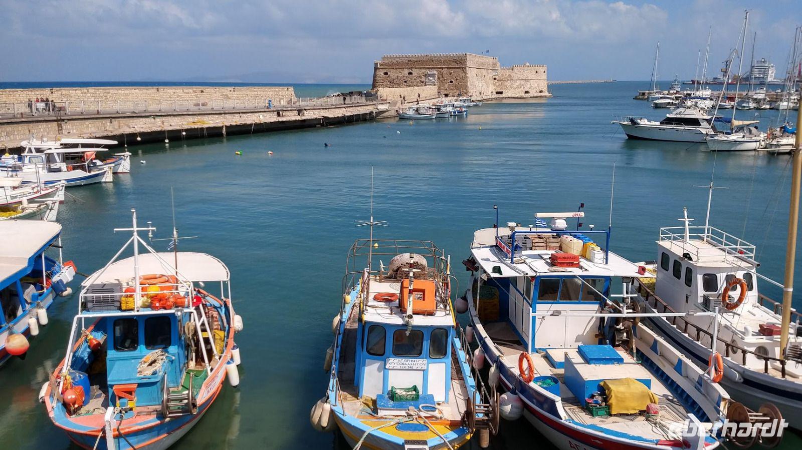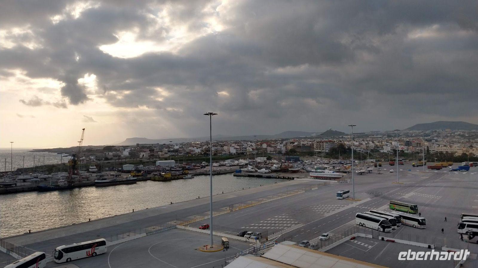 Über der Insel Kreta hängen noch Gewitterwolken und es ist ziemlich diesig als wir Heraklion erreichen. Der große Hafen auf der Nordseite ist gleichzeitig das Tor zur Insel mit seinen hohen Gebirgen im Westen, Ida-Gebirge (2456 m) und Weiße Berge (2453 m), sowie im Osten, das Dikti-Gebirge (2148 m).
