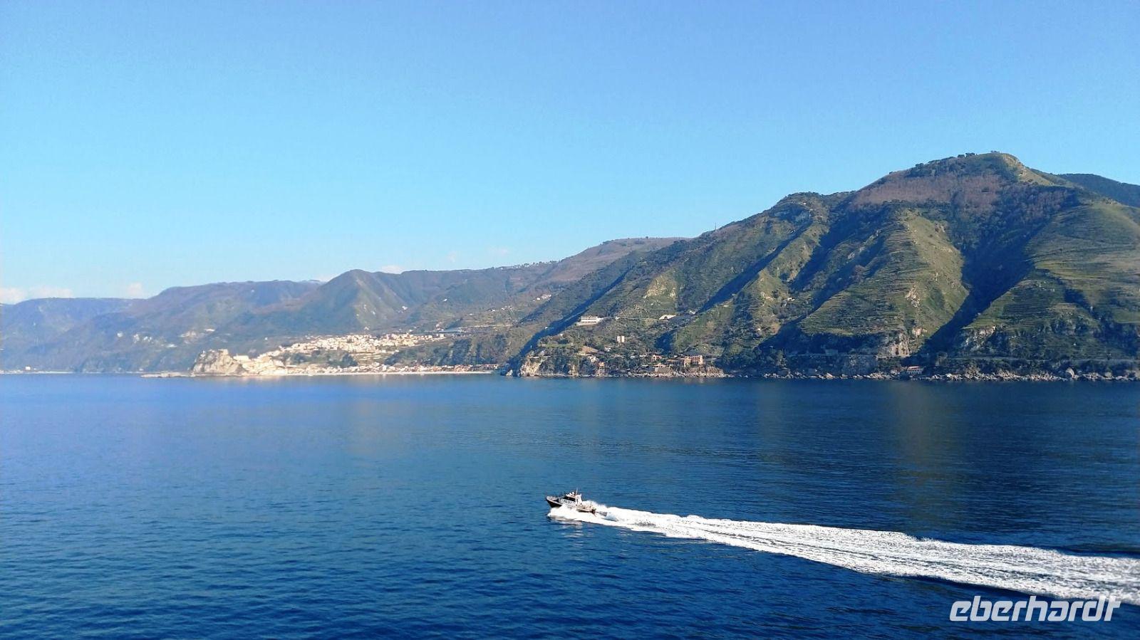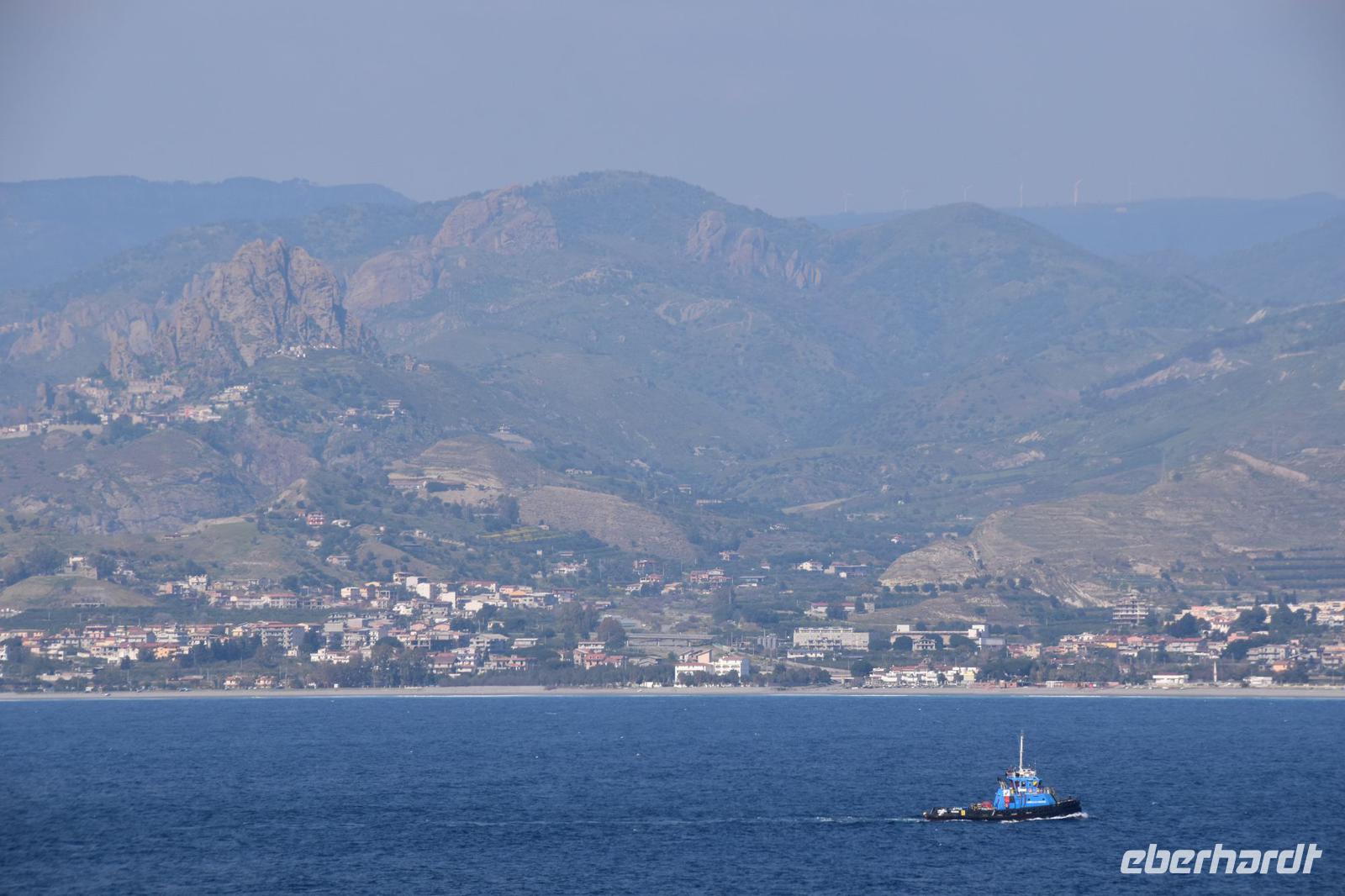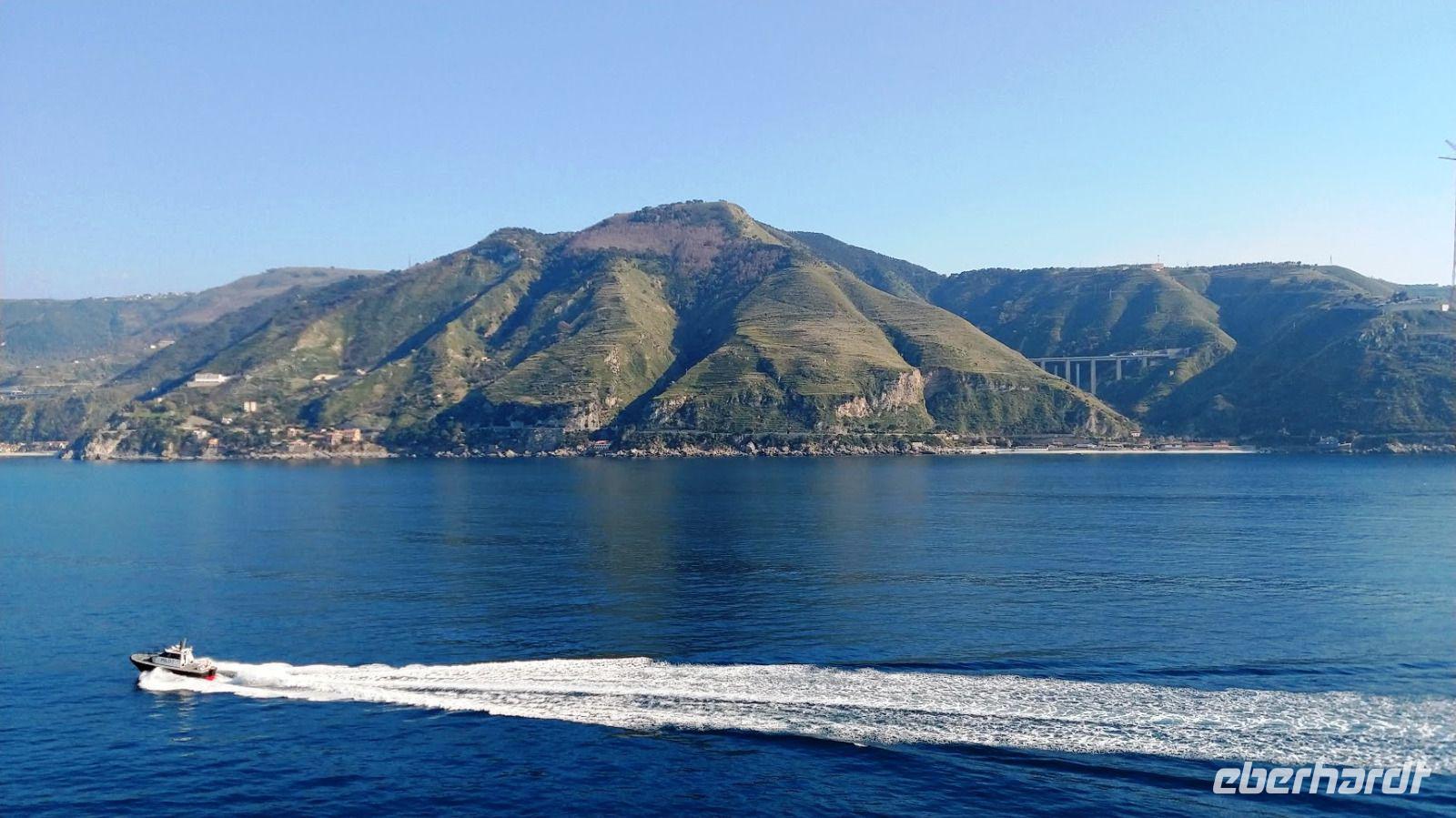 Der Nachmittag ist vom Blick auf Sizilien mit dem Ätna, von der Passage der Straße von Messina, und der Passage des aktiven Stromboli geprägt.