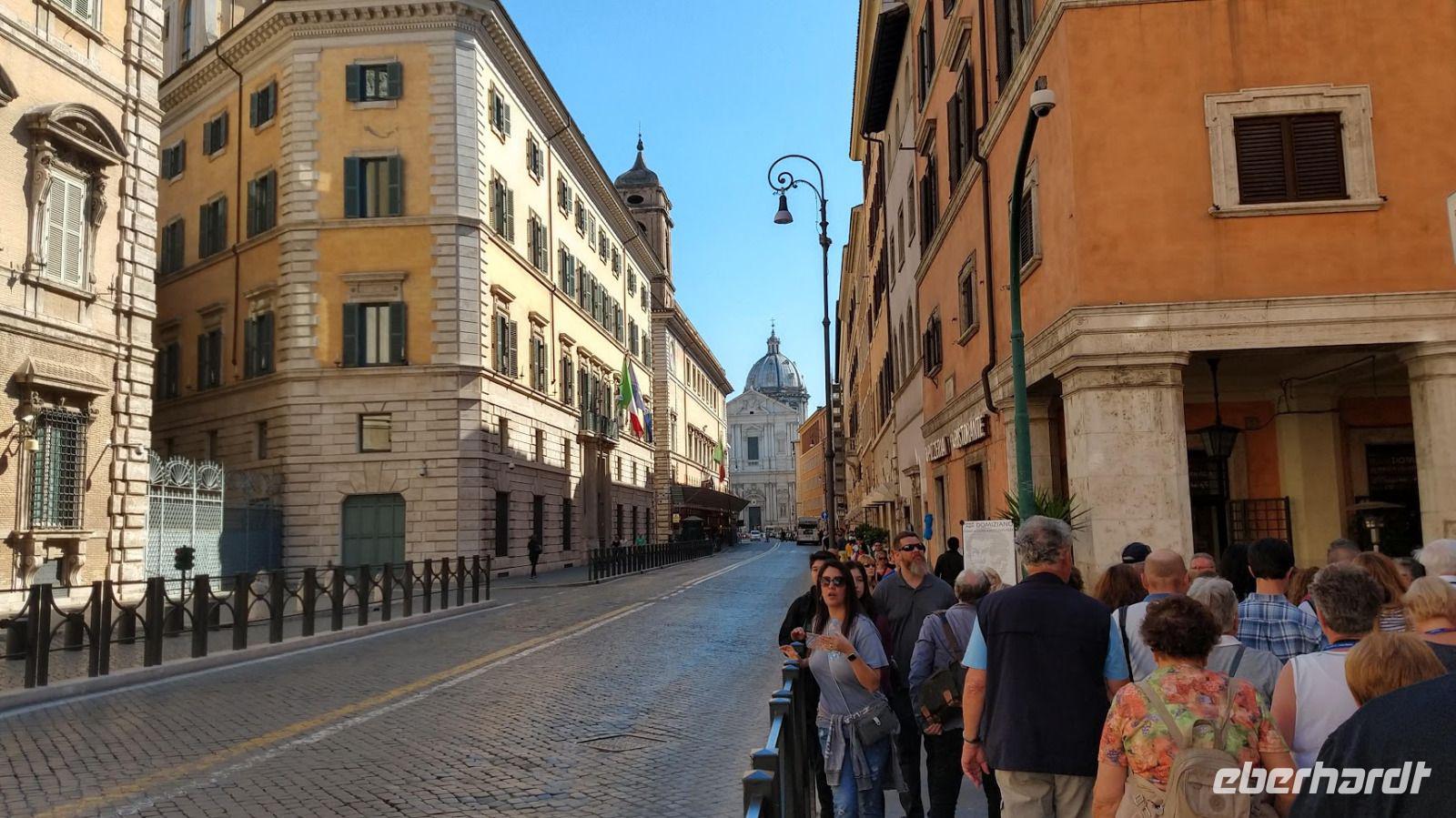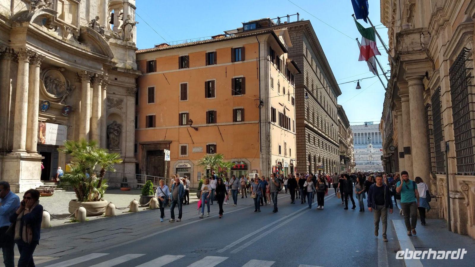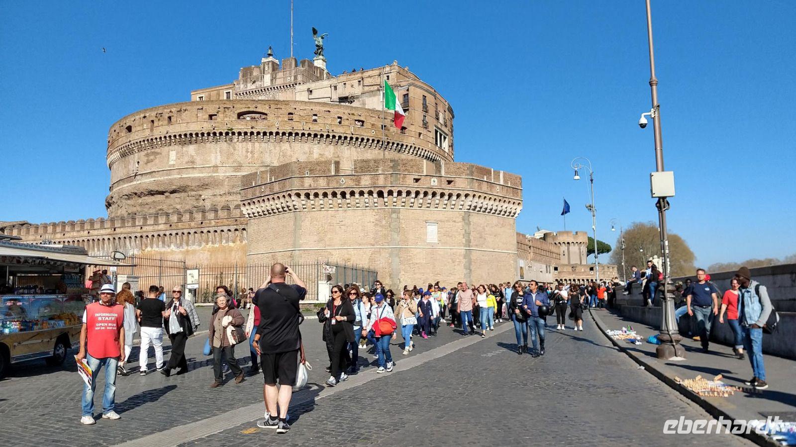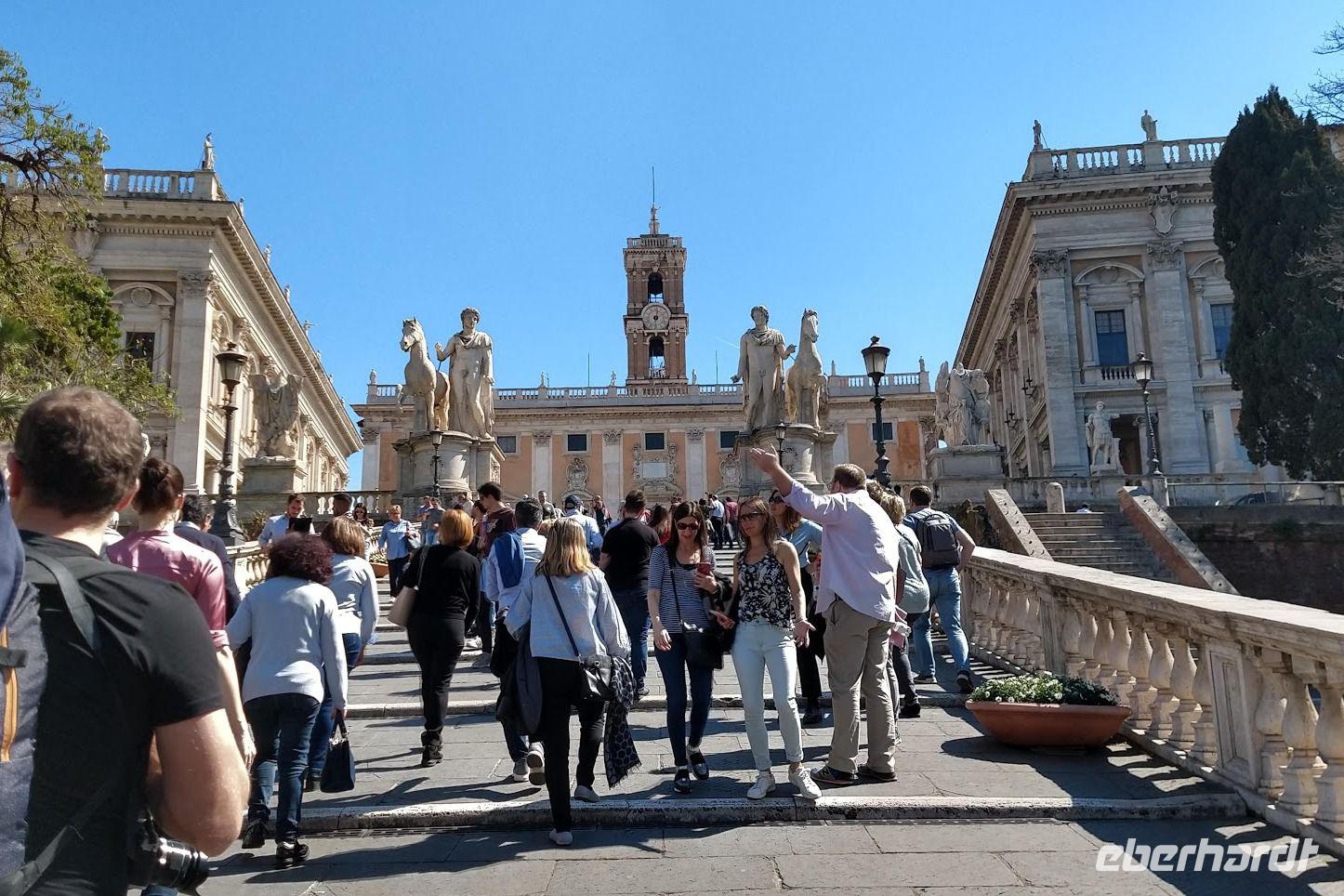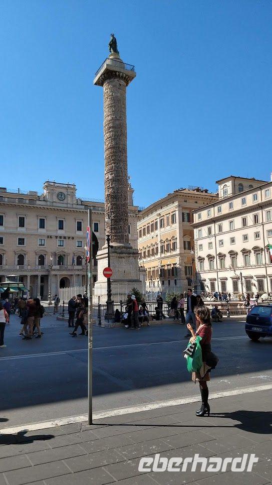 Dann beginnt unser gemeinsamer Fußweg durch die Stadt Rom: Apollo-Tempel, Marcello Theater, Senatorenpalast mit dem Kapitolsplatz, der Statue von Kaiser Marc Aurel und der Freitreppe von Michelangelo, Forum Romanum, Trajan-Säule, durch die Via del Corso zur Marc-Aurel-Säule, Trevi-Brunnen, Spanischer Platz mit der Statue der unbefleckten Empfängnis, Scalinata di Trinità dei Monti (Spanische Treppe), Pantheon, Navona-Platz mit den drei Brunnen und dem Bauensemble von Bernini , Engelsburg, Engelsbrücke und Petersplatz (Vatikan).