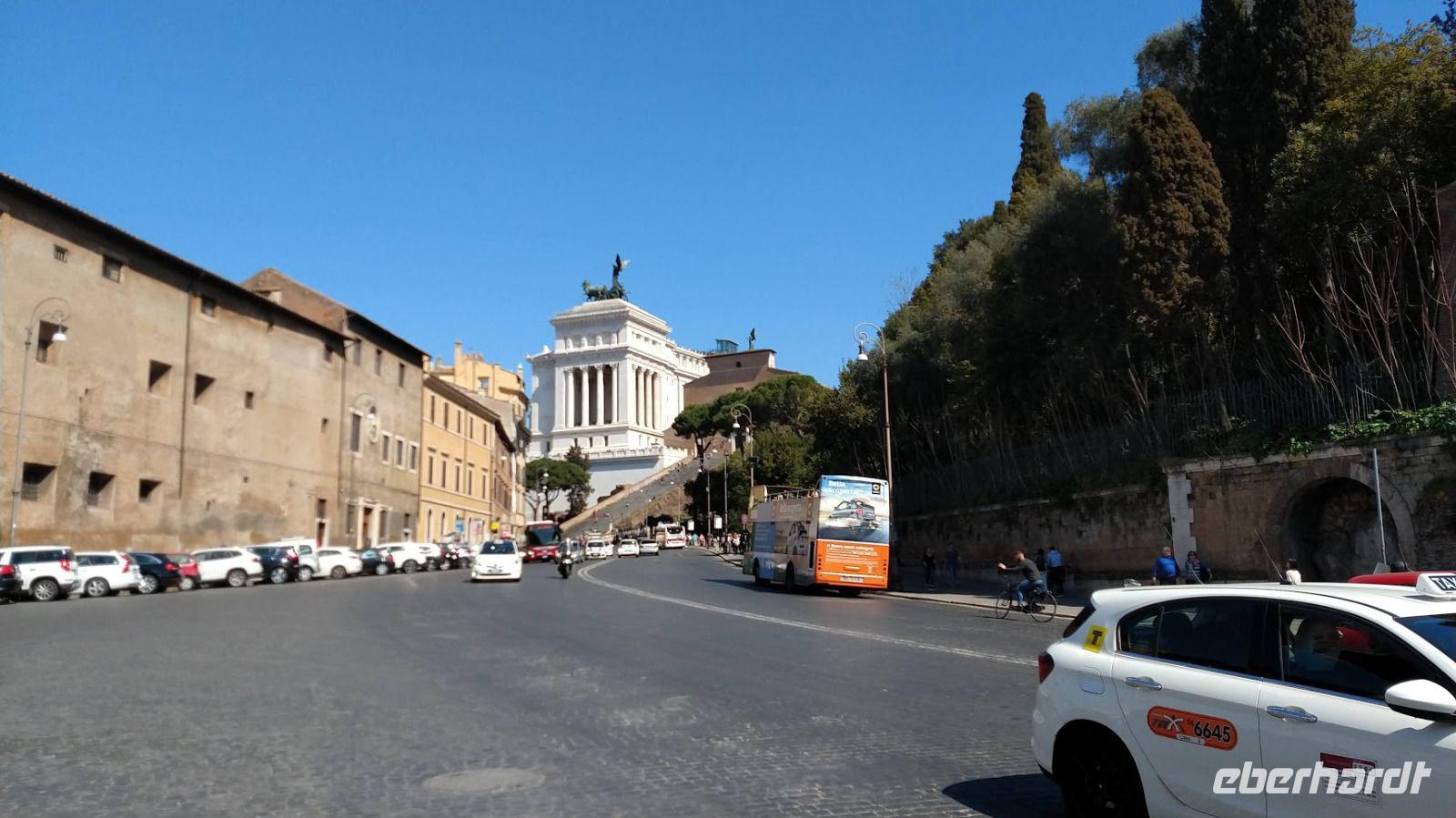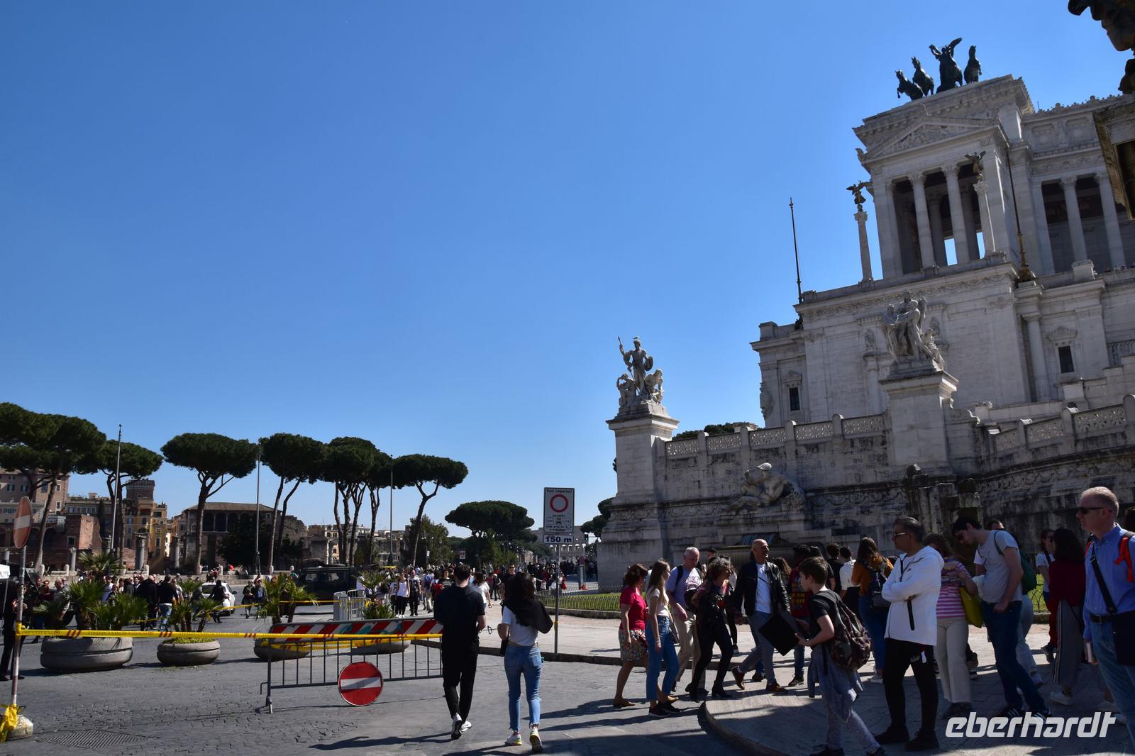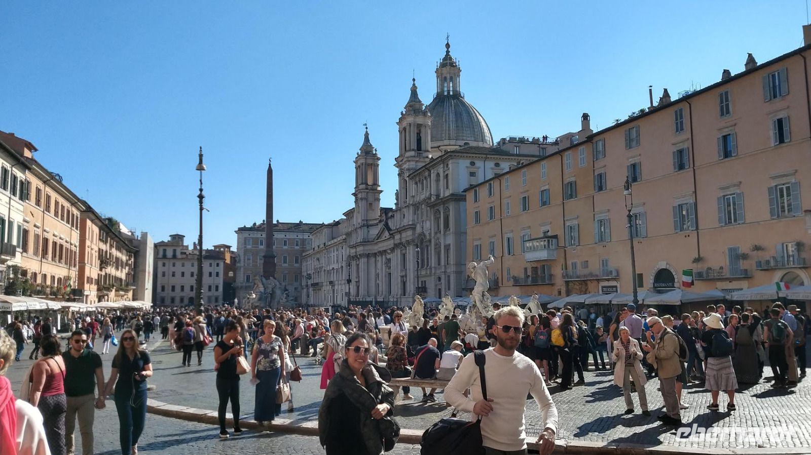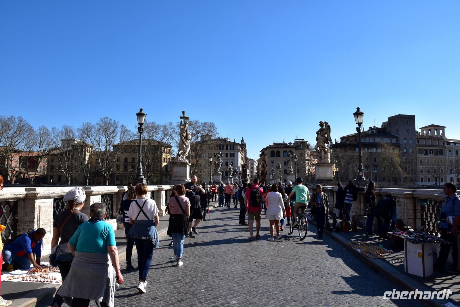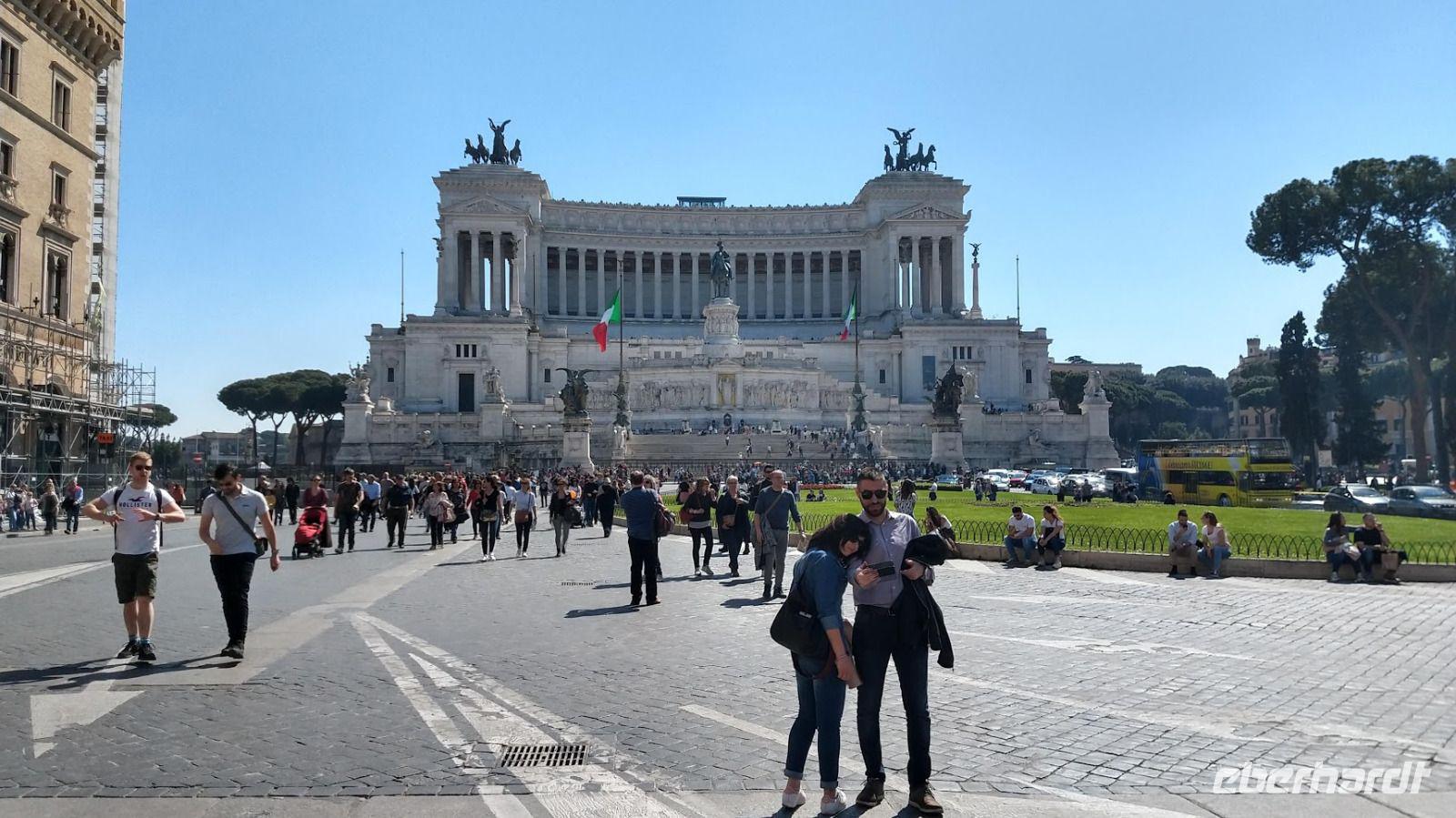 Dann beginnt unser gemeinsamer Fußweg durch die Stadt Rom: Apollo-Tempel, Marcello Theater, Senatorenpalast mit dem Kapitolsplatz, der Statue von Kaiser Marc Aurel und der Freitreppe von Michelangelo, Forum Romanum, Trajan-Säule, durch die Via del Corso zur Marc-Aurel-Säule, Trevi-Brunnen, Spanischer Platz mit der Statue der unbefleckten Empfängnis, Scalinata di Trinità dei Monti (Spanische Treppe), Pantheon, Navona-Platz mit den drei Brunnen und dem Bauensemble von Bernini , Engelsburg, Engelsbrücke und Petersplatz (Vatikan).