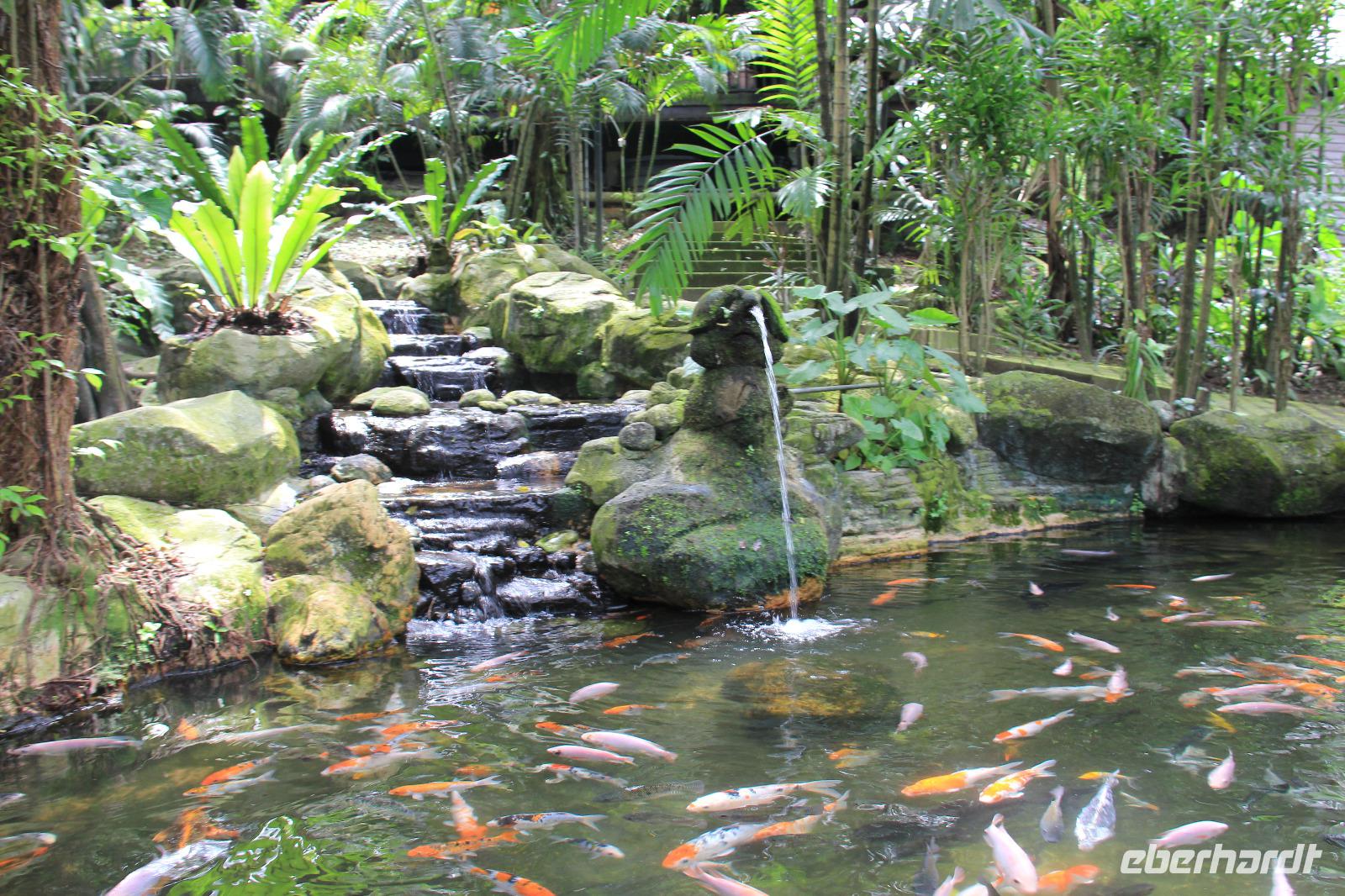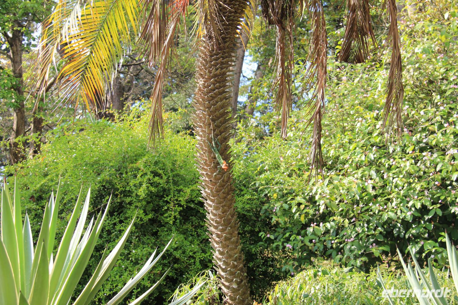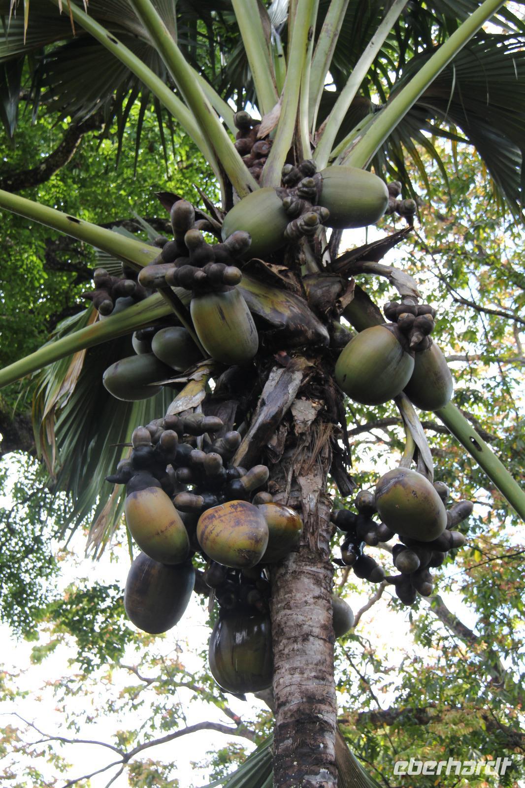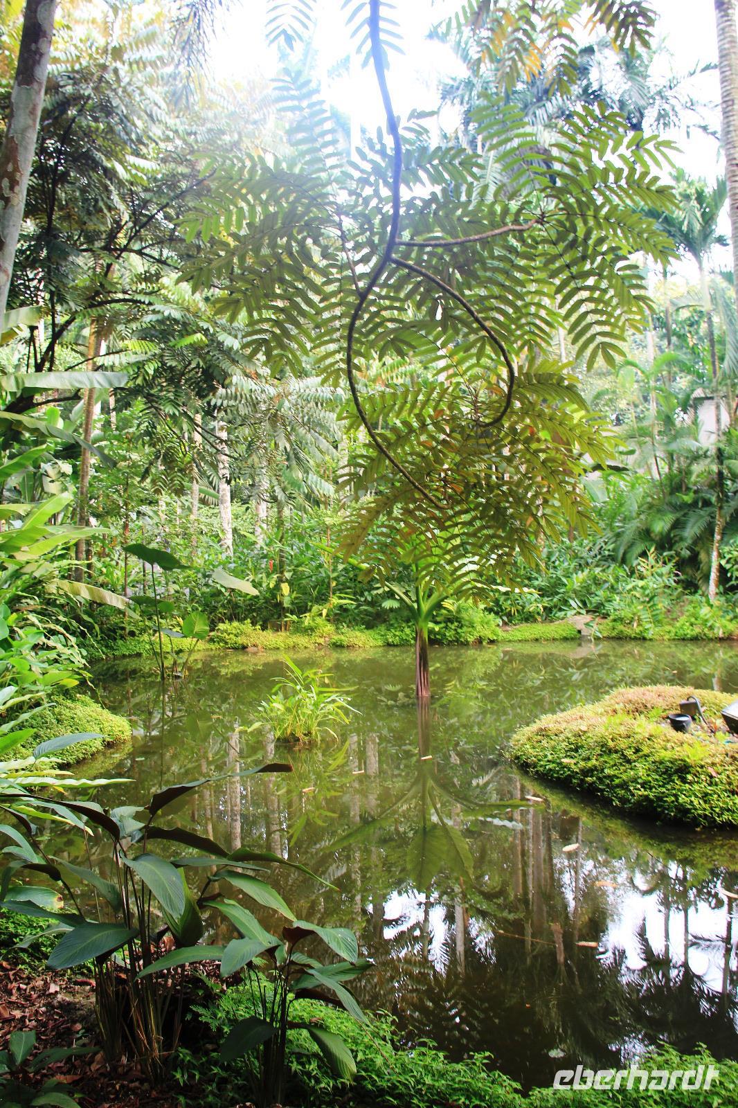 Beeindruckend waren vor allem die Riesen-Kokosnüsse, welche enorm groß werden. Doch die Komposition aller Pflanzen und Bäume, die schiere grüne Natur und die Tiere in dem Garten, getarnt an und in den Bäumen sorgten gemeinsam erst für diese schöne Atmosphäre hier.