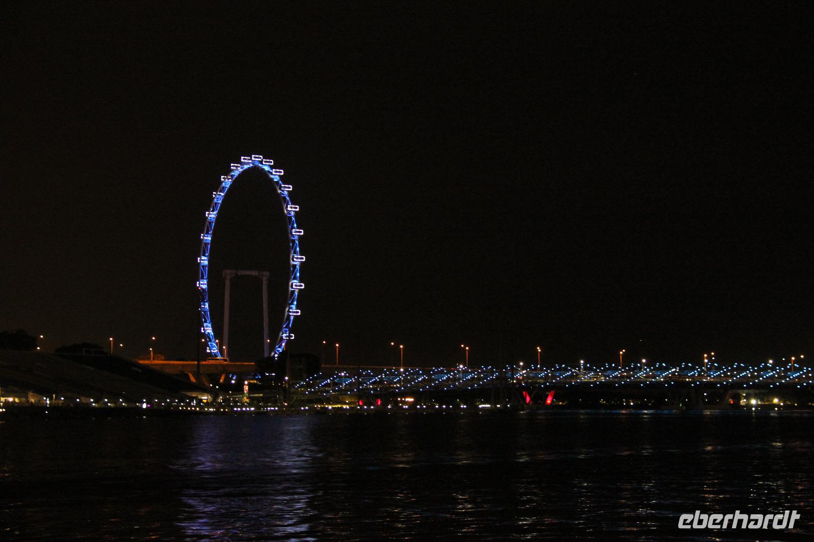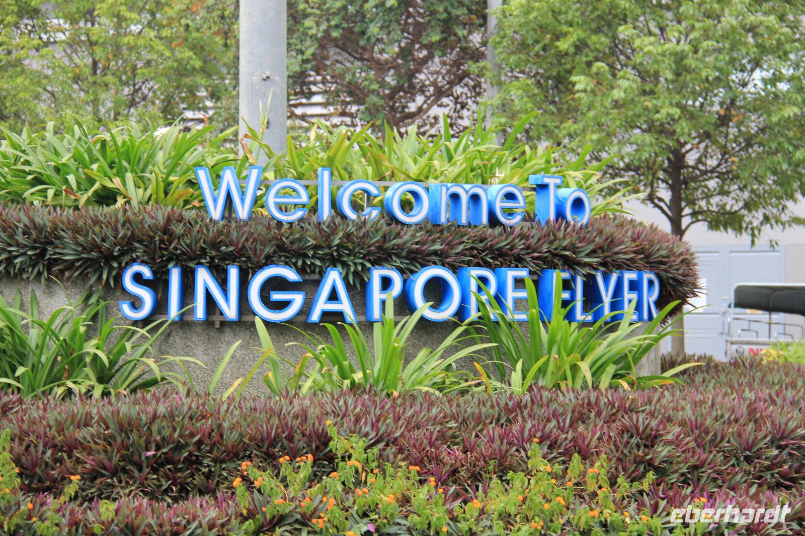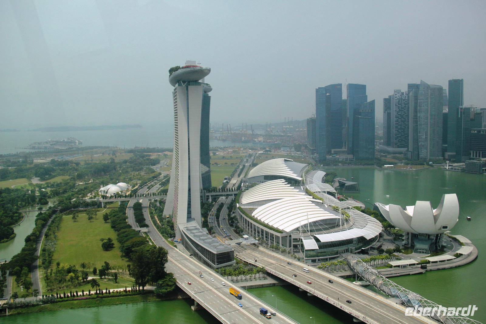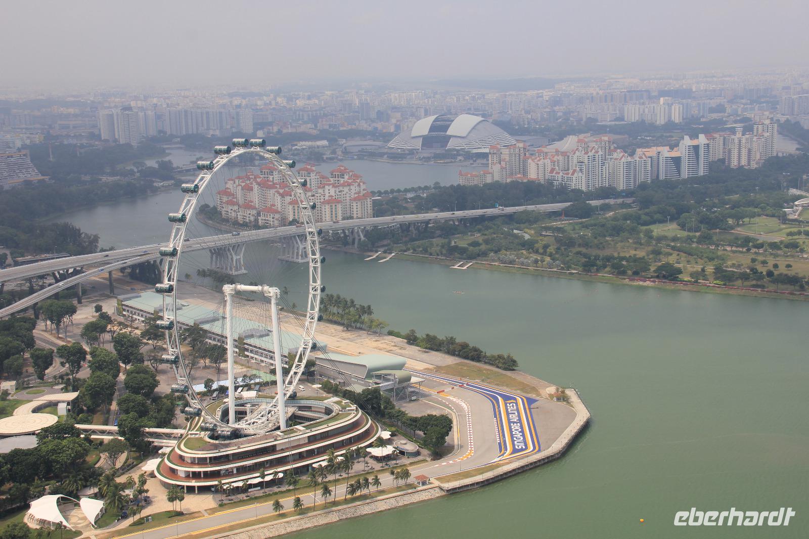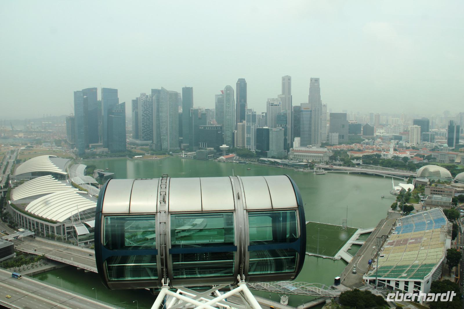Begleitet von ein paar Regentropfen fuhren wir zum Riesenrad Singapore Flyer. Hier konnten wir ganz ohne andere Touristen die Fahrt in einer der Gondeln genießen und selbst der Regen hatte sich bereits wieder verzogen. Der Blick vom Riesenrad über die Stadt war wunderschön, wenn die Sicht auch ein wenig nebelverhangen war. Wir konnten nicht nur die Formel 1 Rennstrecke sehen, sondern auch das bekannte Marina Bay Sands Hotel (das neue Wahrzeichen der Stadt), das Fabelwesen Merlion, den neuen botanischen Garten Gardens by the Bay und vieles mehr.