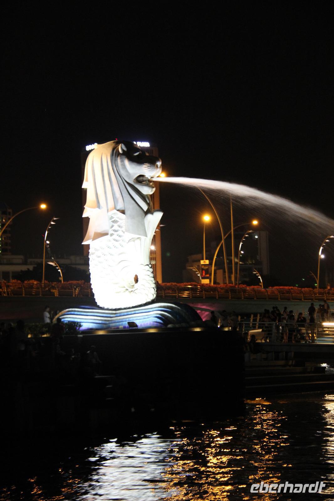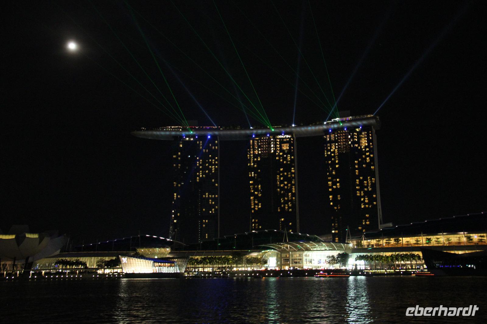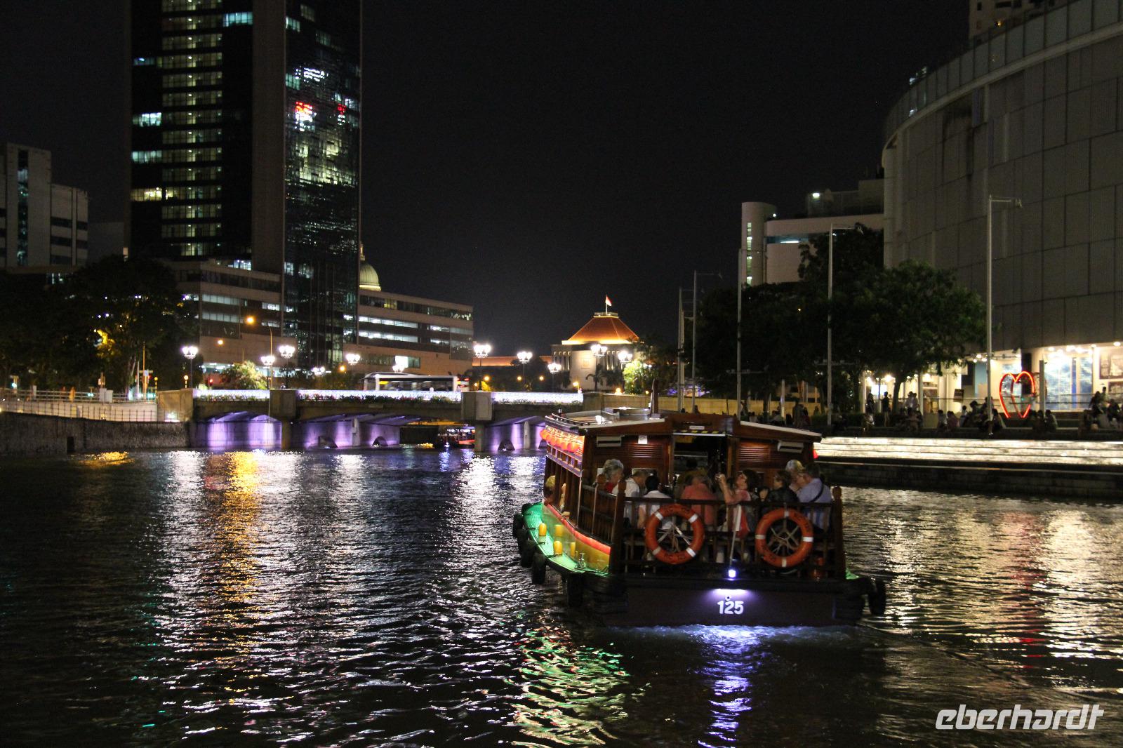 Abends trafen wir uns in aller Frische wieder und aßen zuerst in einem Restaurant am Clark Quay. Danach schlenderten wir die Promenade am Clark Quay entlang zur Bootsanlegestelle des Singapore Rivers. Hier gingen wir an Bord eines Bootes und unternahmen eine abendliche Bootsfahrt auf dem Fluss. Perfekt abgestimmt zur Laser Show des Marina Bay Sands Hotels fuhren wir auf dem Fluss entlang und konnten die Stadt vom Wasser aus erkunden. Wir kamen auch an dem schön leuchtenden Theater sowie an dem Fabelwesen Merlion vorbei, welches eines der Wahrzeichen der Stadt ist. Ein perfekter Abschluss für unsere Stadtbesichtigung in Singapur an diesem Tag.
