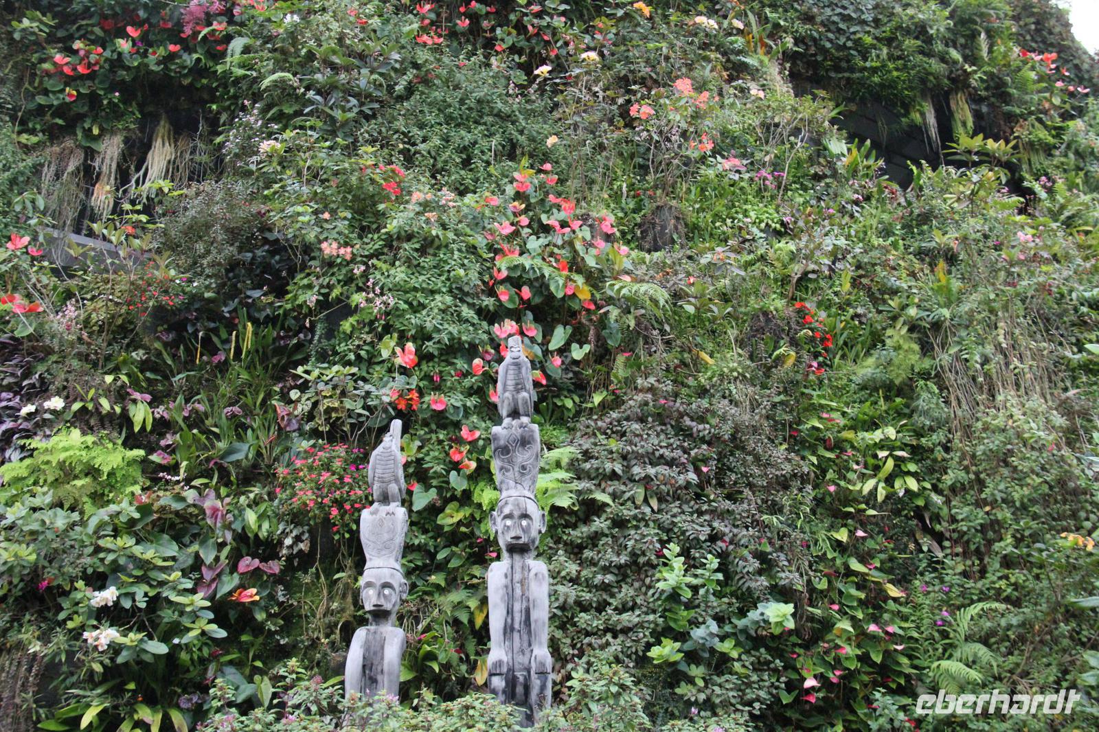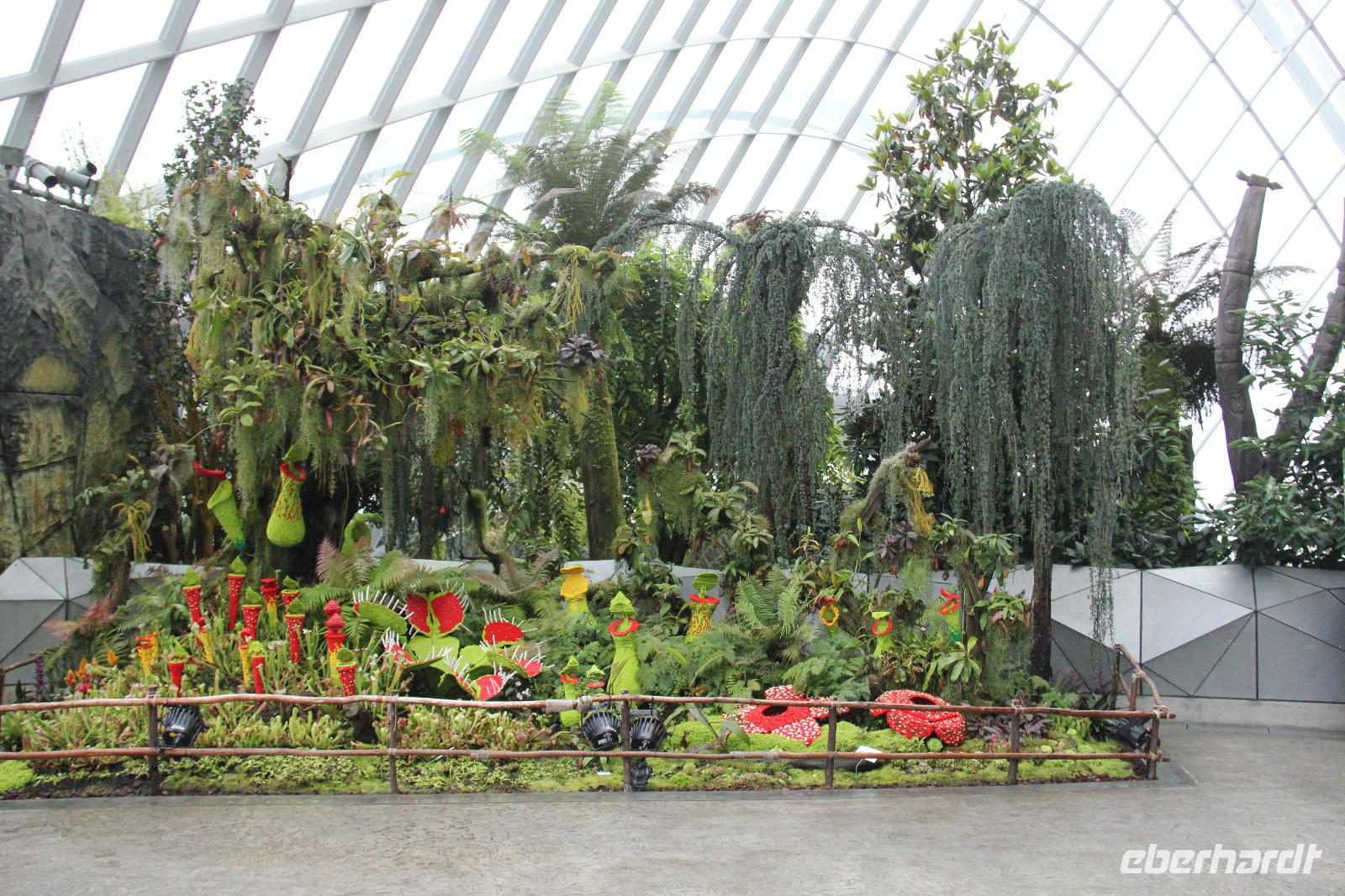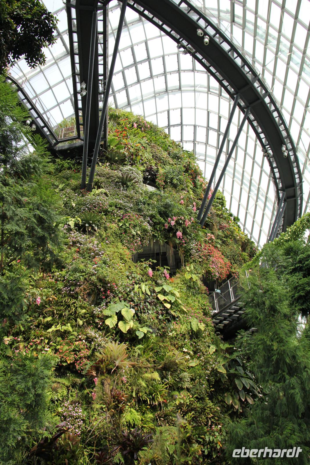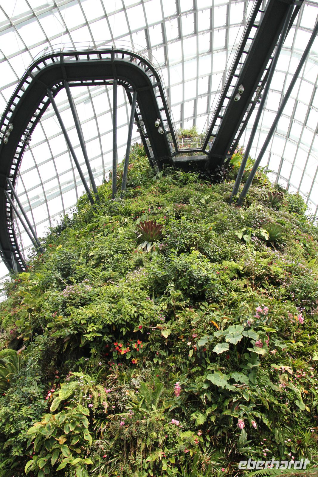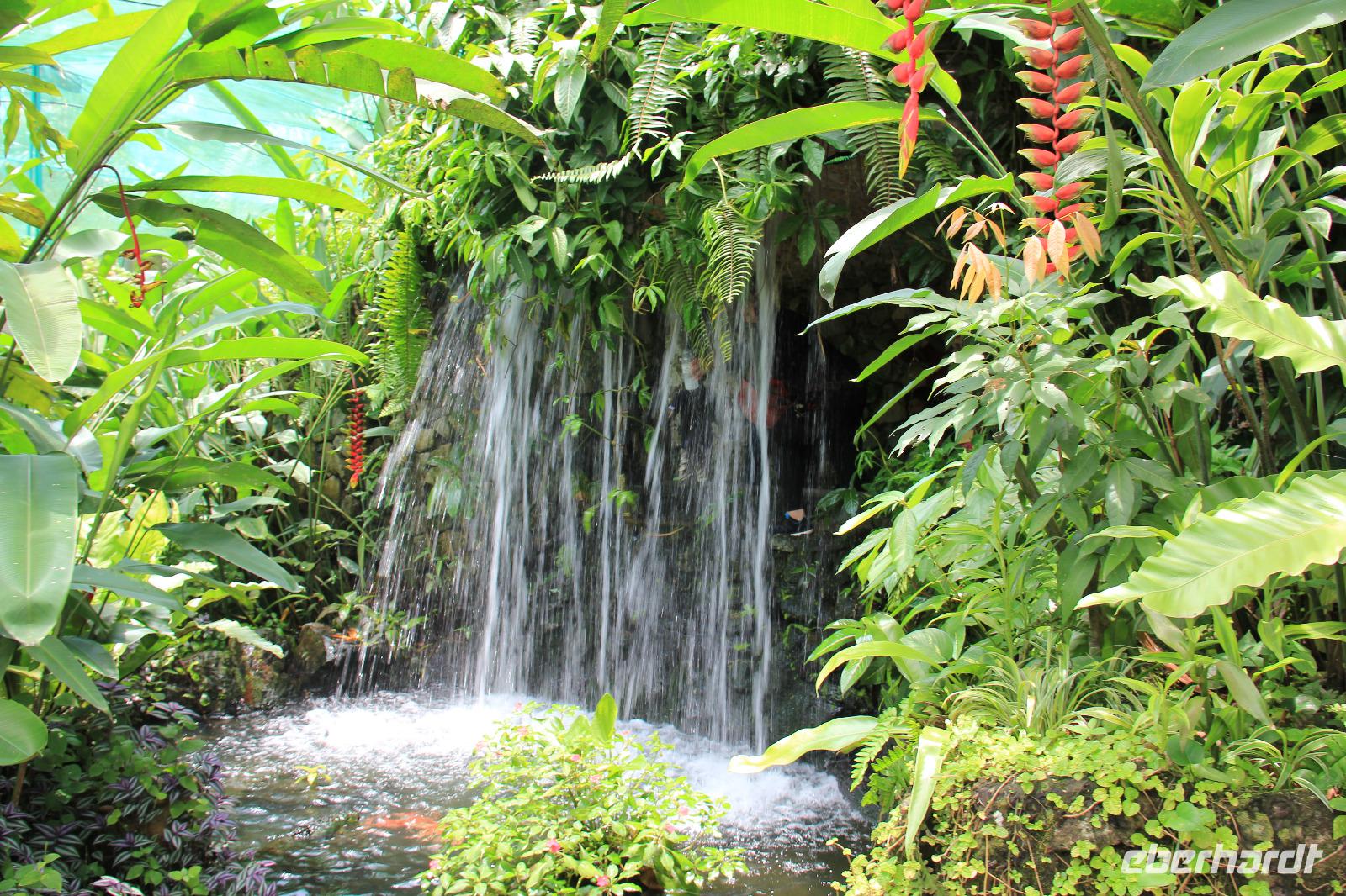 In der ersten Halle wurde das tropische Bergklima nachempfunden mit kühl-feuchter Atmosphäre. Von einem Wasserfall in Empfang genommen ging es über verschiedene Aussichtsplattformen und kleine Rundwege durch die Halle. Die bunten Blumen angelegt über die komplette Höhe der Halle waren sehr schön anzusehen und wir konnte auch eine Vielzahl an tropischen Blumen sehen können.