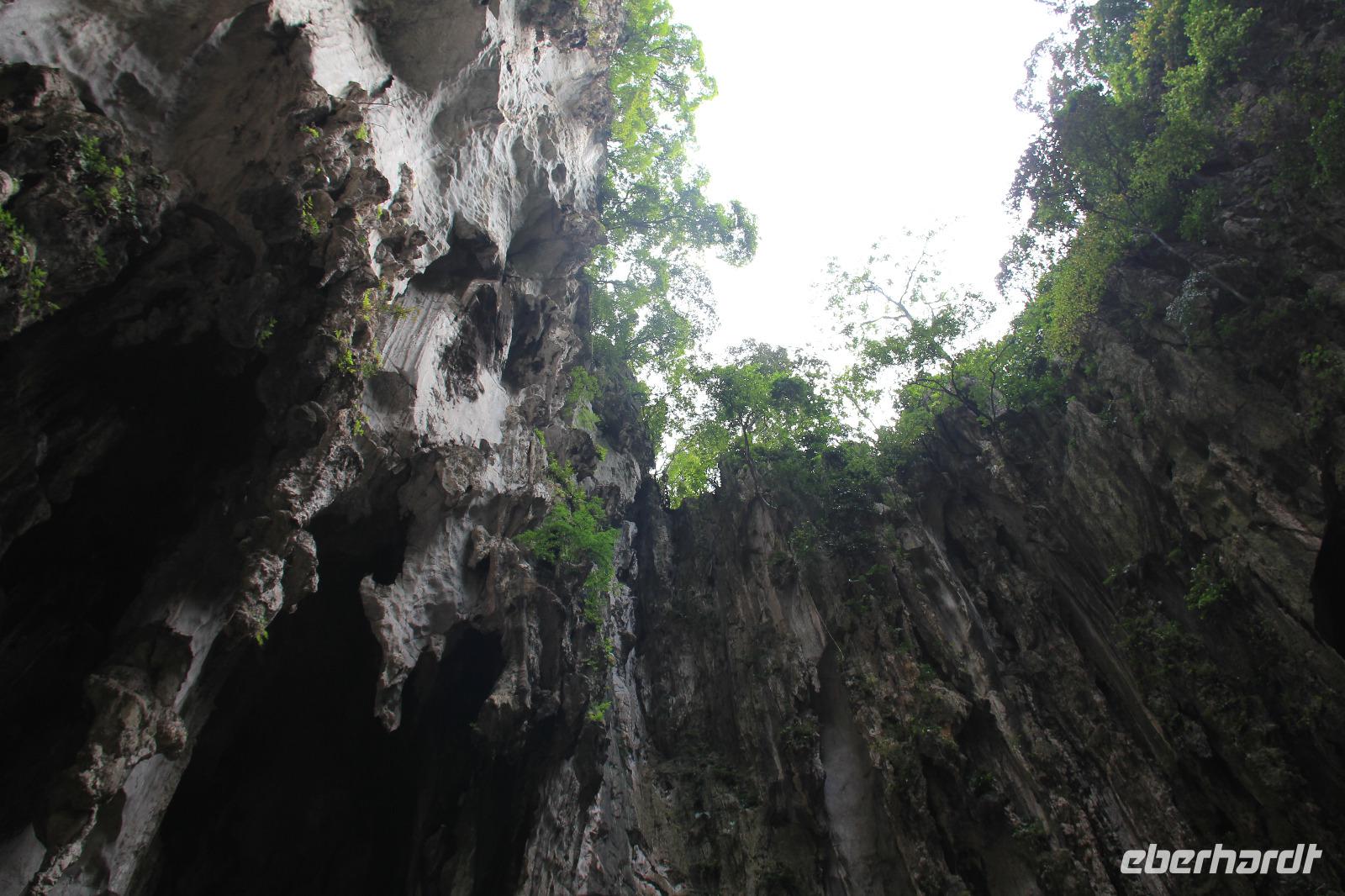 Diese Höhlen ein paar Kilometer von Stadtzentrum von Kuala Lumpur entfernt, beherbergen kleine Tempelanlage, die zu Ehren vom Sohn Shivas errichtet wurde. Hier angekommen stach einem erst einmal die riesige vergoldete Statue von Murugan (dem Sohn Shivas) sowie die daneben befindlichen 272 steil ansteigenden Stufen ins Auge. Denn um die Tempel in den Kalksteinhöhlen zu erreichen, sollte man erst einmal die Treppen überwinden. Da heute Vormittag die Sonne noch nicht so sehr brannte, erklimmten wir die Stufen ganz gut, auch wenn es uns durch die hohe Luftfeuchtigkeit und die nichts desto trotz hohen Temperaturen den Schweiß nicht nur ins Gesicht trieb. Doch der Anstieg lohnte sich. Oben angekommen wurde man vom Geruch des Weihrauchs empfangen und konnte mehrere hinduistische Götterbilder entdecken sowie die kleine Tempelanlage.