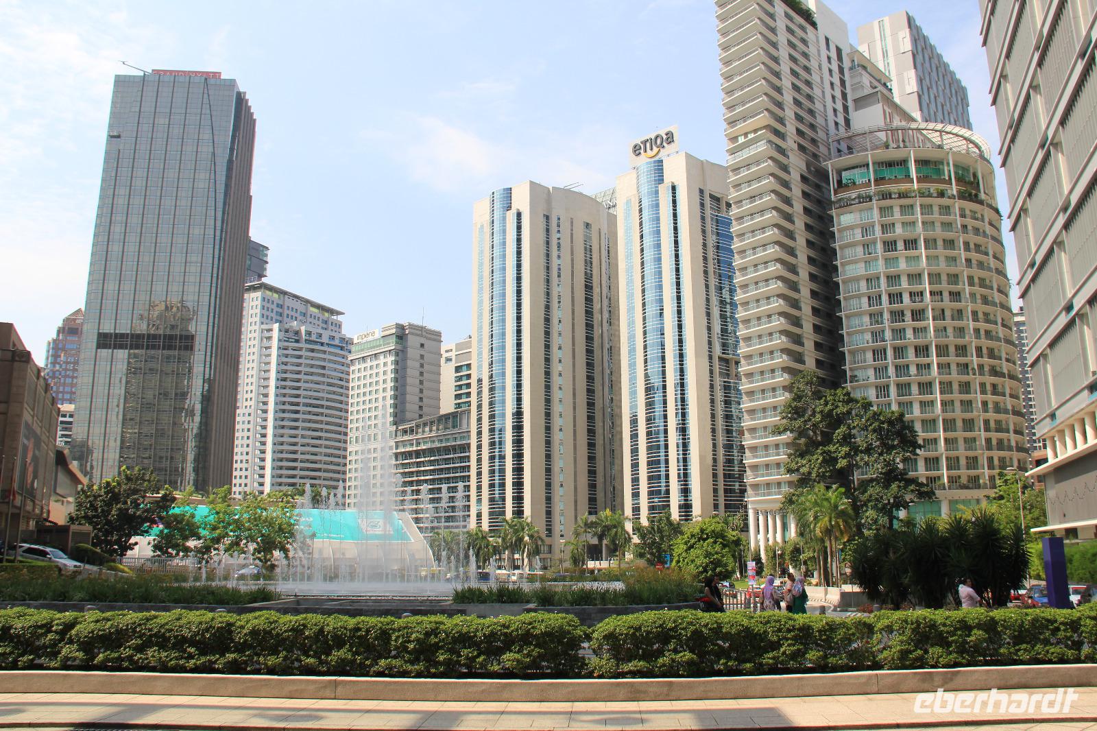 Von den Batu Höhlen fuhren wir dann ins Stadtzentrum von Kuala Lumpur. Hier machten wir zuerst einen Fotostopp am Wahrzeichen der Stadt, welches die Skyline klar beherrscht, an den Petronas Twin Towers. Diese Zwillingstürme tragen den Namen des großen Mineralölkonzern Petronas. Mit ihren 452 Metern Höhe sind sie das höchste Gebäude der Stadt und sie werden durch eine in 172 Metern Höhe befindliche Skybridge verbunden.