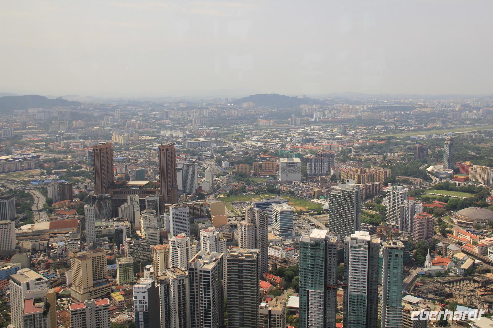 Nach dem Fotostopp fuhren wir weiter zum KL Tower, dem Fernsehturm der Stadt. Auf dem sogenannten Ananashügel gelegen wirkt er trotz seiner nur 421 Metern Höhe gelegentlich etwas höher als die Petronas Twin Towers. Gemeinsam fuhren wir mit dem Fahrstuhl hinauf auf die Aussichtsplattform und konnten einen 360° Panoramablick auf die Stadt werfen.