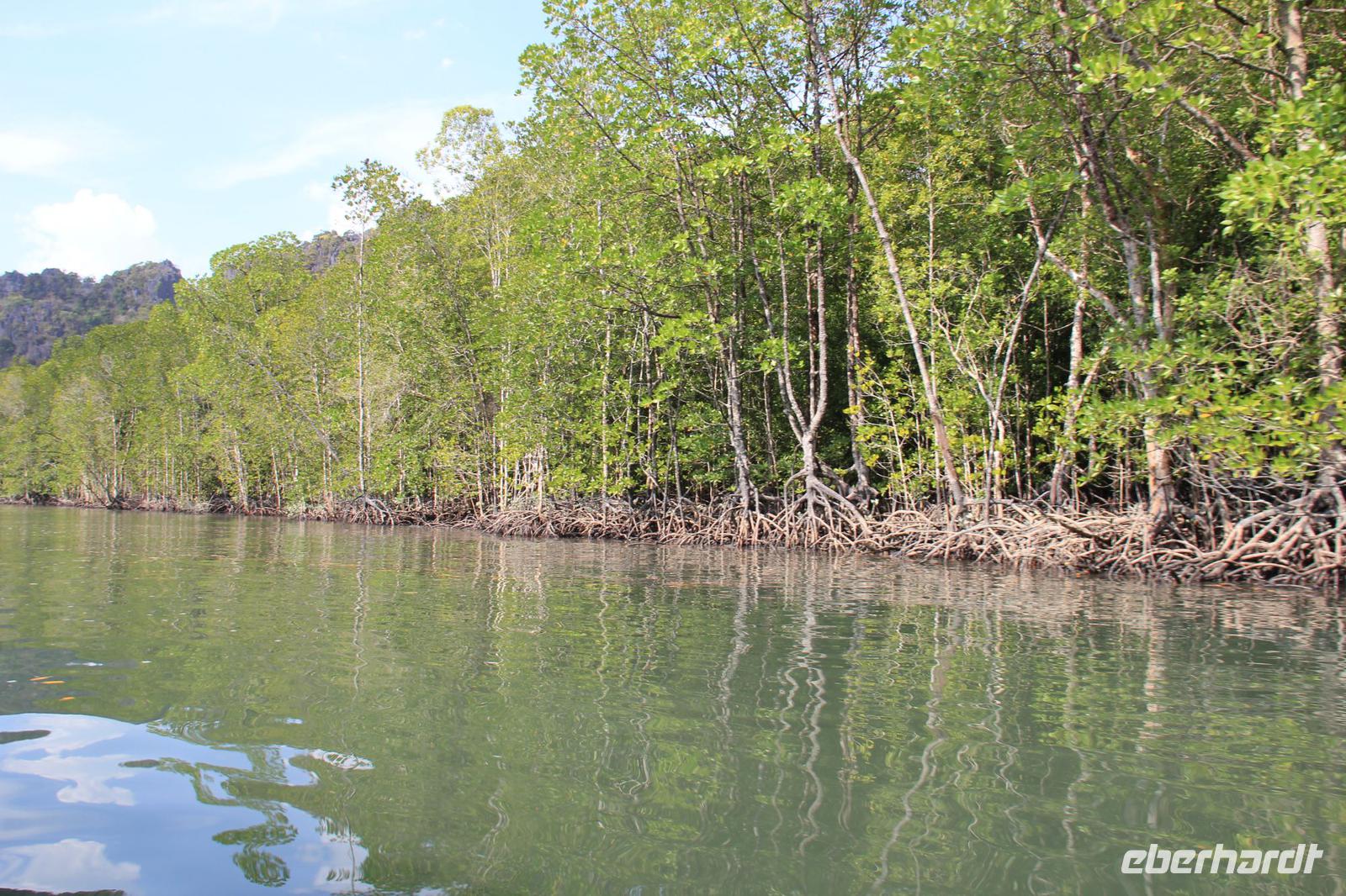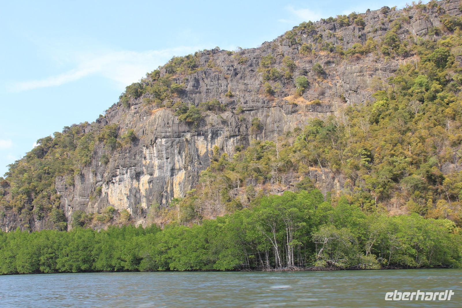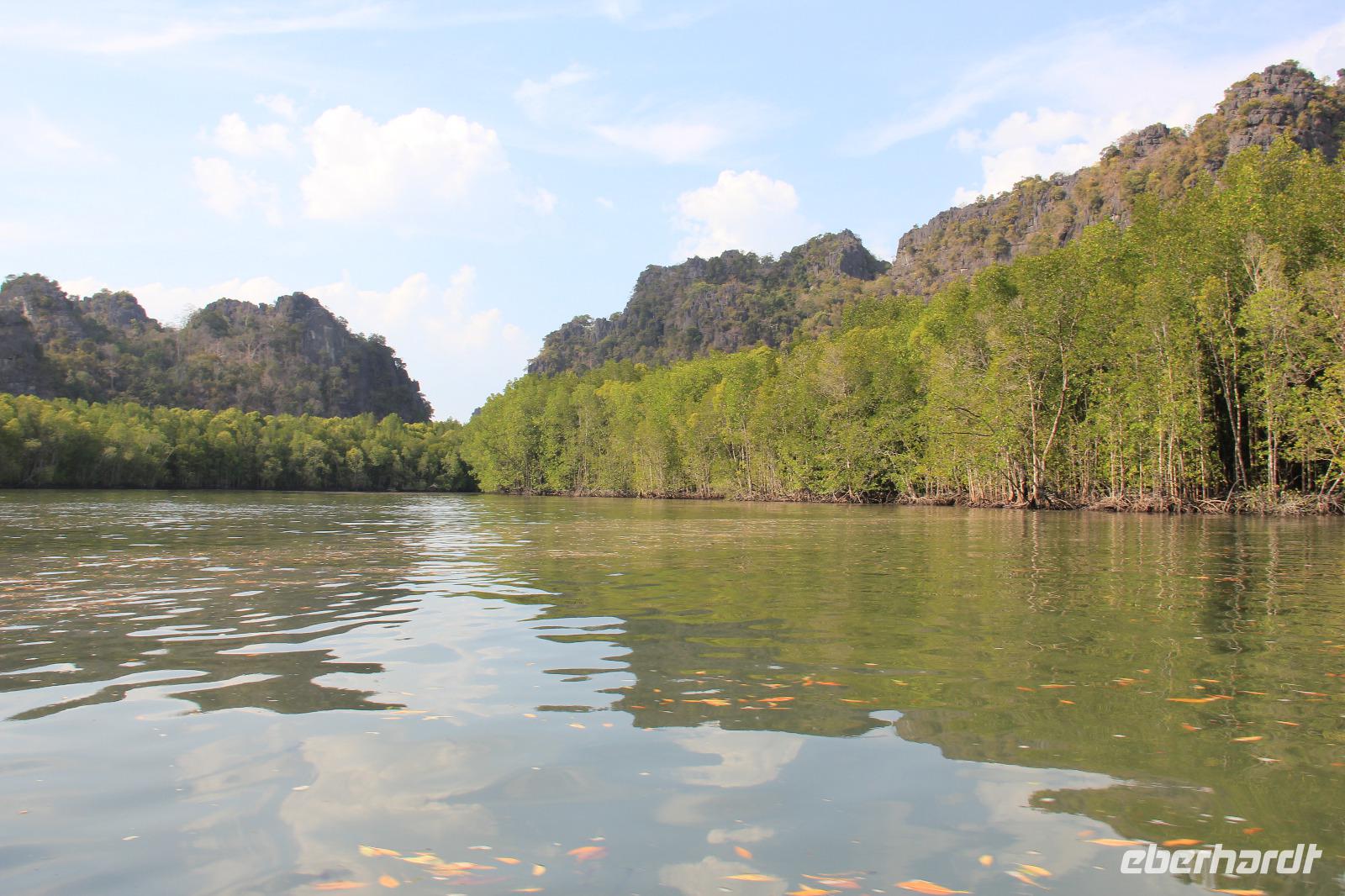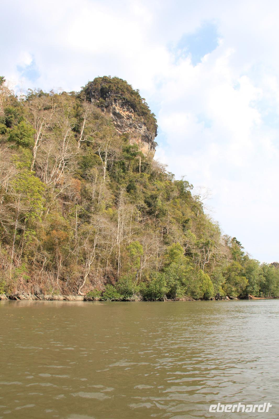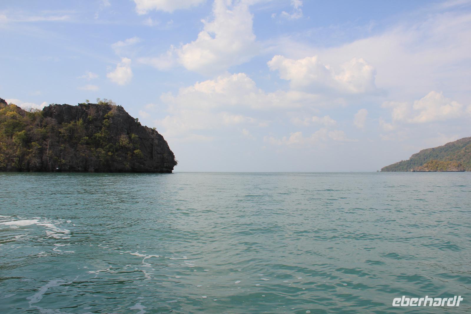 In unserem Boot genossen wir den Fahrtwind und die grüne Natur um uns herum. Die Felsen des durch die UNESCO geschützten Naturparks entstanden durch einen mehrere tausend Jahre zurückliegenden Monsun und wurden durch diesen aus dem Meer hochgetragen. Dadurch findet man auch heute noch auf den Gipfeln der Berge Fossilien von verschiedenen Fischen und Meeresbewohnern. Wir fuhren den Fluss entlang, bis wir zum offenen Meer kamen, wo der Andamenensee und die Straße von Malakka aufeinandertreffen.