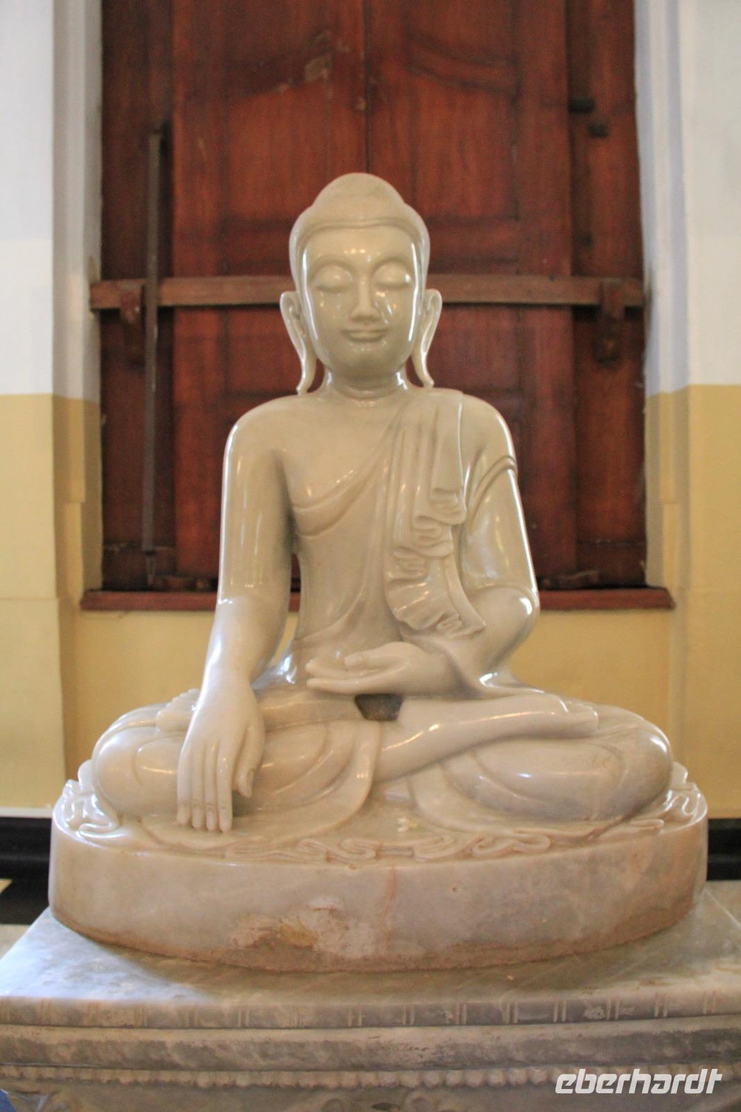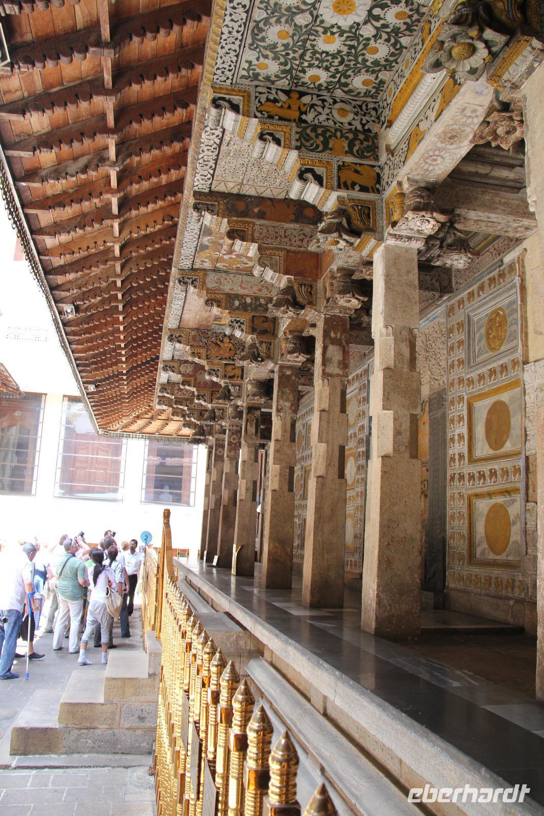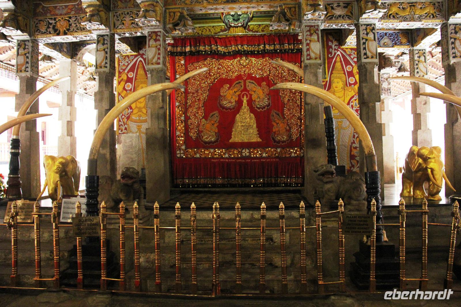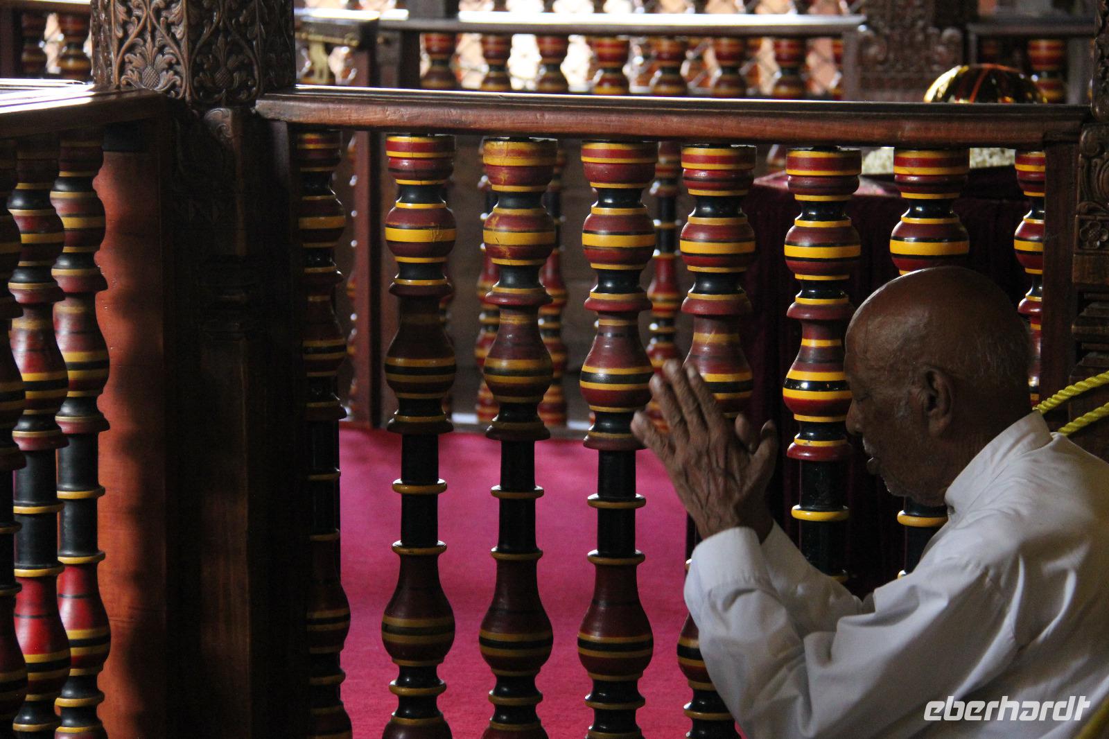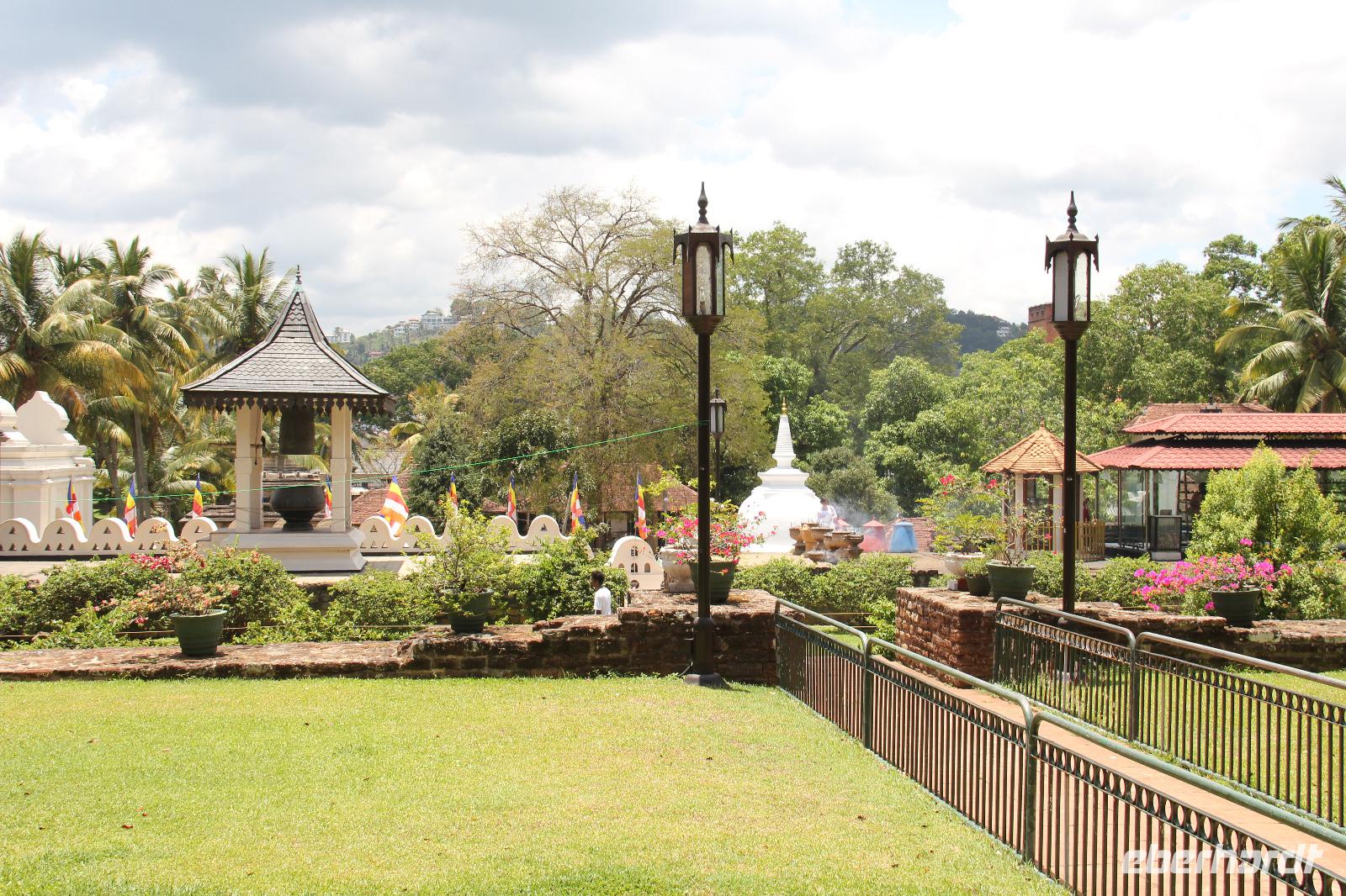 Die Zeit verging jedoch schnell und am späten Vormittag erreichen wir Kandy. Unser erstes Ziel war der bekannte Zahntempel, offiziell Sri Dalada Maligawa genannt, in welchem ein Zahn von Buddha liegen soll. Am Eingang des Tempels mussten alle ihre Schuhe ausziehen, weswegen die Mitnahme von einem Paar Socken nicht verkehrt war, denn der Fußboden der Anlage konnte sich vor allem draußen in der Sonne auch mal ganz schön heiß aufheizen. Gemeinsam mit dem örtlichen Reiseleiter erkundeten wir den Tempel und erfuhren mehr über die Zahnlegende sowie die Bedeutung von Kandy als religiöse Pilgerstätte. Verschiedenste Buddha Statuen sowie schön verzierte Säulen, Wände und Decken zieren die Anlage und machen seine Schönheit aus, obwohl er von außen eher schlicht wirkt.