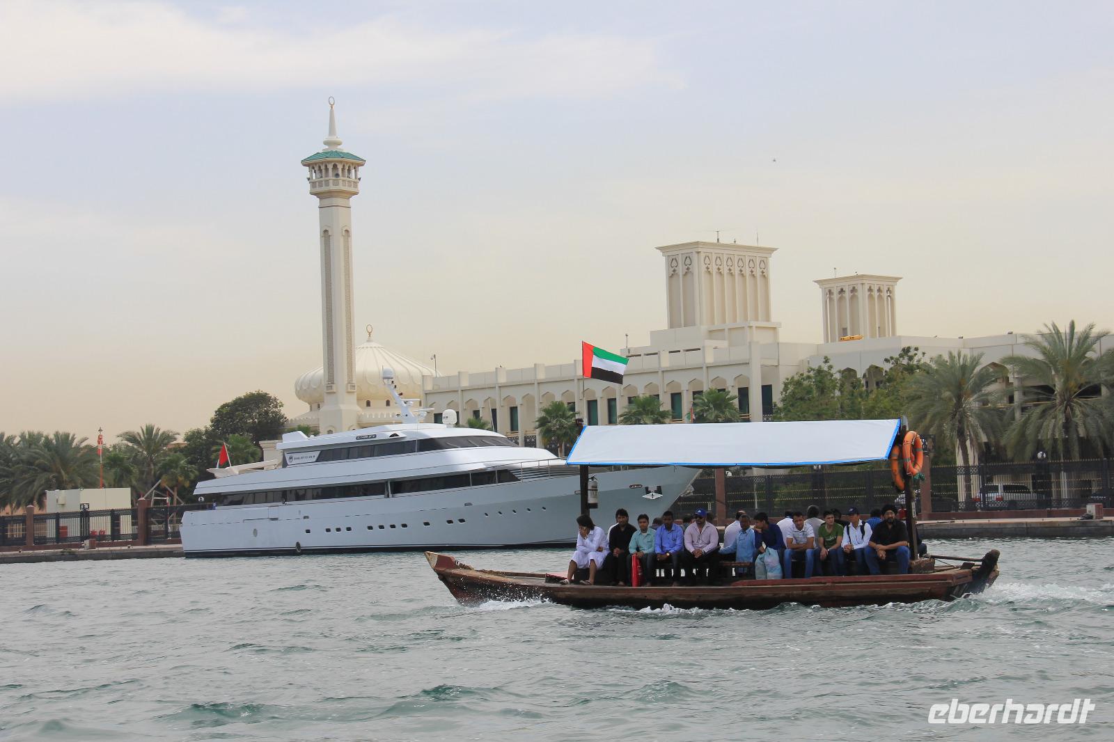 An diesem Morgen verließen wir die Mein Schiff 1, doch dies sollte noch nicht das Ende der Reise sein. So fuhren wir in unser Hotel ins historische Dubai. Zu Fuß ging es dann weiter zum gegenüberliegenden Dubai Museum, in welchem sehr schön und anschaulich die Geschichte des Landes dargestellt wird. Danach gingen wir zum Stoff Souk, welcher am Ufer des Creeks liegt. Nach etwas Freizeit nahmen wir uns eine Abra, ein hiesiges Wassertaxi, und setzen auf die andere Seite des Flusses über. Hier besichtigten wir zuerst den Gewürz Souk. Auf diesem kann man neben vielen Gewürzen auch Vanilleschoten oder verschiedene Datteln kaufen. Weiter ging es durch die Straßen zum Gold Souk, wo unter anderem der größte Goldring der Welt zu bestaunen ist.