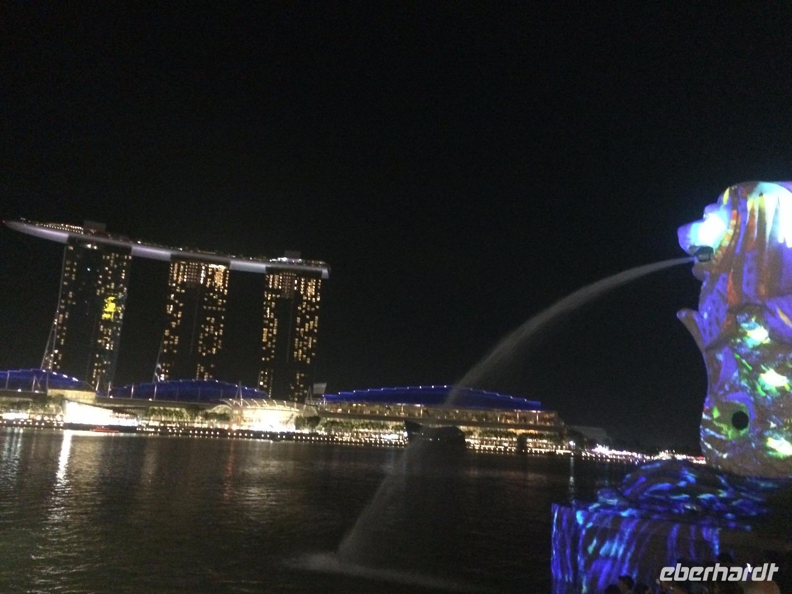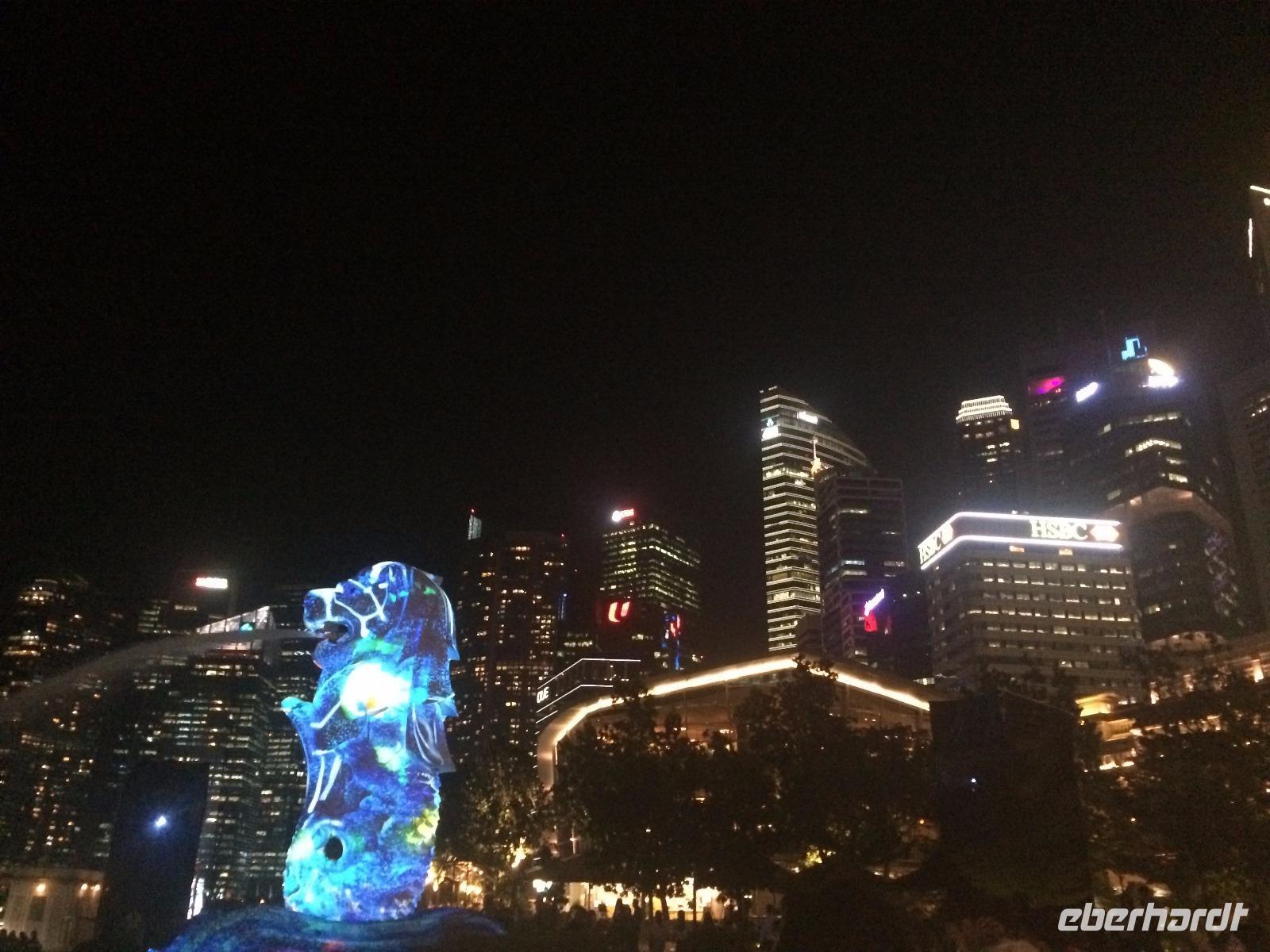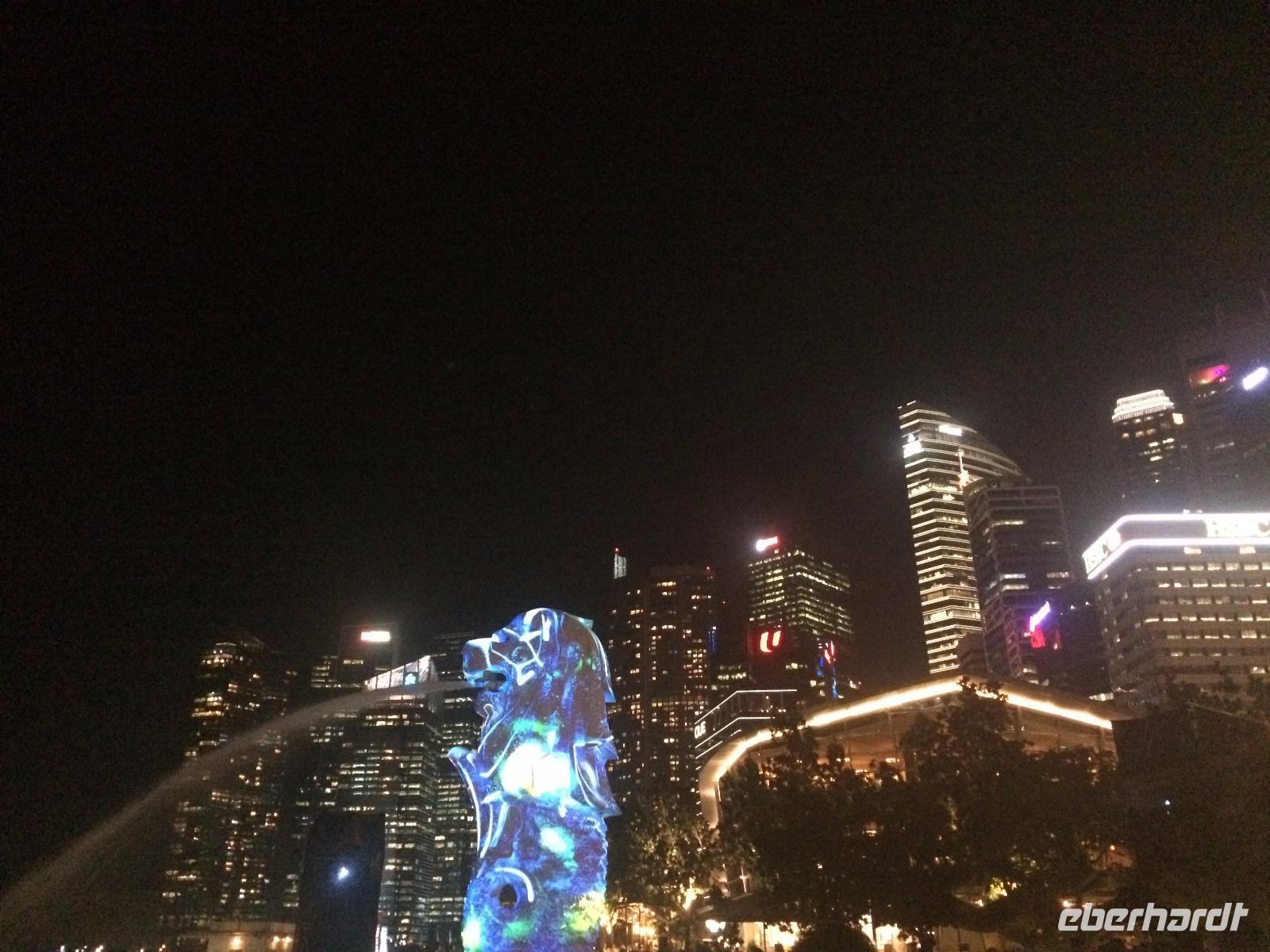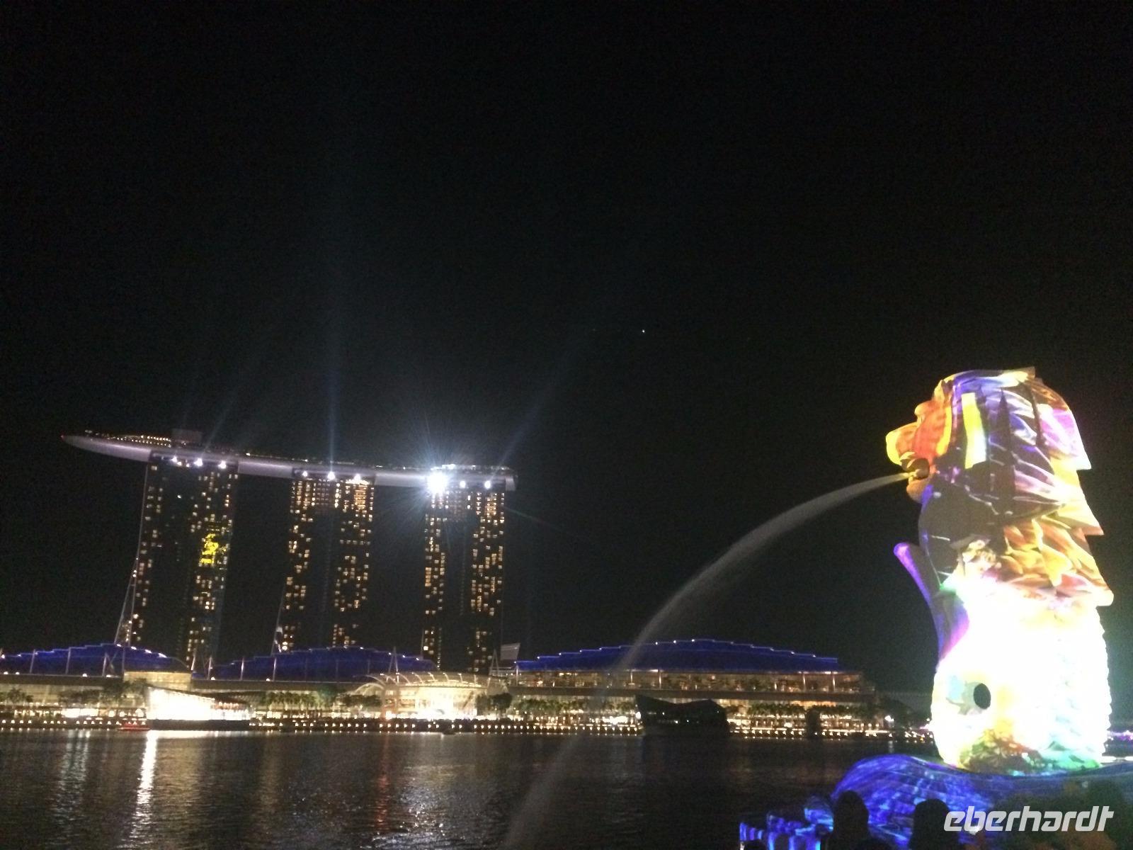 Viel Geduld, erst am Flughafen, dann 12 Stunden im Flugzeug, mussten wir schon mitbringen, bevor wir endlich in Singapur ankamen. Schon in den ersten Minuten auf dem Weg zum Hotel konnten wir aber feststellen: Das Warten hat sich gelohnt, denn diese Stadt wird uns sicher beeindrucken. Und so zogen wir sofort los, zum Clarque Quay, wo das Nachtleben erst erwachen musste und weiter am Fluss entlang, manche gar bis zum Wahrzeichen Merlion. Heute wurde die Statue aus Löwe und Fisch Mittelpunkt einer atmosphärischen Lichtshow, denn in Singapur fand gerade ein Lichtfestival statt! Ergriffen von diesem Willkommensgruß der Stadt war es dann aber doch Zeit, zum Hotel zurück zu kehren.