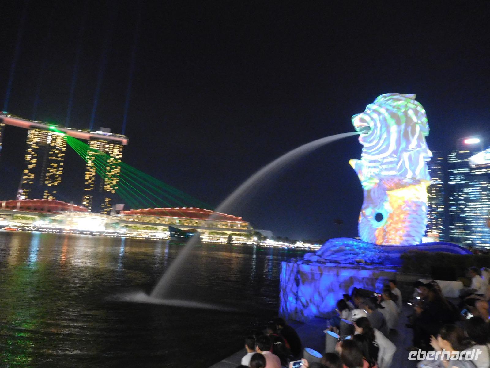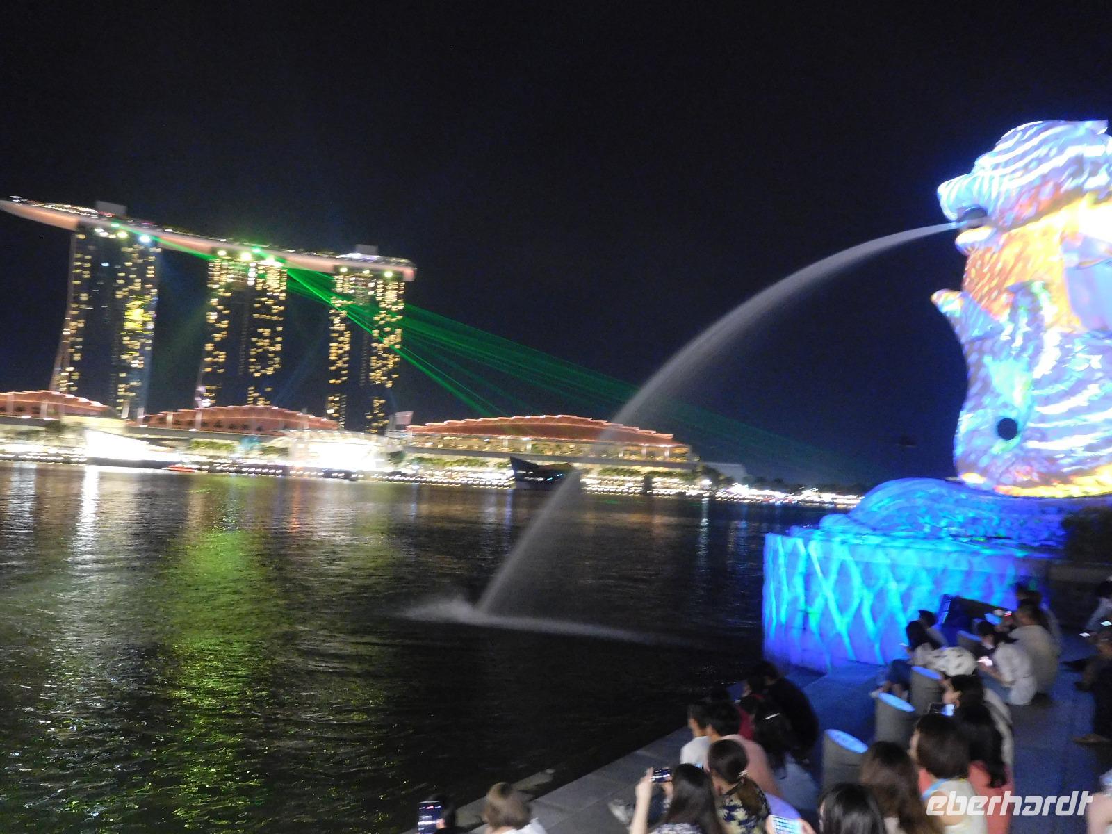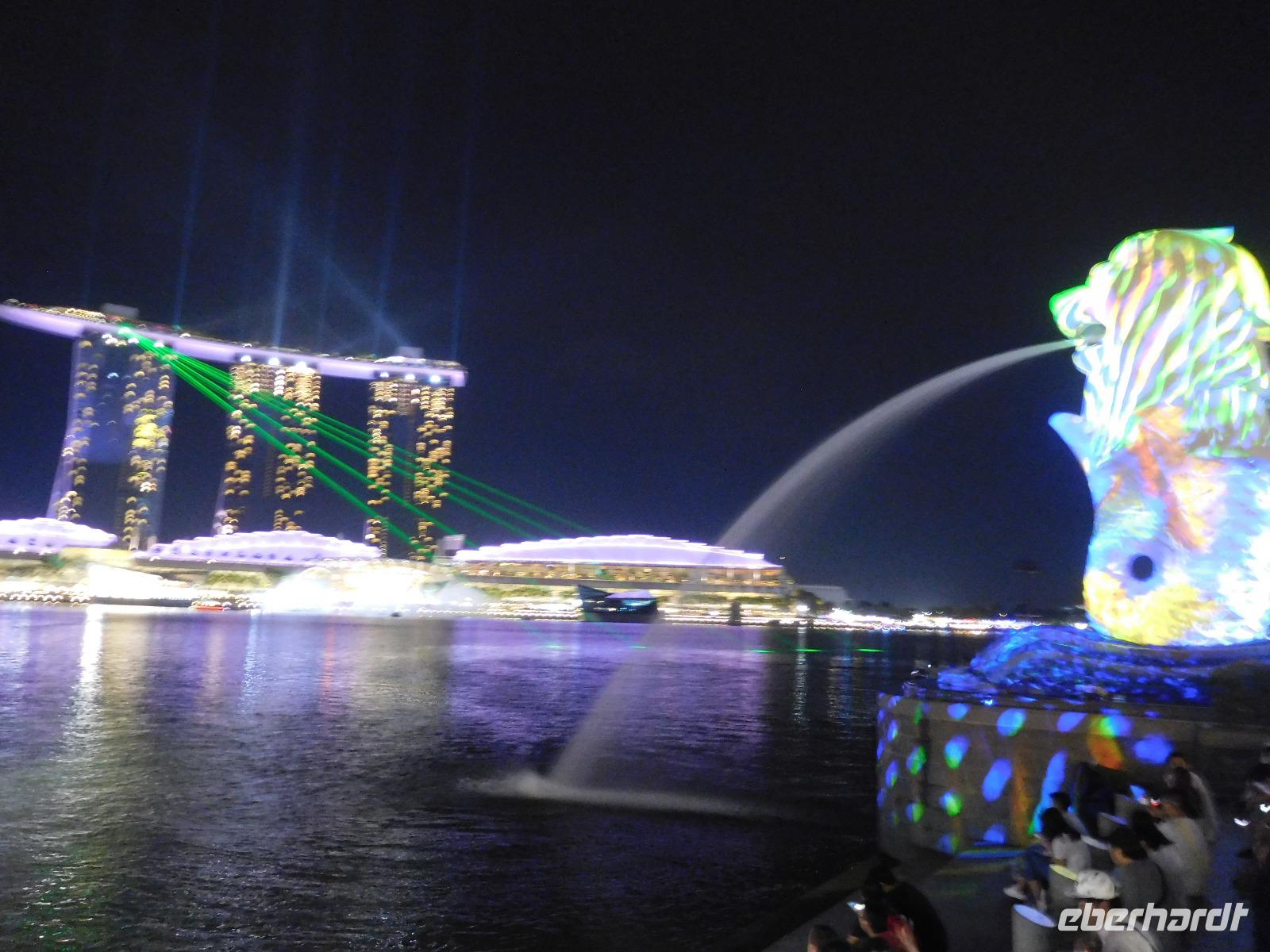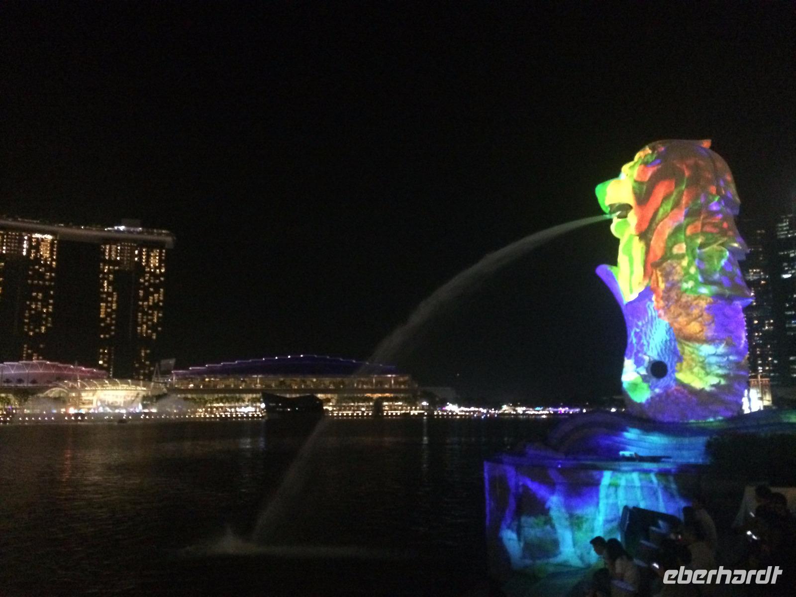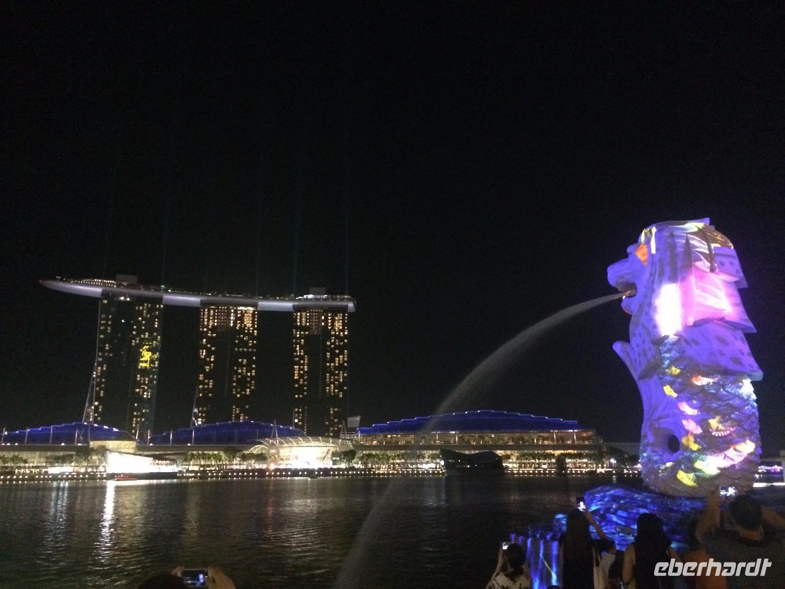Viel Geduld, erst am Flughafen, dann 12 Stunden im Flugzeug, mussten wir schon mitbringen, bevor wir endlich in Singapur ankamen. Schon in den ersten Minuten auf dem Weg zum Hotel konnten wir aber feststellen: Das Warten hat sich gelohnt, denn diese Stadt wird uns sicher beeindrucken. Und so zogen wir sofort los, zum Clarque Quay, wo das Nachtleben erst erwachen musste und weiter am Fluss entlang, manche gar bis zum Wahrzeichen Merlion. Heute wurde die Statue aus Löwe und Fisch Mittelpunkt einer atmosphärischen Lichtshow, denn in Singapur fand gerade ein Lichtfestival statt! Ergriffen von diesem Willkommensgruß der Stadt war es dann aber doch Zeit, zum Hotel zurück zu kehren.