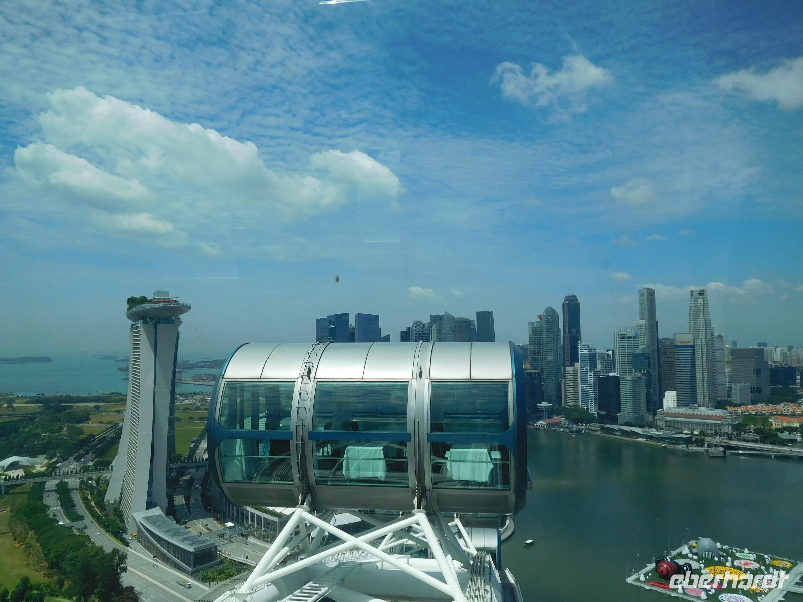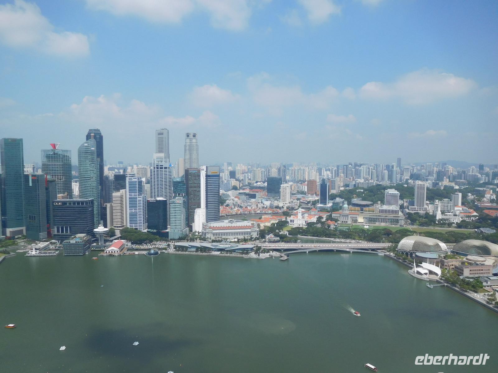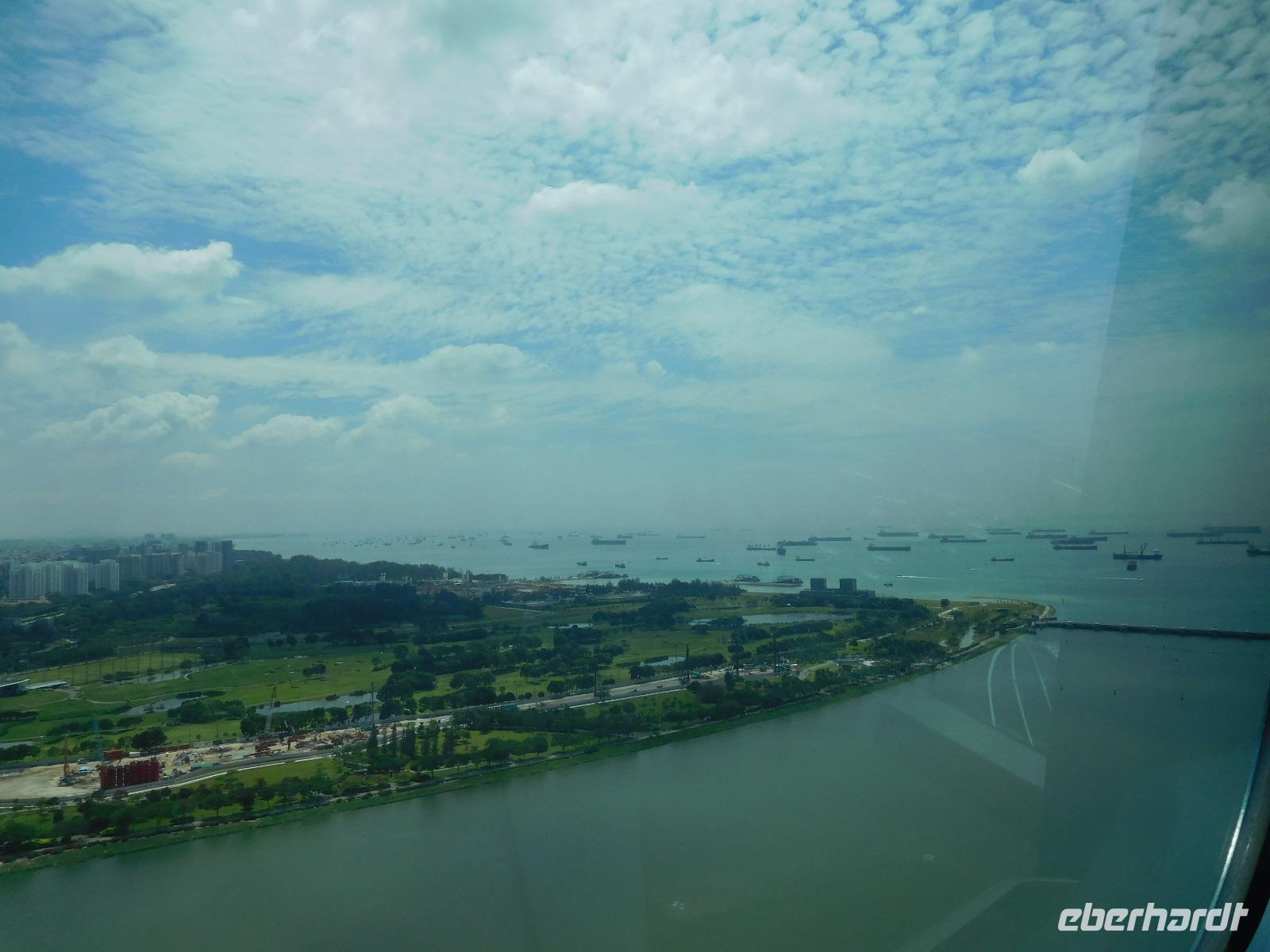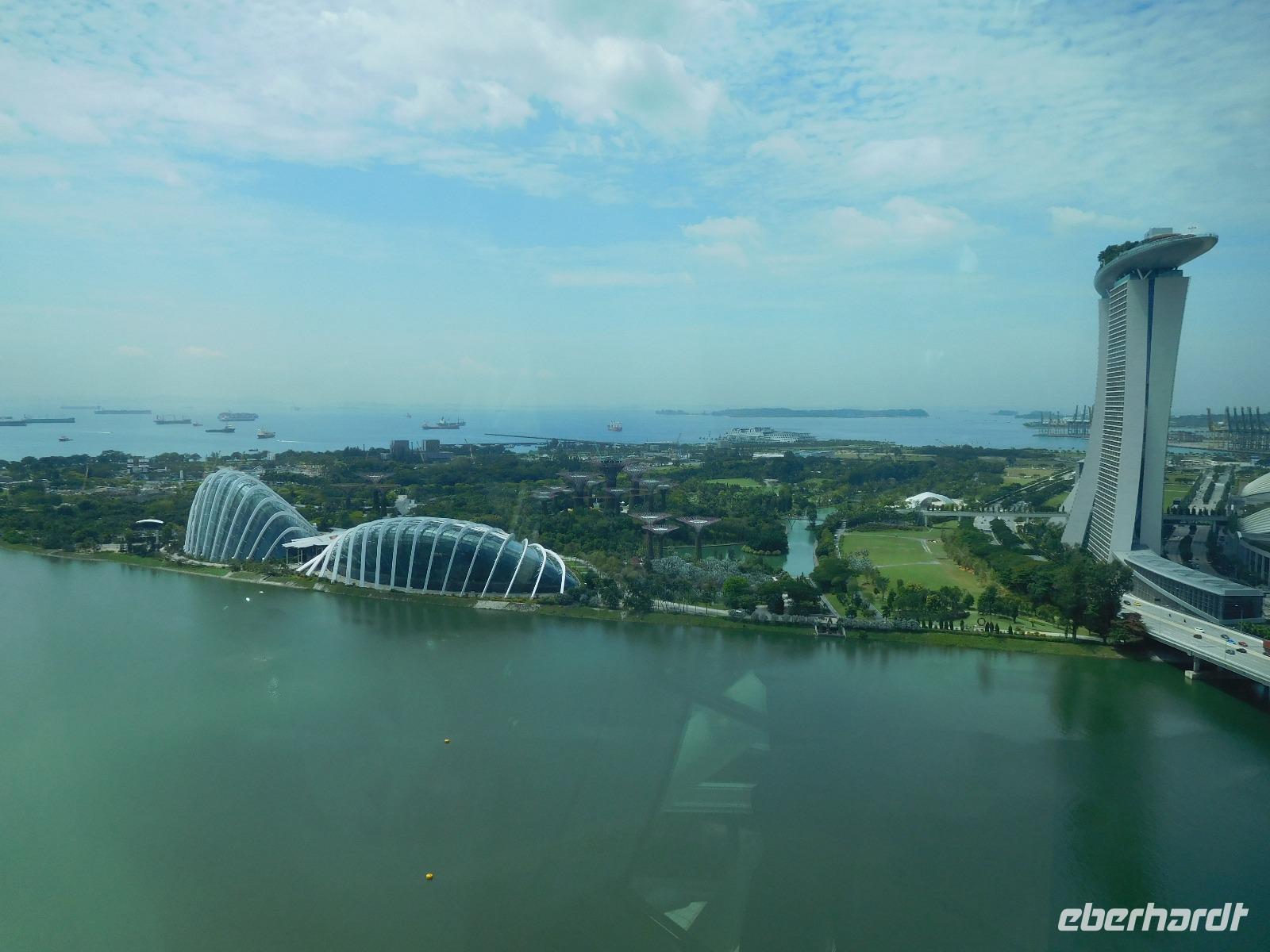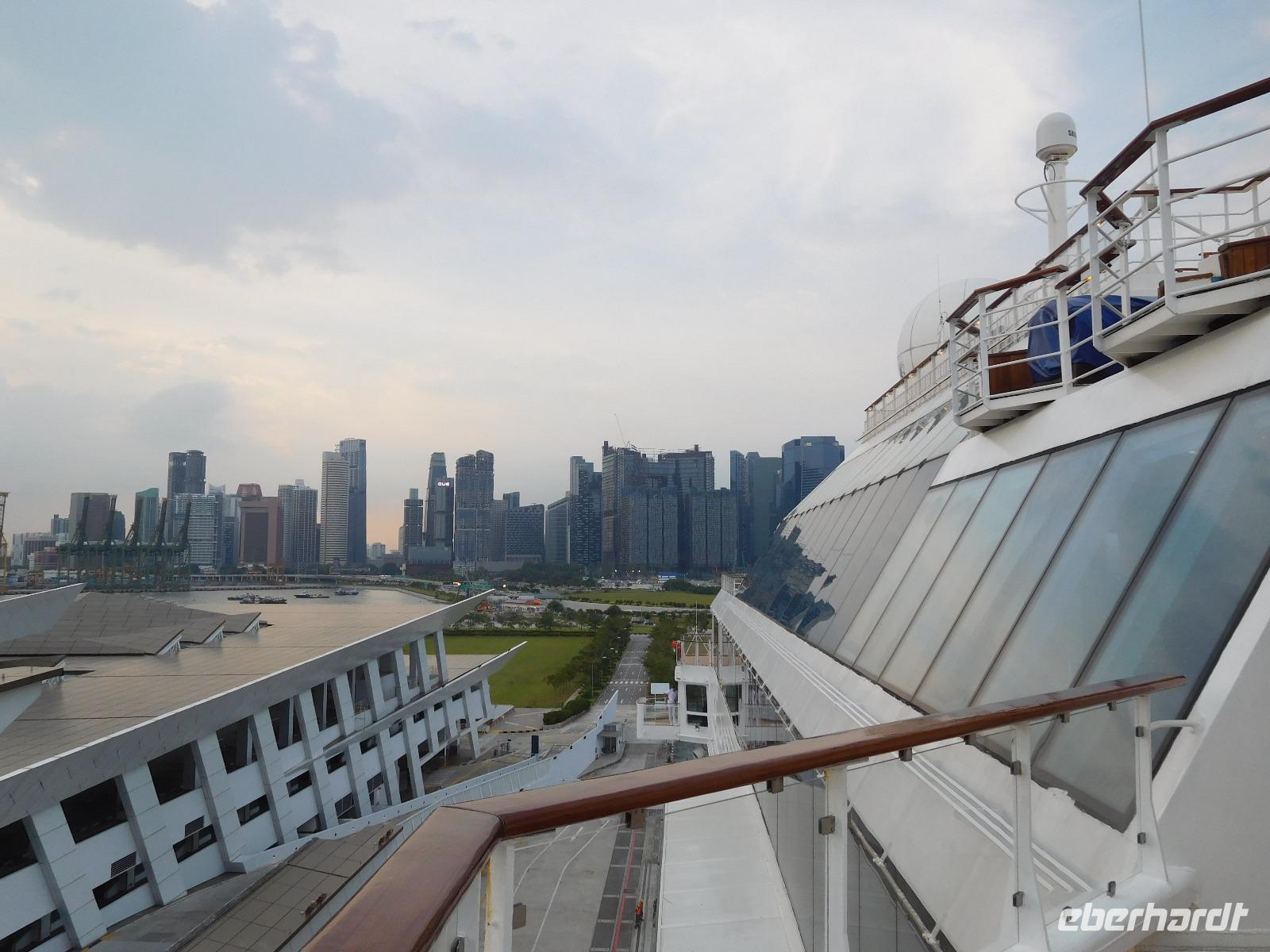 Viel hatten wir in den letzten Tagen schon von Singapur sehen dürfen, nun konnte jeder noch das sehen, was er gern wollte. Manche zog es in den Dschungel, manche zum Erholungsschlaf an Bord, wieder andere genossen einen Singapore Sling im dafür berühmten Raffles Hotel - und wir fuhren hinauf auf das Marina Bay Sands Hotel. Von dessen Aussichtsplattform konnten wir einen spektakulären Blick auf die Skyline von Singapur, den Singapore Flyer und das Hafengelände genießen. Wie der berühmte Infinity Pool aussieht, konnten wir leider nur erahnen, da dessen Gäste dank eines Sichtschutzes von unseren neugierigen Blicken geschützt wurden.