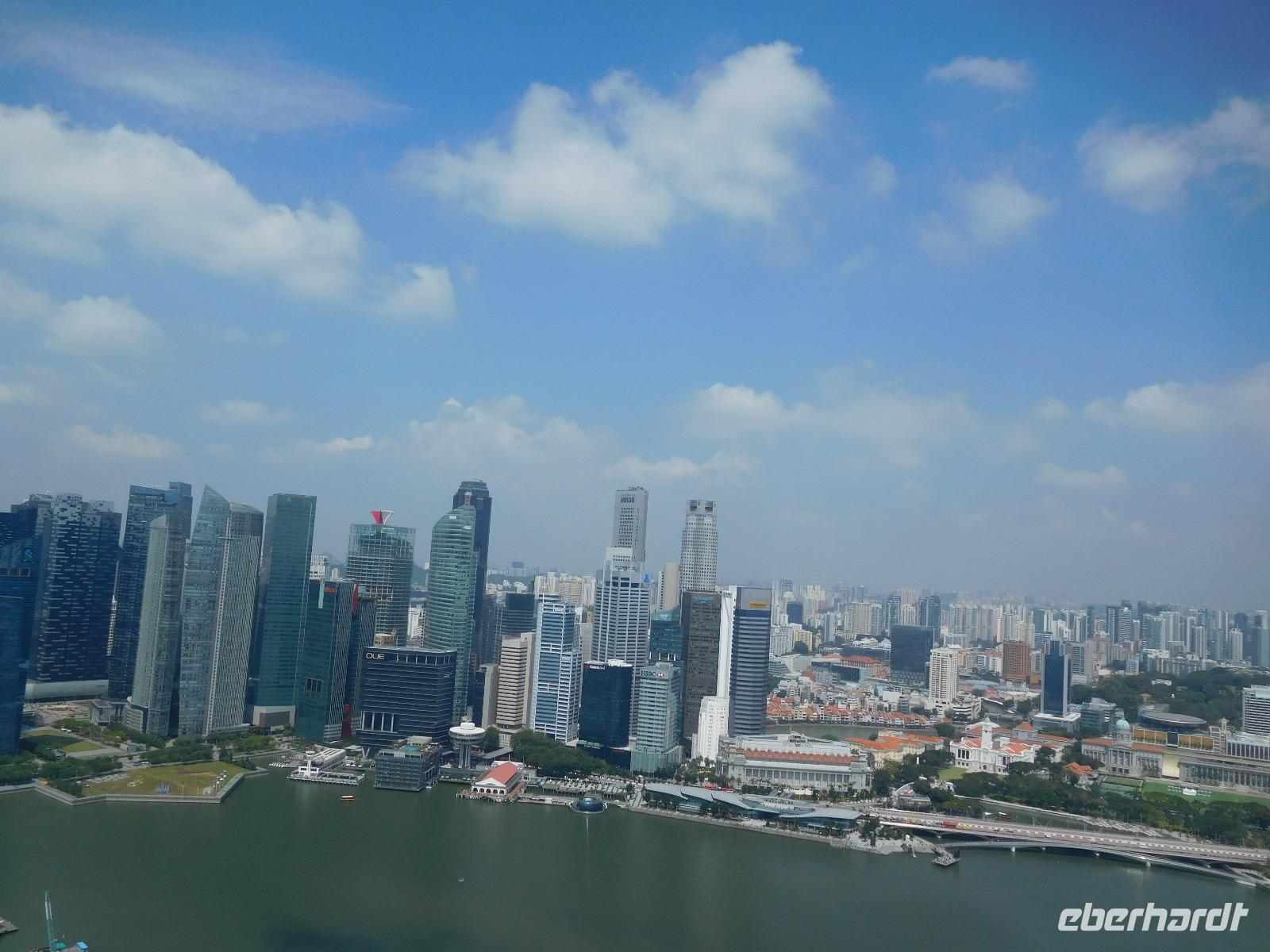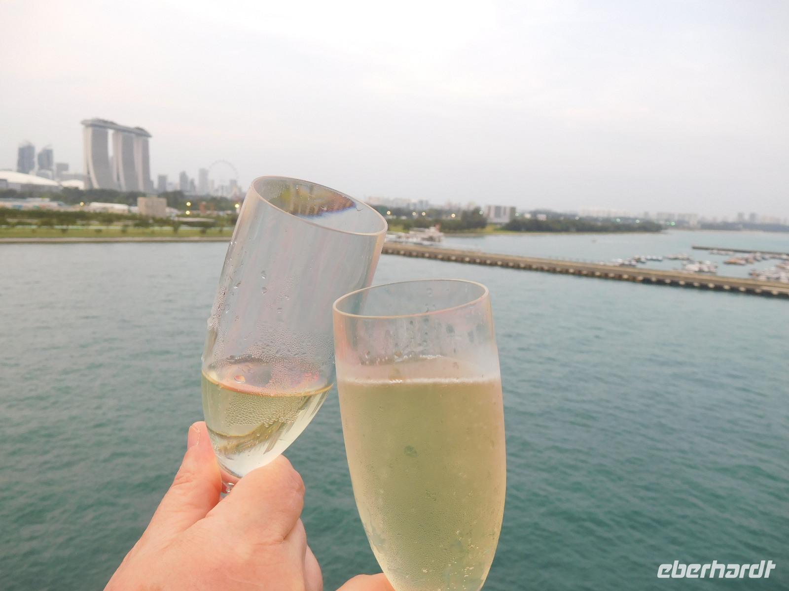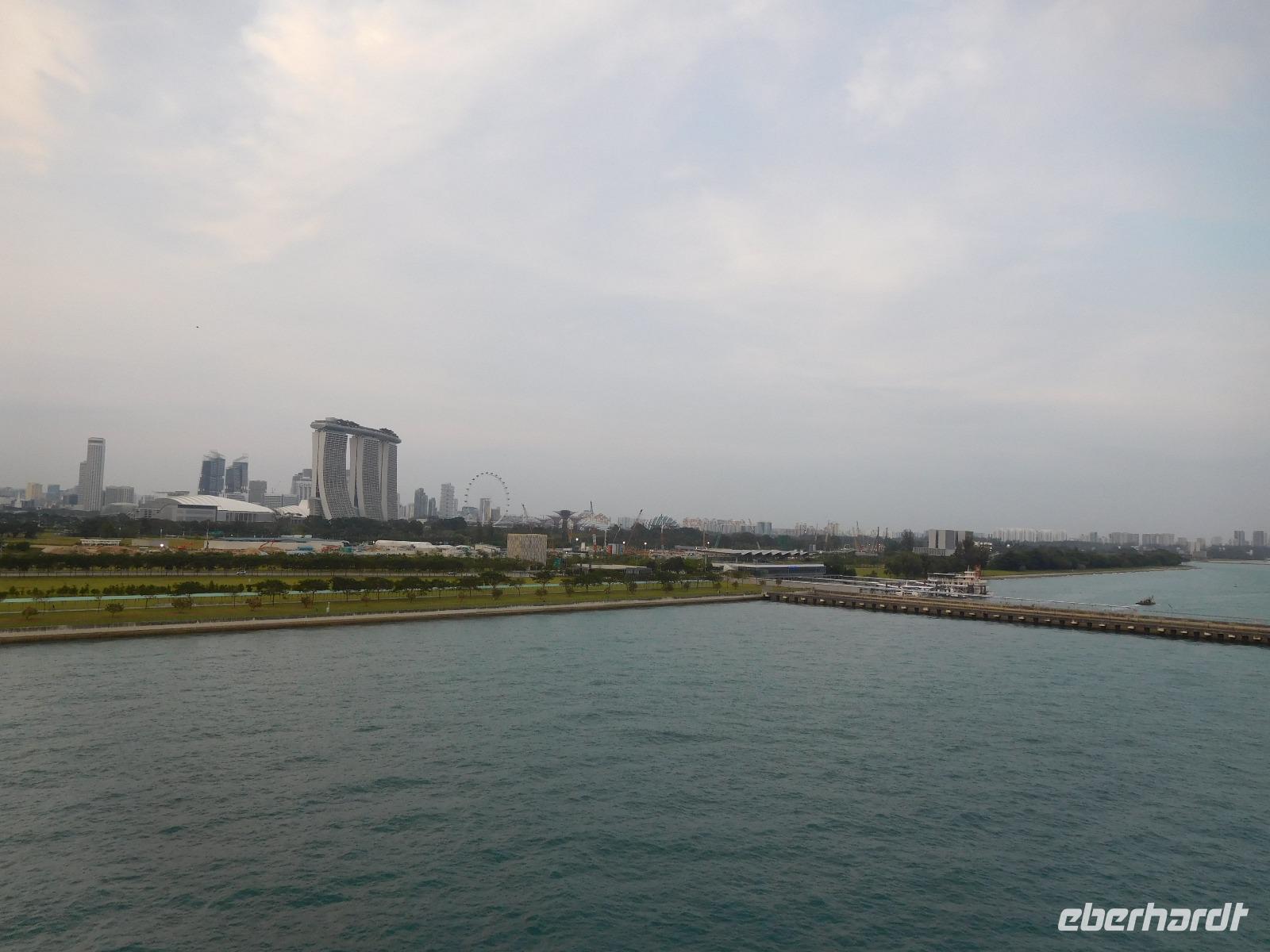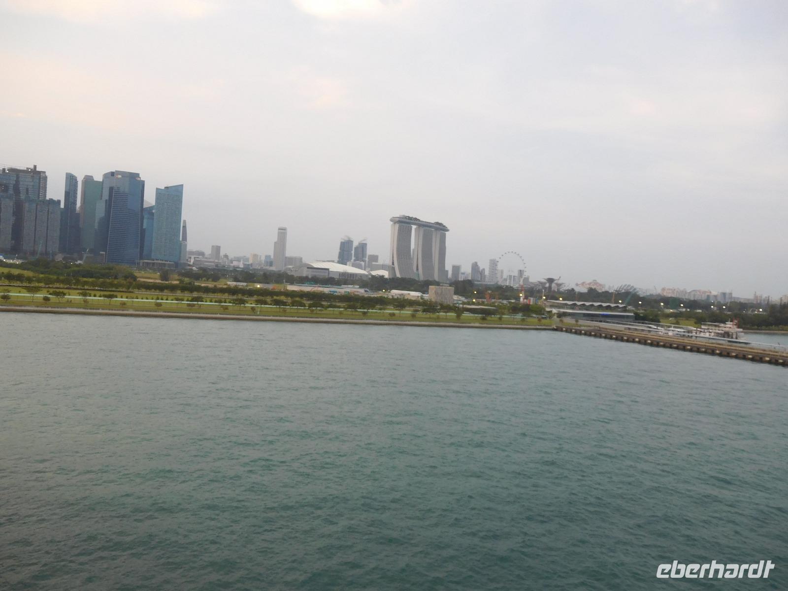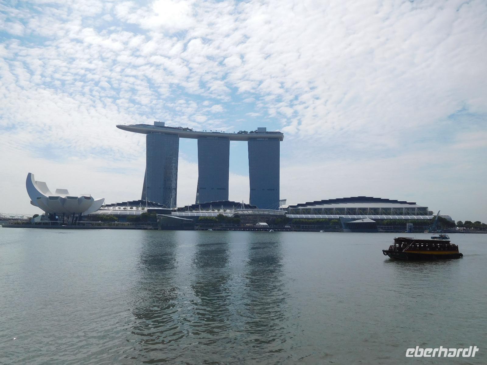 Viel hatten wir in den letzten Tagen schon von Singapur sehen dürfen, nun konnte jeder noch das sehen, was er gern wollte. Manche zog es in den Dschungel, manche zum Erholungsschlaf an Bord, wieder andere genossen einen Singapore Sling im dafür berühmten Raffles Hotel - und wir fuhren hinauf auf das Marina Bay Sands Hotel. Von dessen Aussichtsplattform konnten wir einen spektakulären Blick auf die Skyline von Singapur, den Singapore Flyer und das Hafengelände genießen. Wie der berühmte Infinity Pool aussieht, konnten wir leider nur erahnen, da dessen Gäste dank eines Sichtschutzes von unseren neugierigen Blicken geschützt wurden.