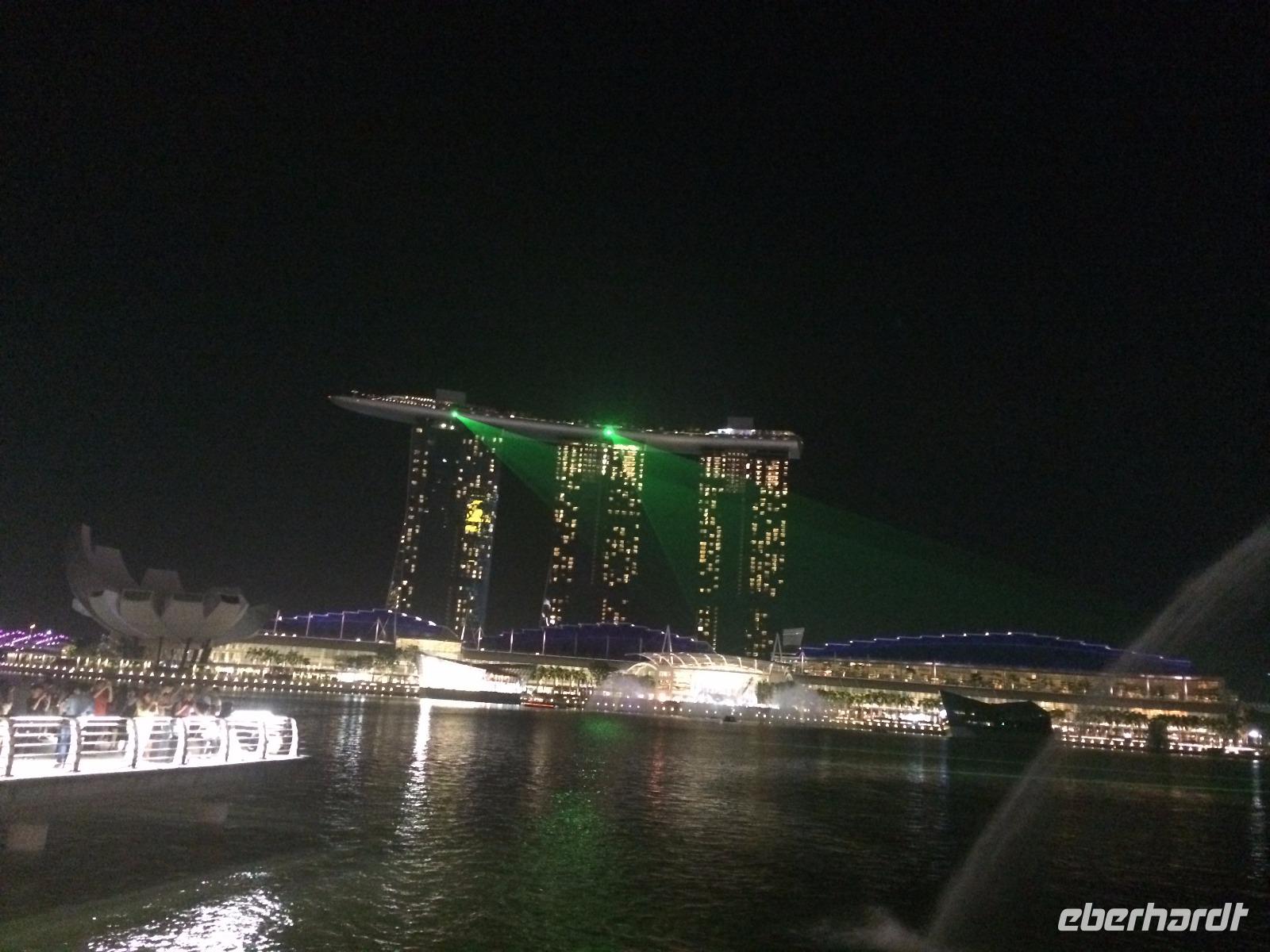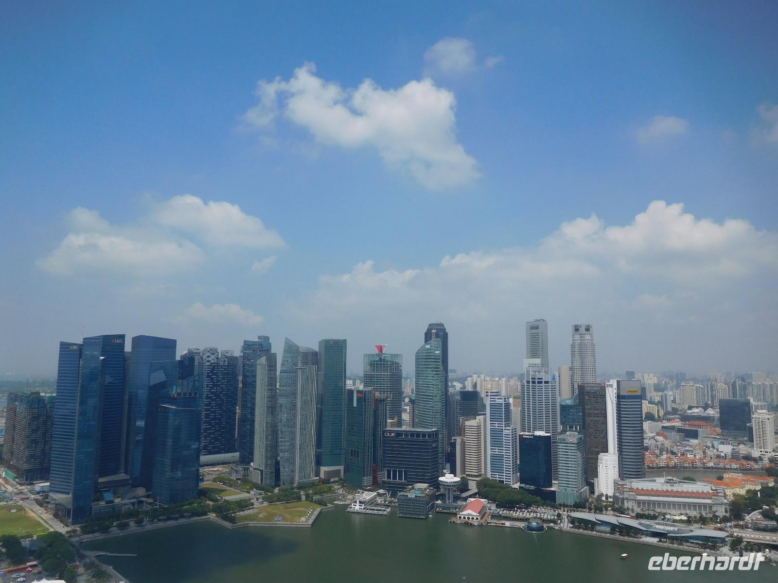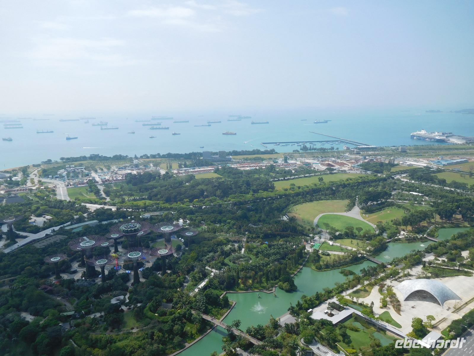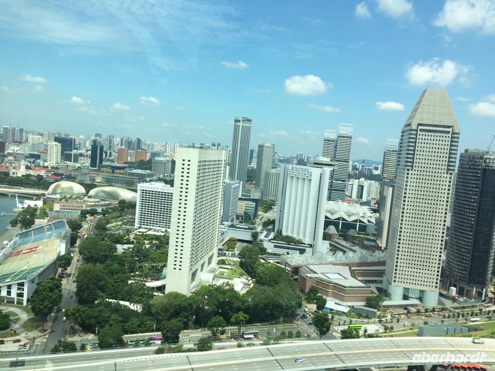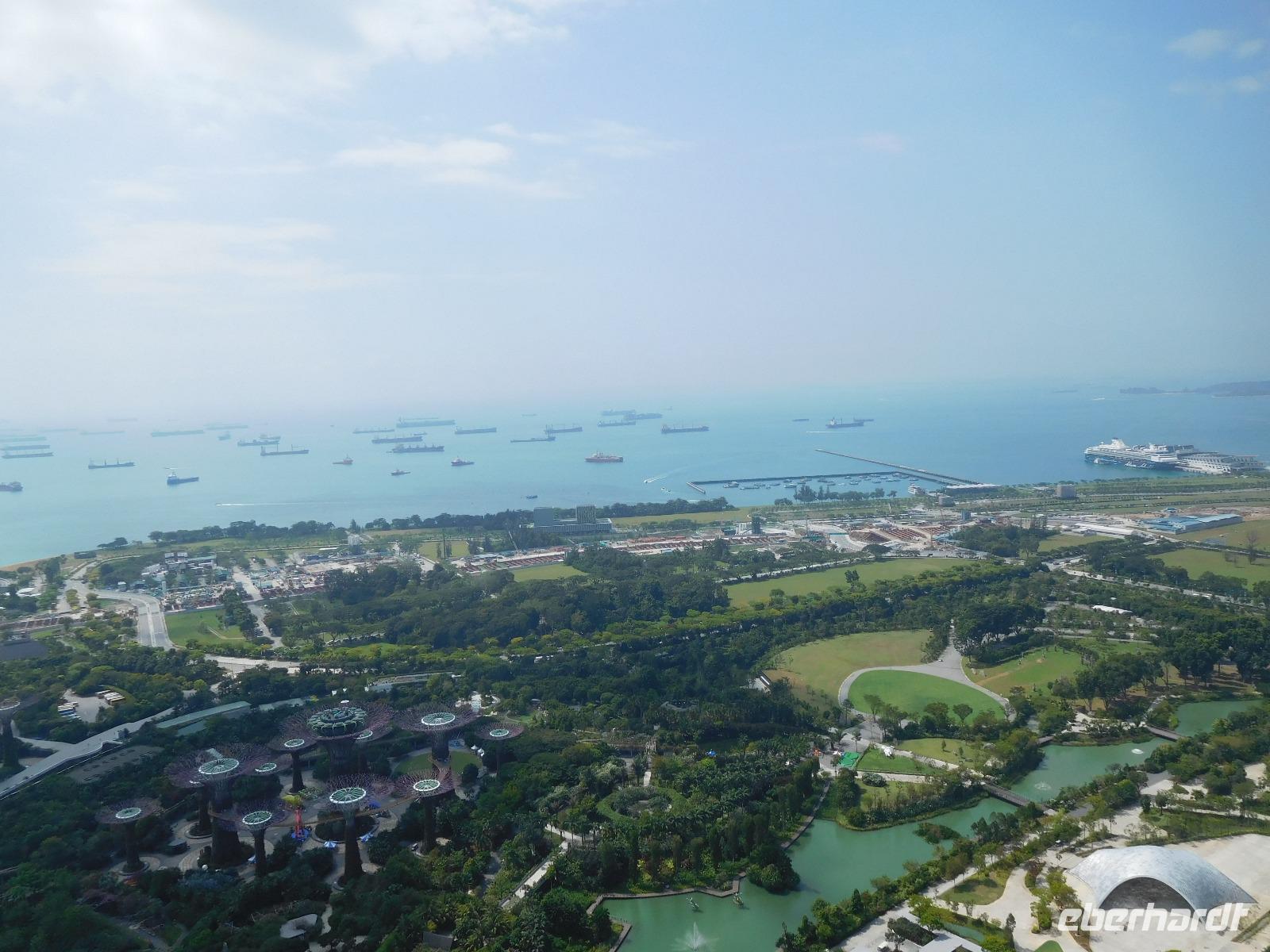 Viel hatten wir in den letzten Tagen schon von Singapur sehen dürfen, nun konnte jeder noch das sehen, was er gern wollte. Manche zog es in den Dschungel, manche zum Erholungsschlaf an Bord, wieder andere genossen einen Singapore Sling im dafür berühmten Raffles Hotel - und wir fuhren hinauf auf das Marina Bay Sands Hotel. Von dessen Aussichtsplattform konnten wir einen spektakulären Blick auf die Skyline von Singapur, den Singapore Flyer und das Hafengelände genießen. Wie der berühmte Infinity Pool aussieht, konnten wir leider nur erahnen, da dessen Gäste dank eines Sichtschutzes von unseren neugierigen Blicken geschützt wurden.