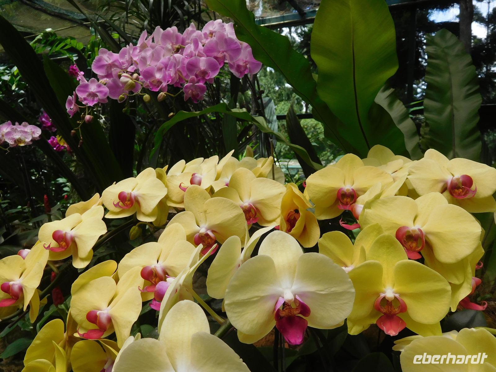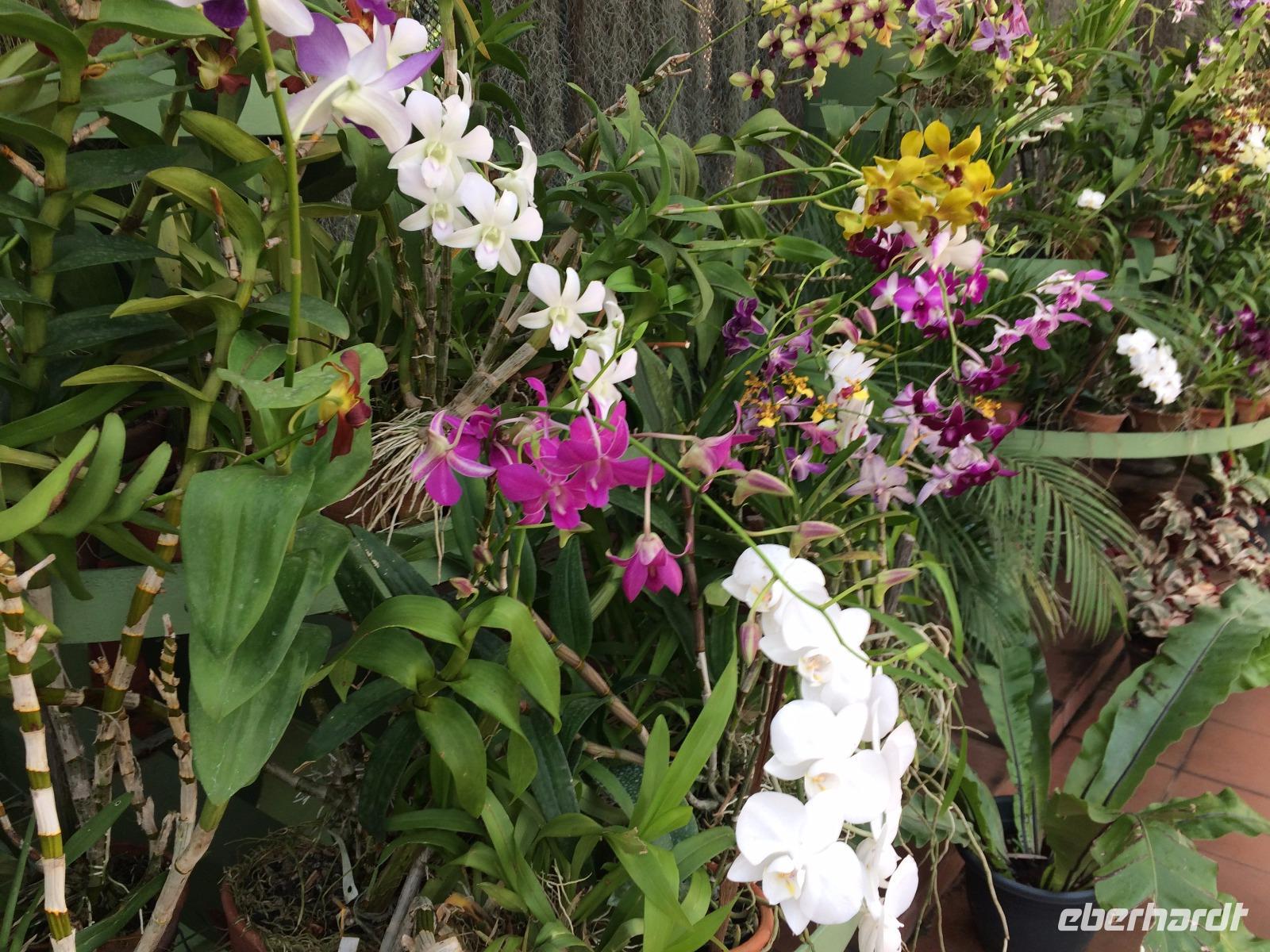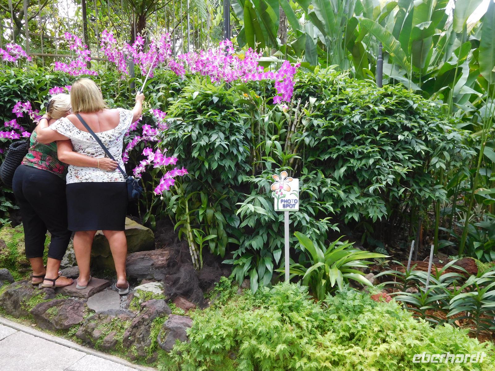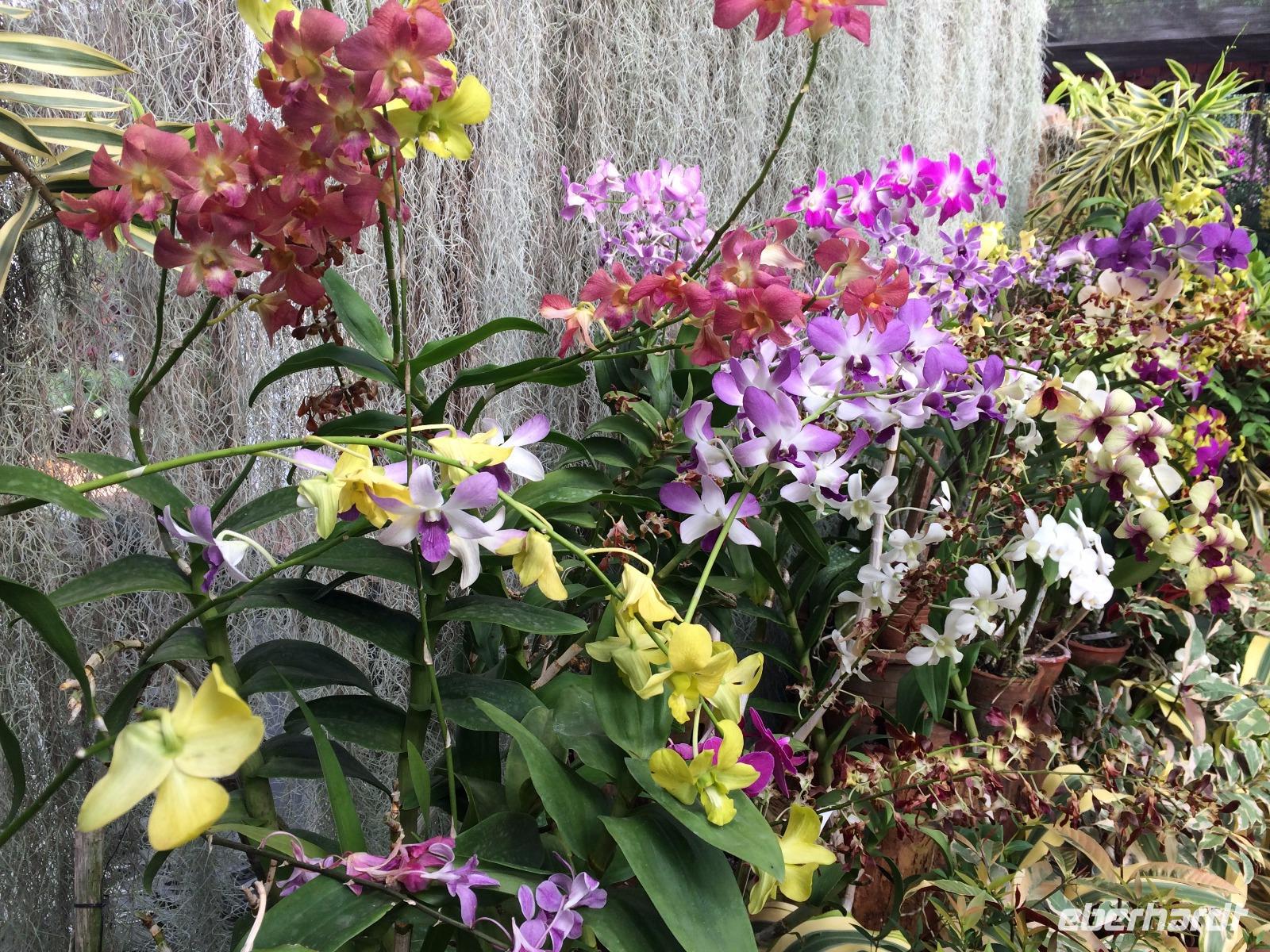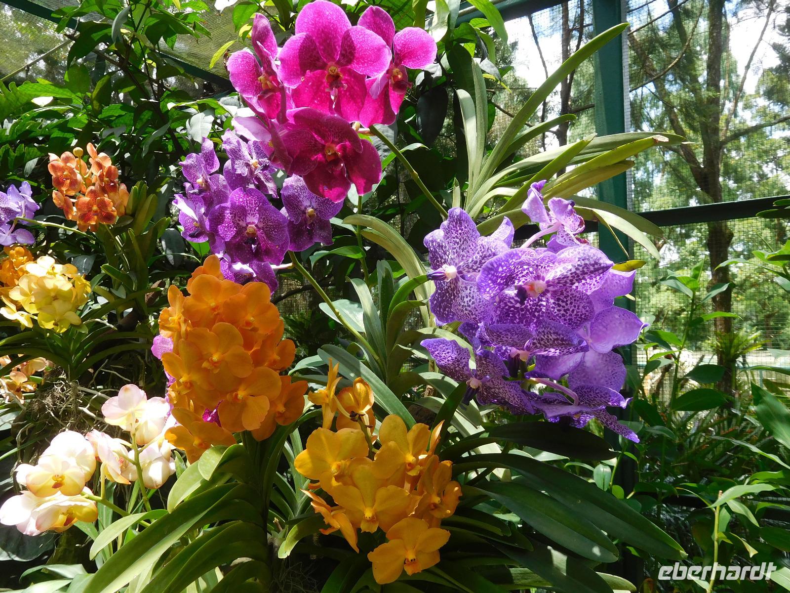 Aber nicht nur Glas und grauer Beton begeistern in Singapur, sondern die vielen Pflanzen, die man nicht nur in Parks und an der Straße, sondern auch an den Fassaden wachsen. Deswegen mussten wir auch in den Orchid Garden, wo unzählige farbenfrohe Orchideen gedeihen.
