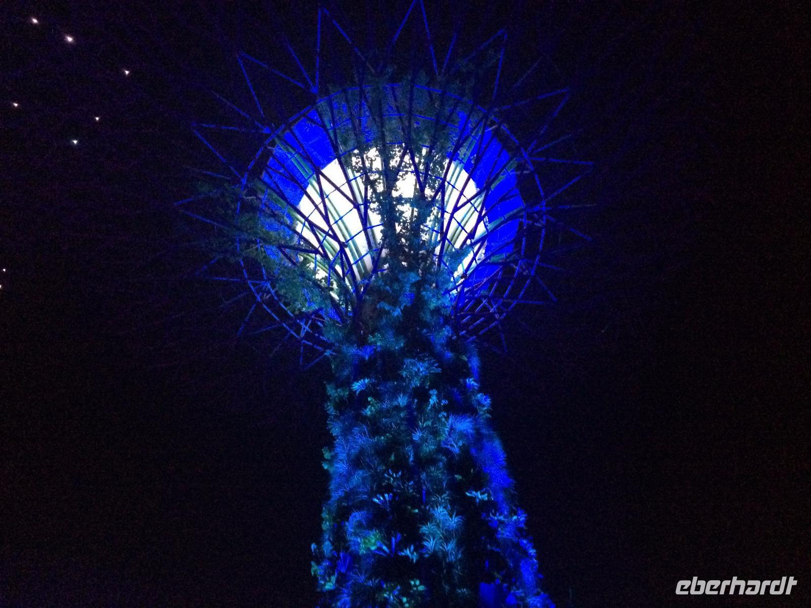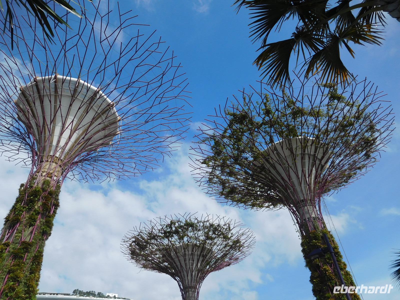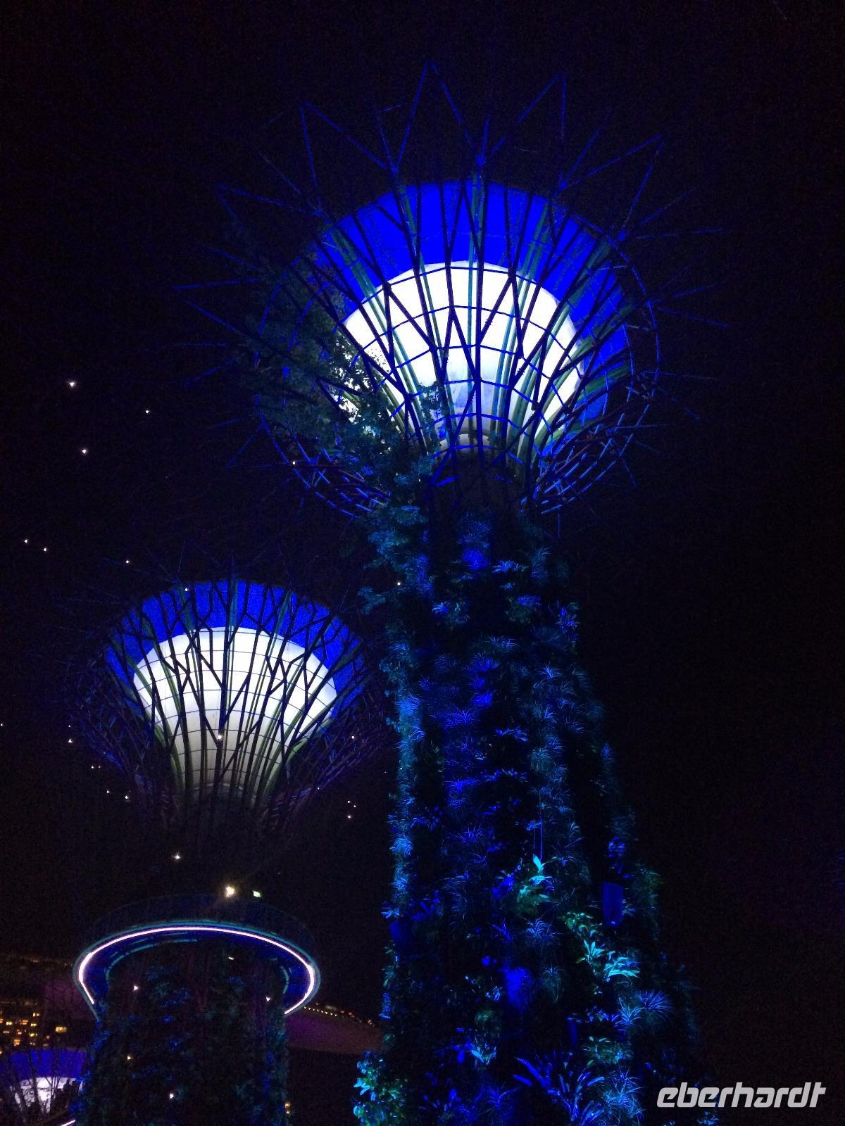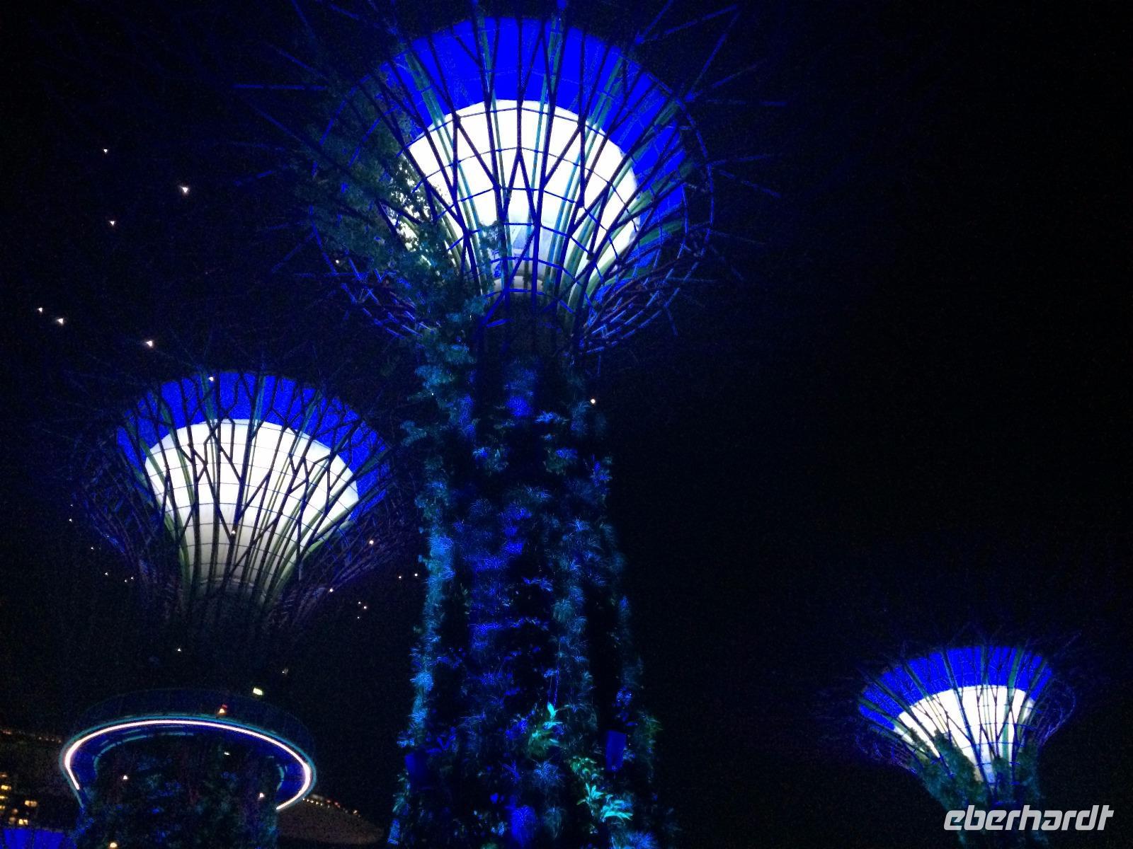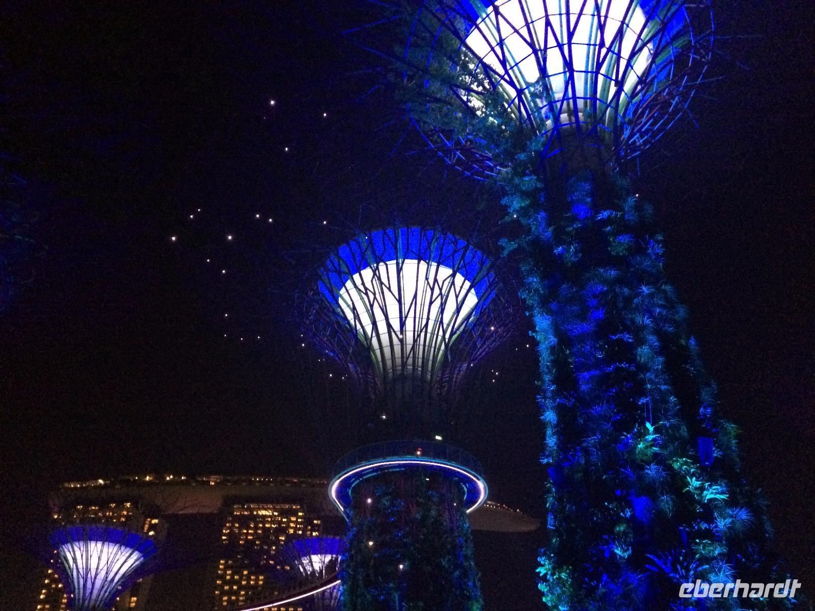 Draußen, in der wohligen Wärme Südostasiens, standen geduldig die eigentlichen Stars der Gardens by the Bay: Die Supertrees. Entlang der Beton- und Stahlkonstruktion, die Kraftwerk, Schornstein und Bar beherbergen, wachsen allerlei Farne und Moose. Ein Skywalk verbindet die Supertrees zu einem Waldspaziergang der Extraklasse.