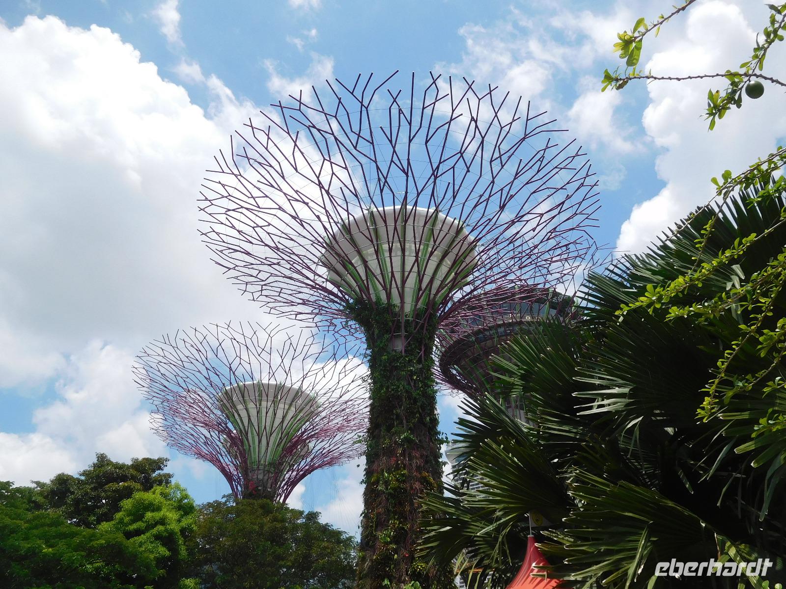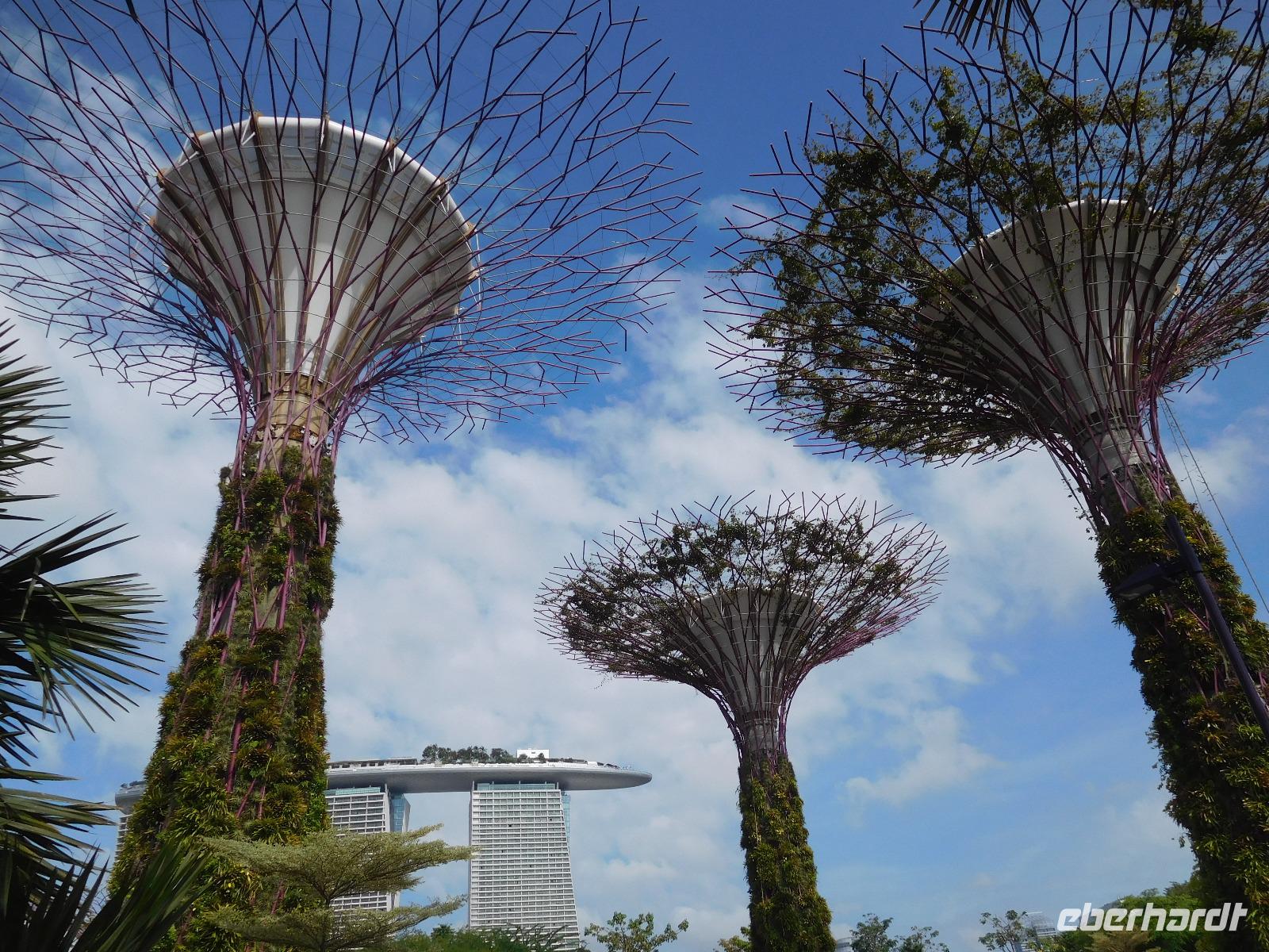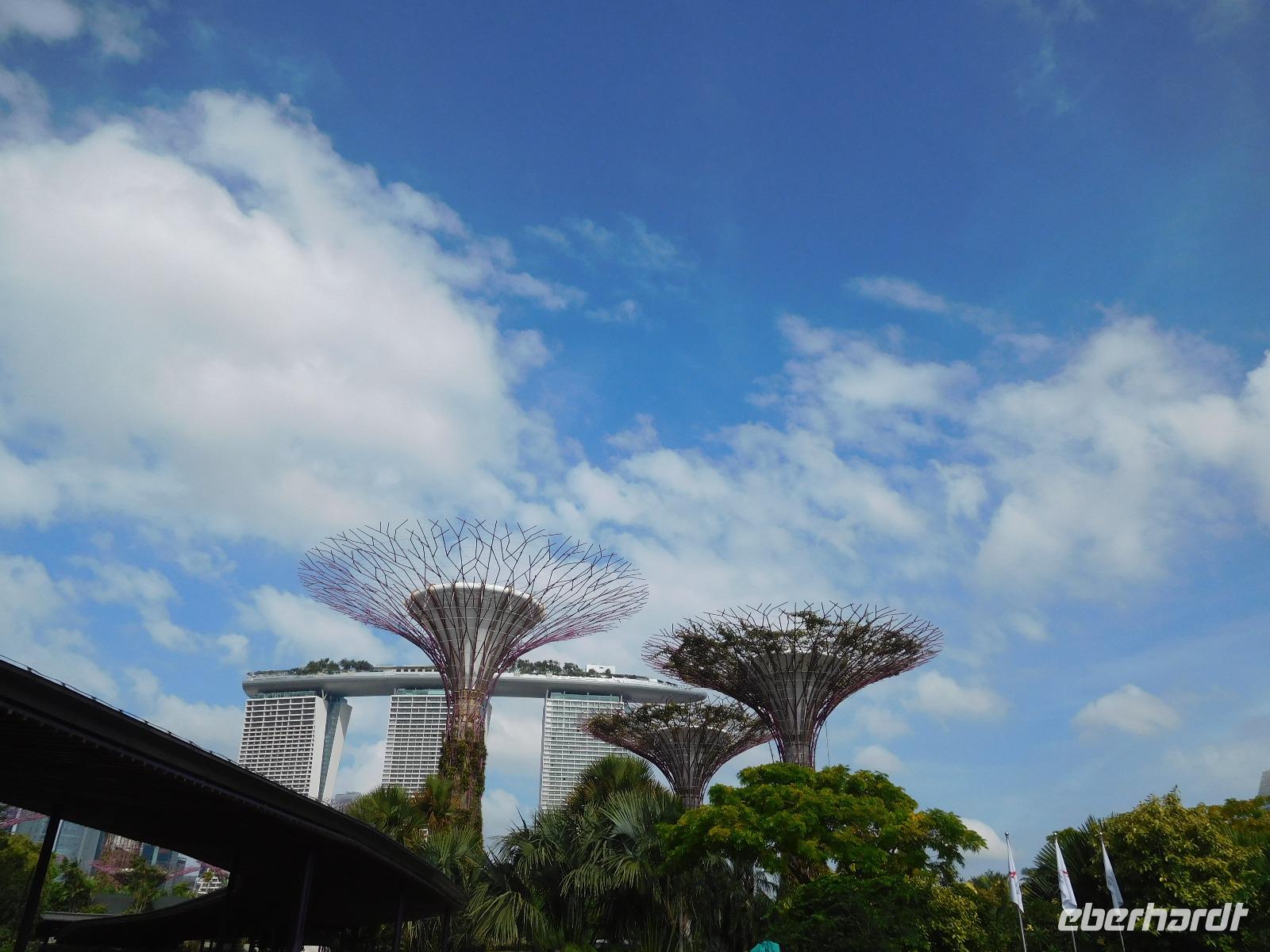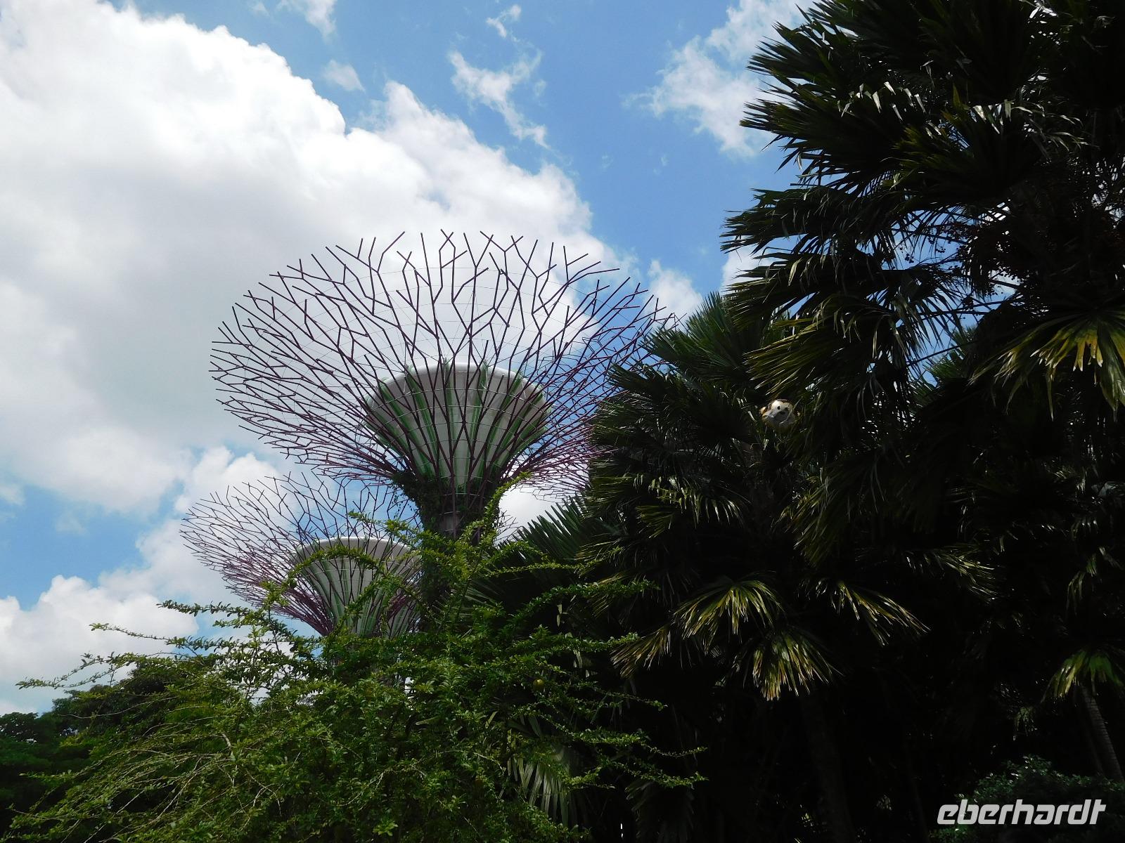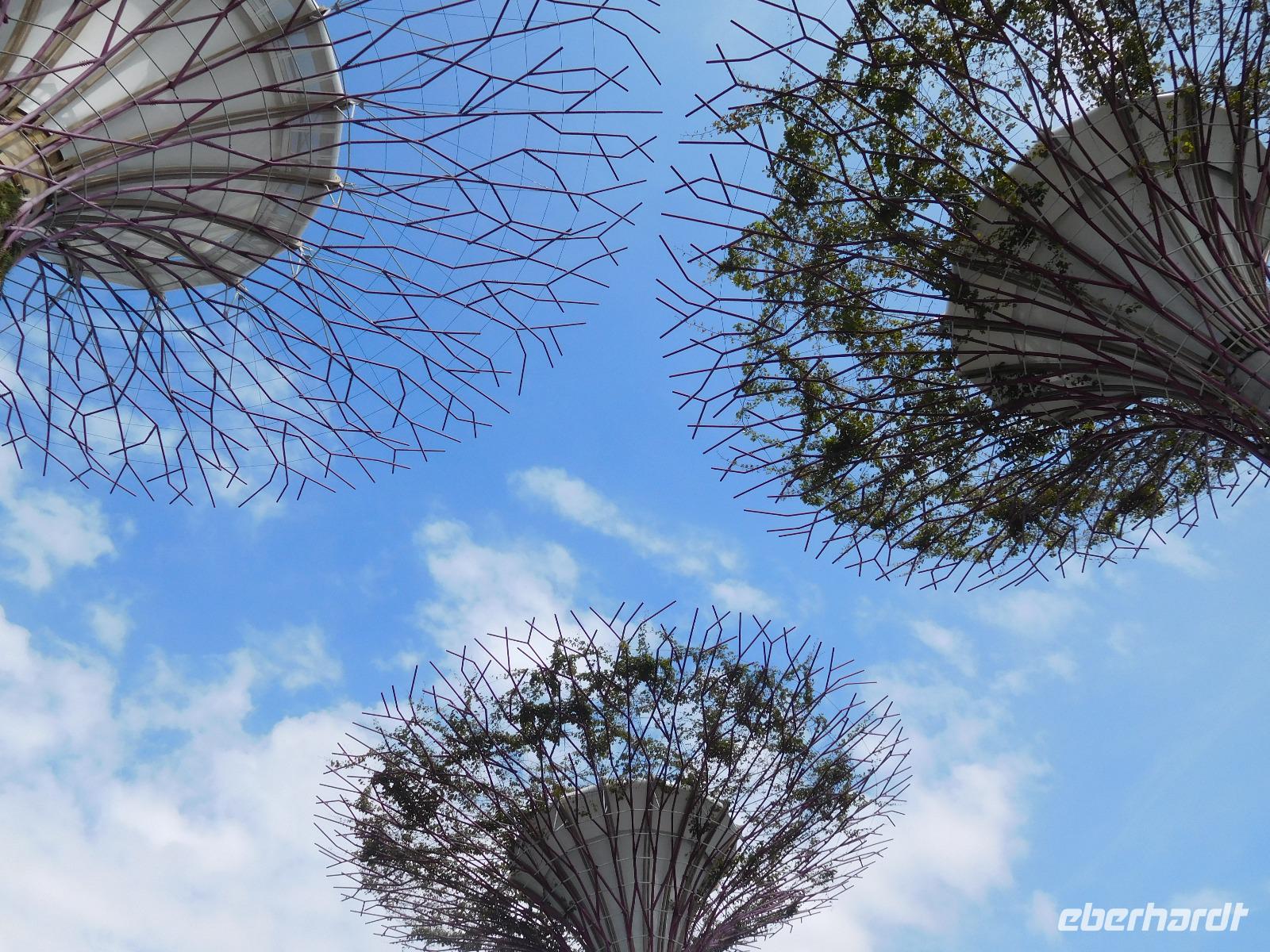 Draußen, in der wohligen Wärme Südostasiens, standen geduldig die eigentlichen Stars der Gardens by the Bay: Die Supertrees. Entlang der Beton- und Stahlkonstruktion, die Kraftwerk, Schornstein und Bar beherbergen, wachsen allerlei Farne und Moose. Ein Skywalk verbindet die Supertrees zu einem Waldspaziergang der Extraklasse.