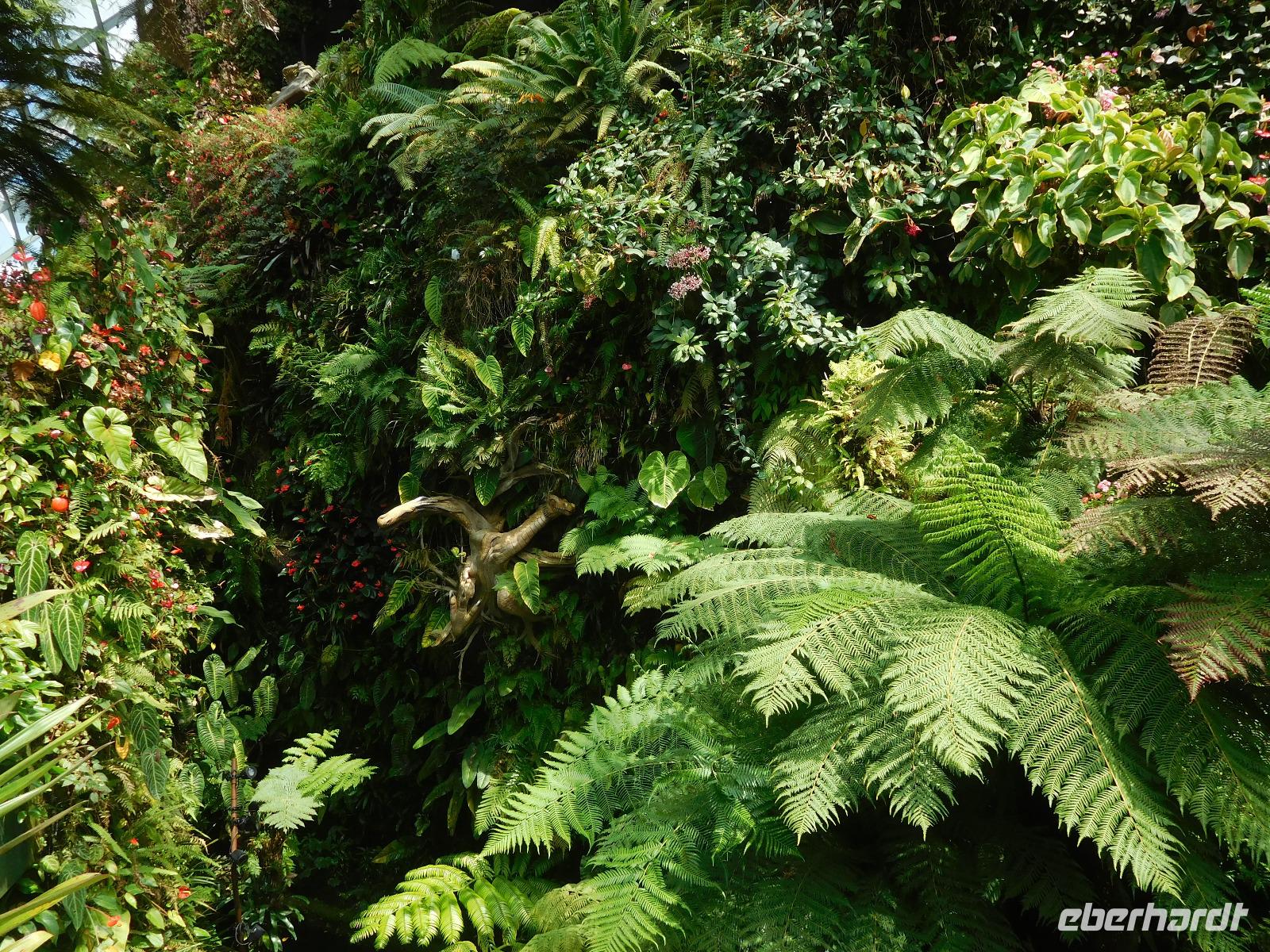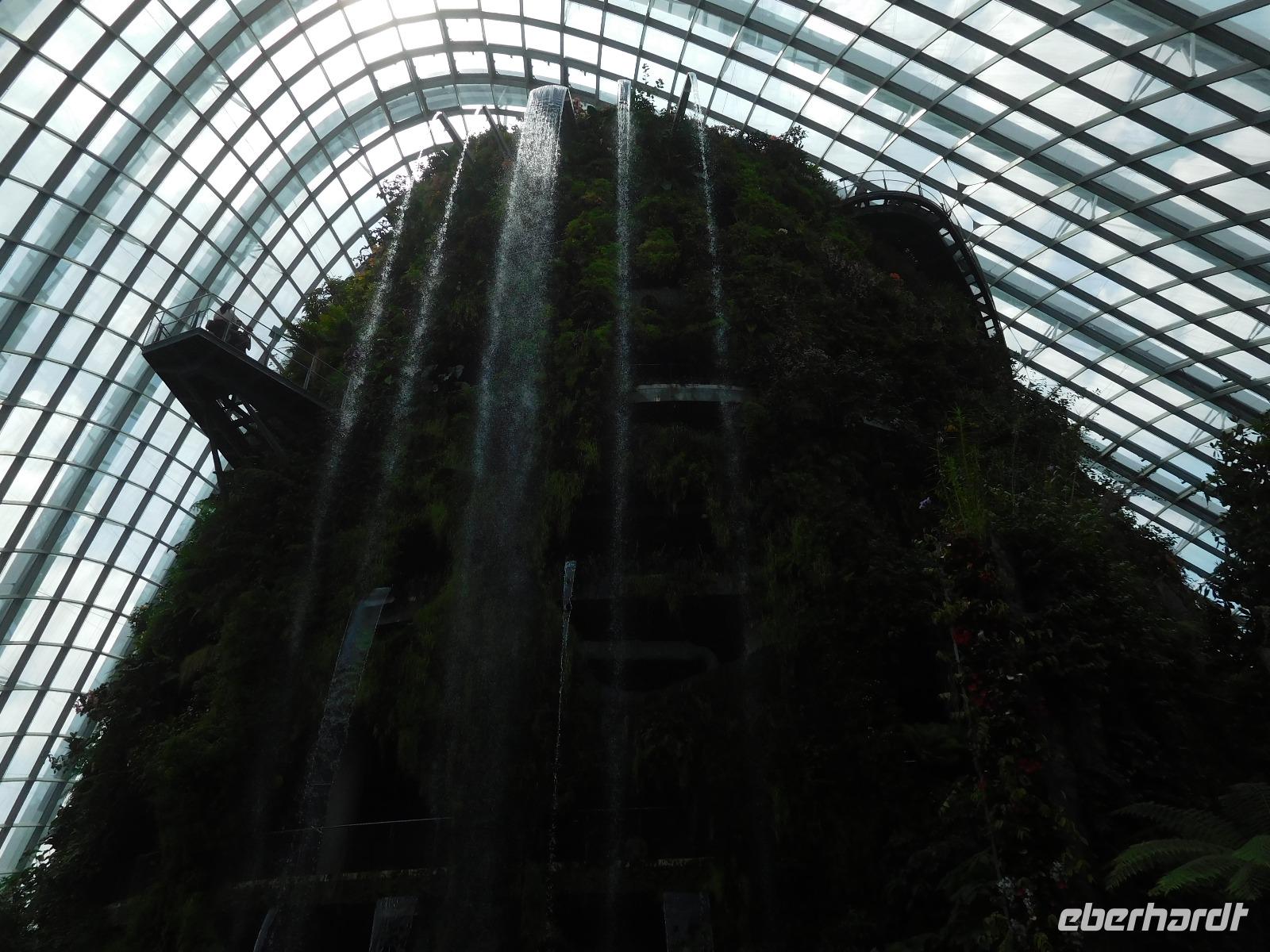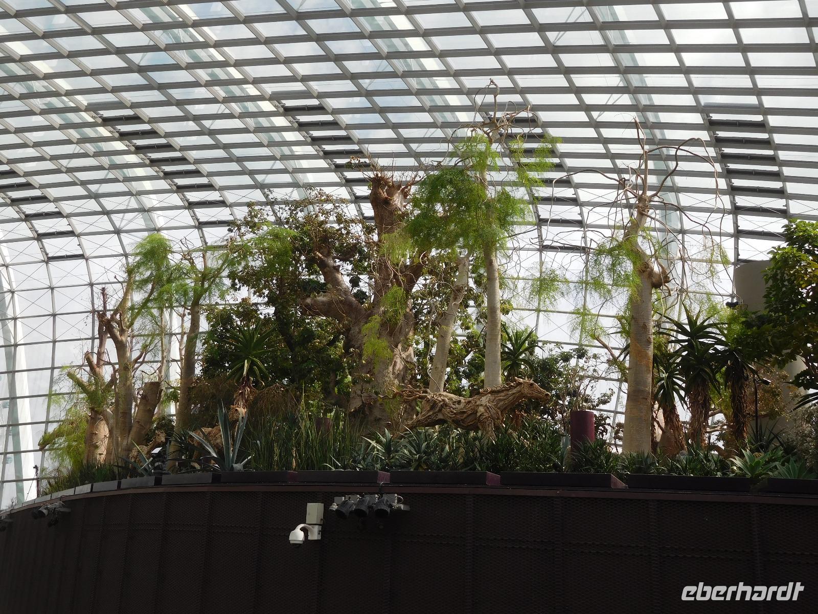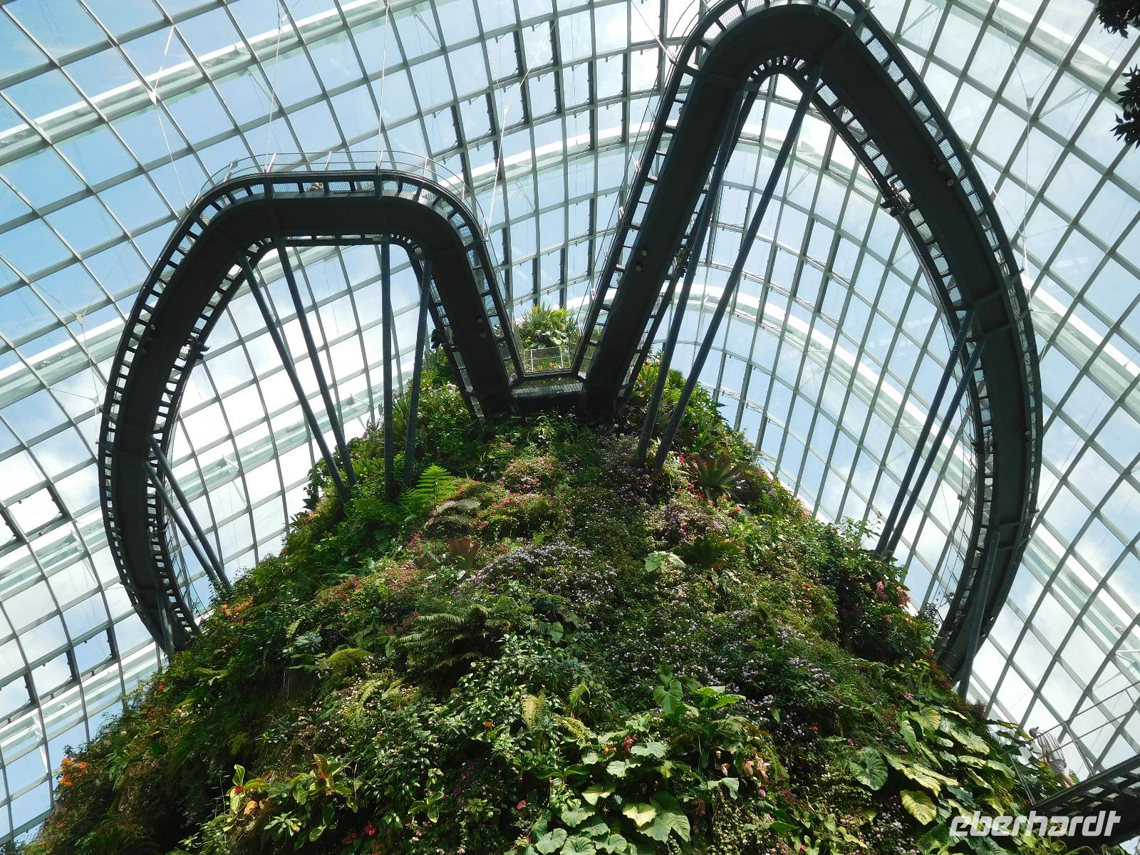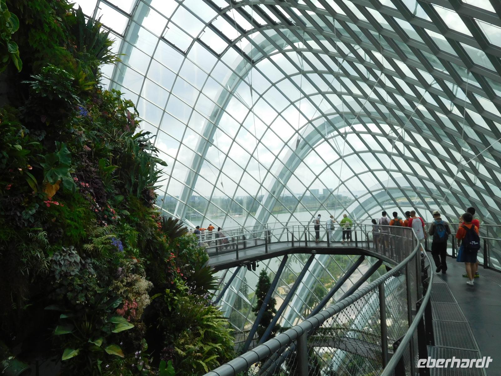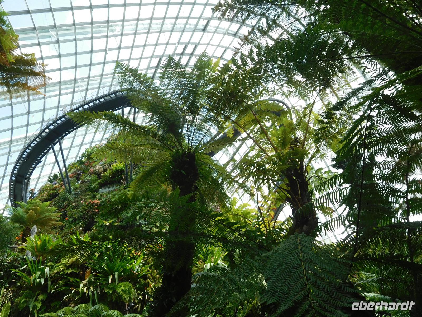 Draußen, in der wohligen Wärme Südostasiens, standen geduldig die eigentlichen Stars der Gardens by the Bay: Die Supertrees. Entlang der Beton- und Stahlkonstruktion, die Kraftwerk, Schornstein und Bar beherbergen, wachsen allerlei Farne und Moose. Ein Skywalk verbindet die Supertrees zu einem Waldspaziergang der Extraklasse.