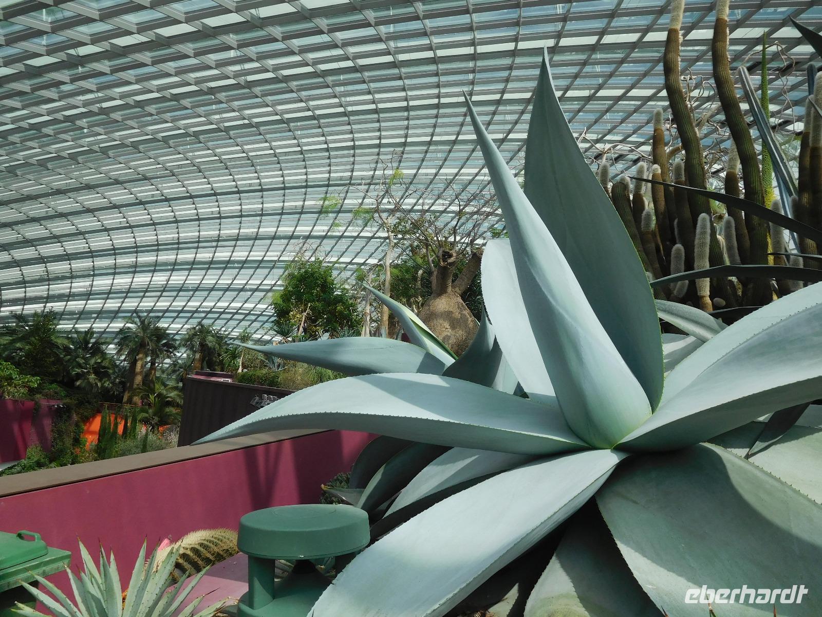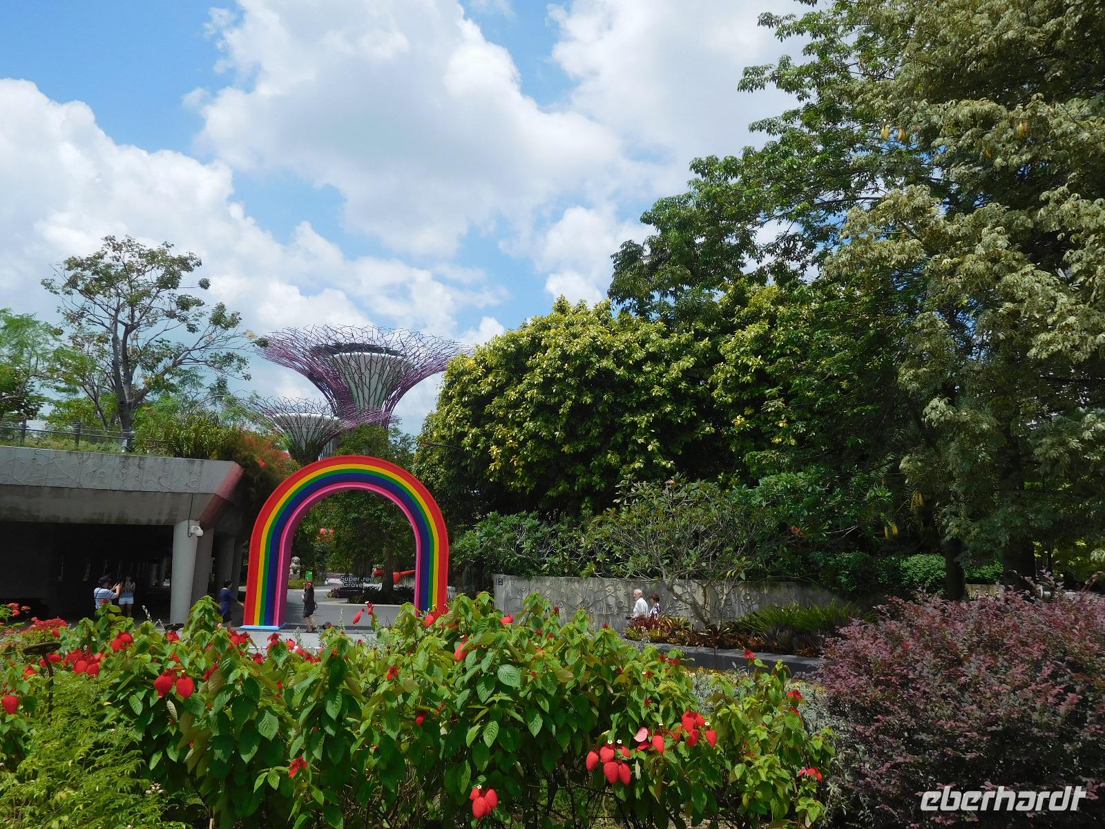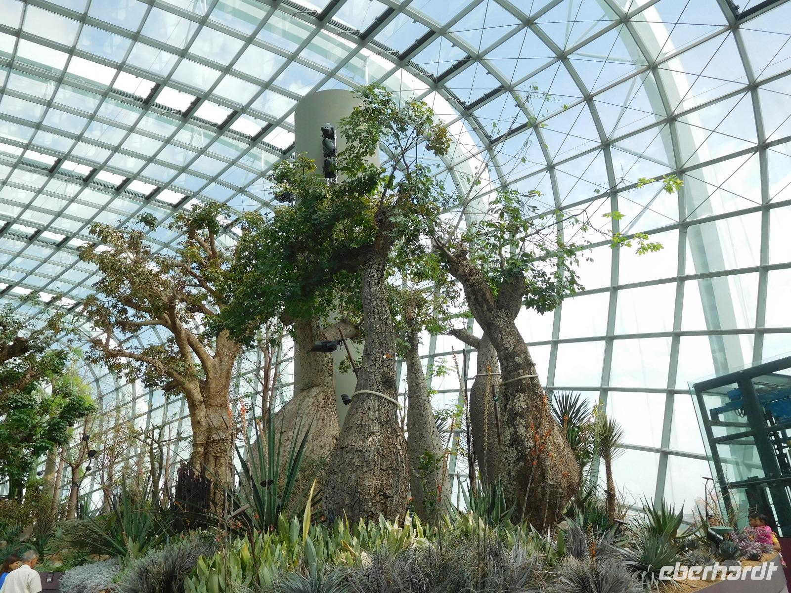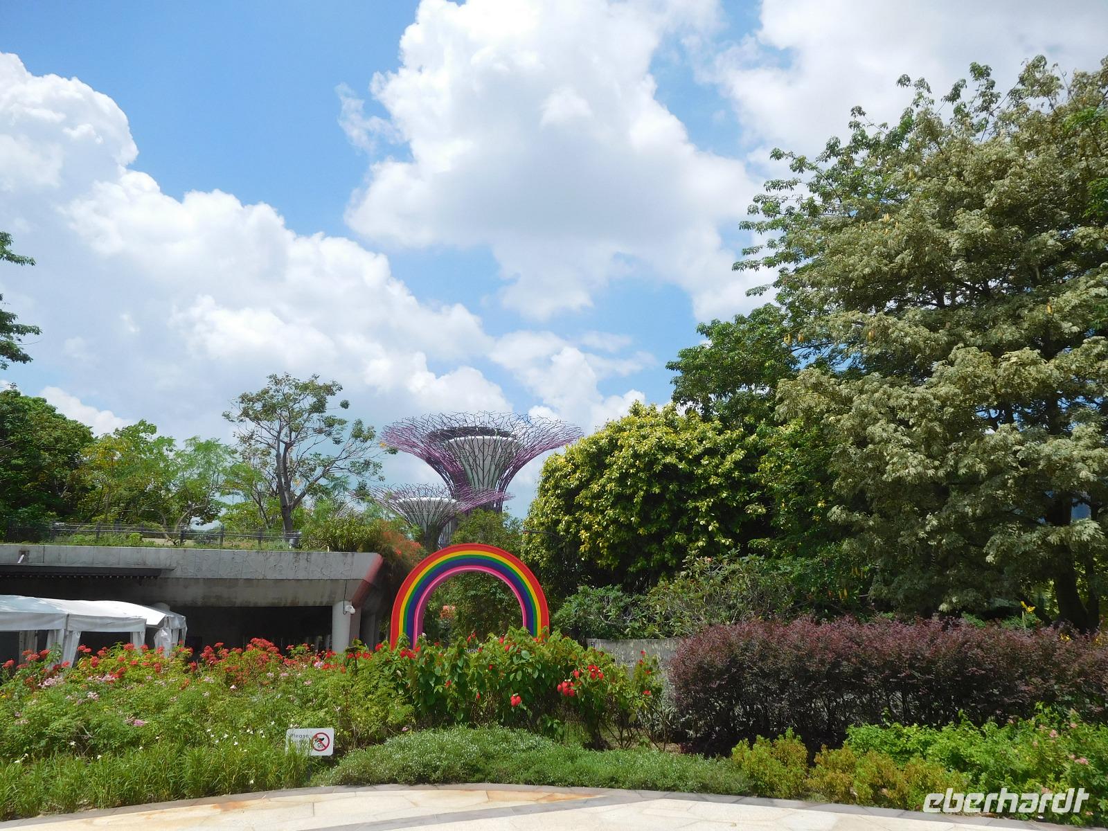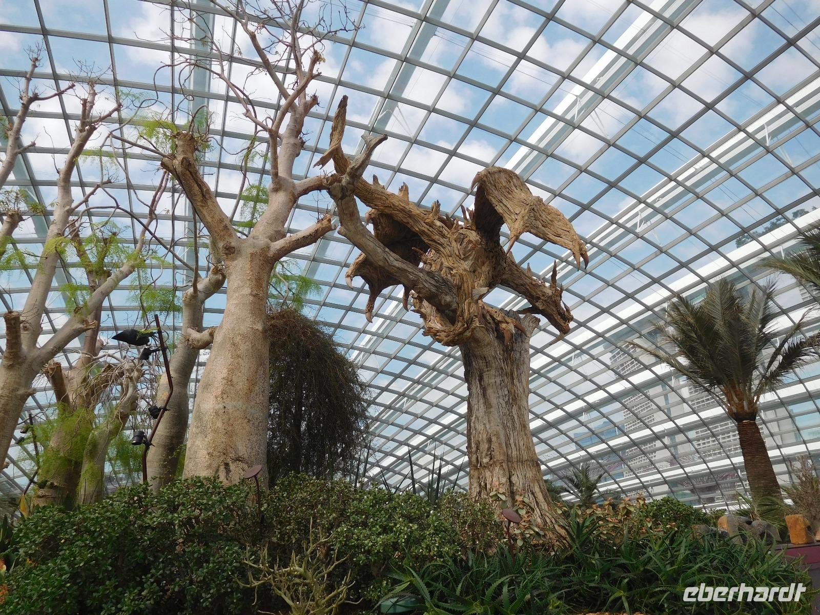 Draußen, in der wohligen Wärme Südostasiens, standen geduldig die eigentlichen Stars der Gardens by the Bay: Die Supertrees. Entlang der Beton- und Stahlkonstruktion, die Kraftwerk, Schornstein und Bar beherbergen, wachsen allerlei Farne und Moose. Ein Skywalk verbindet die Supertrees zu einem Waldspaziergang der Extraklasse.