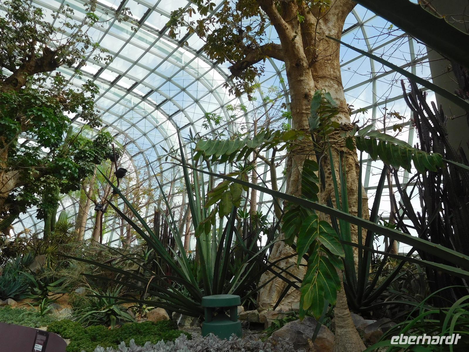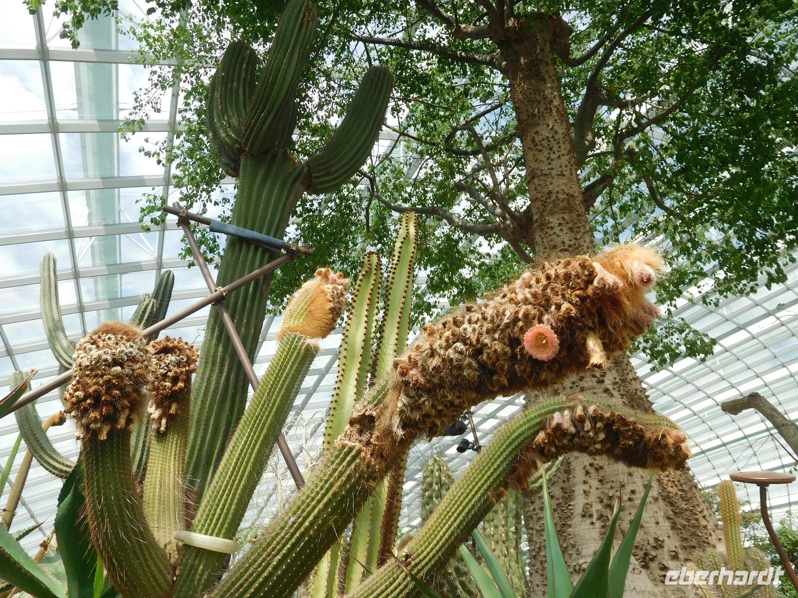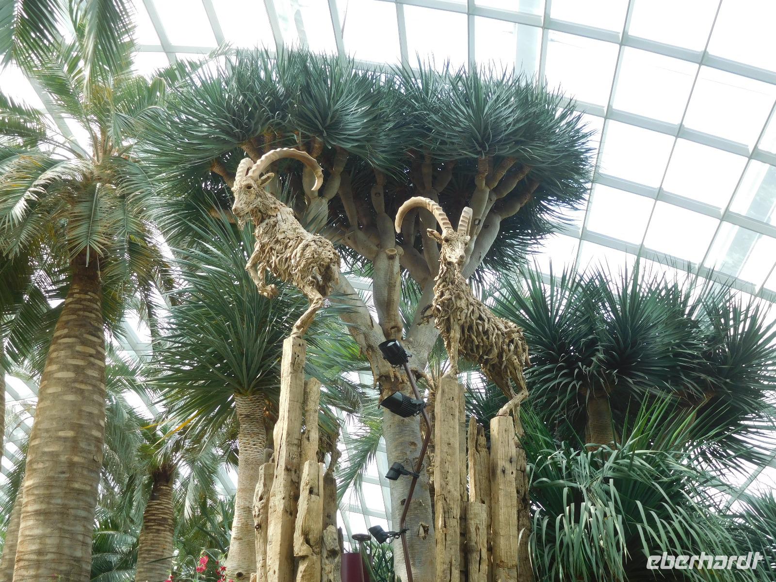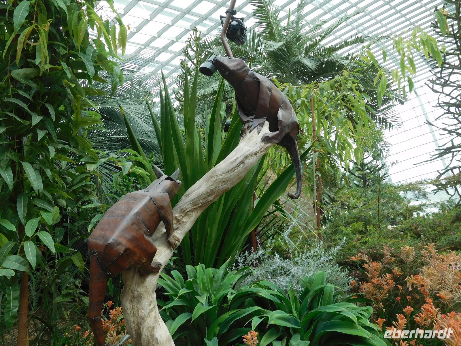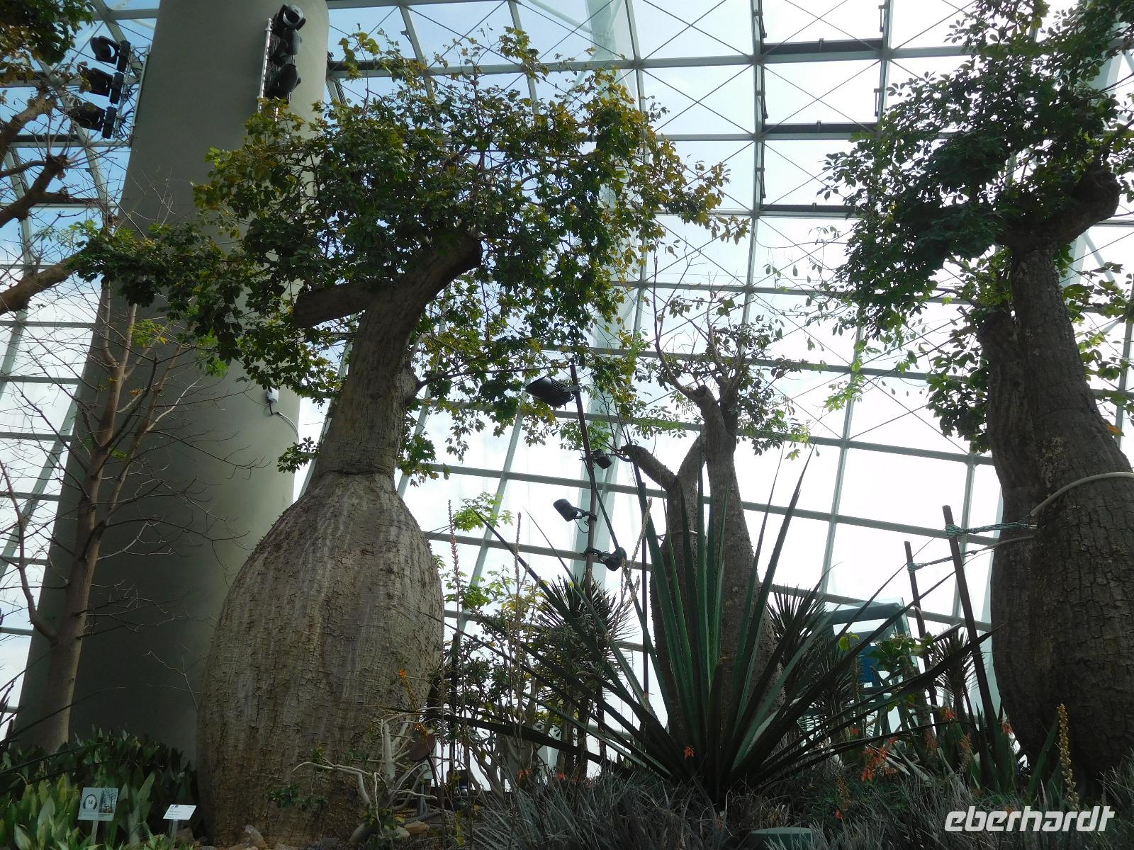 Draußen, in der wohligen Wärme Südostasiens, standen geduldig die eigentlichen Stars der Gardens by the Bay: Die Supertrees. Entlang der Beton- und Stahlkonstruktion, die Kraftwerk, Schornstein und Bar beherbergen, wachsen allerlei Farne und Moose. Ein Skywalk verbindet die Supertrees zu einem Waldspaziergang der Extraklasse.