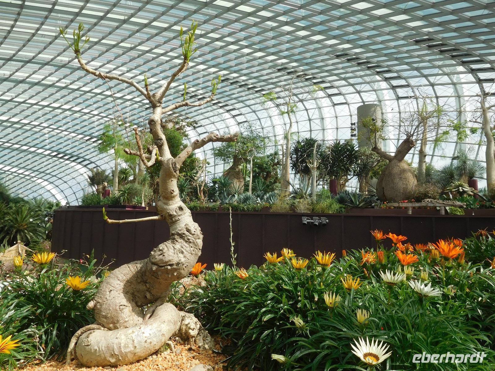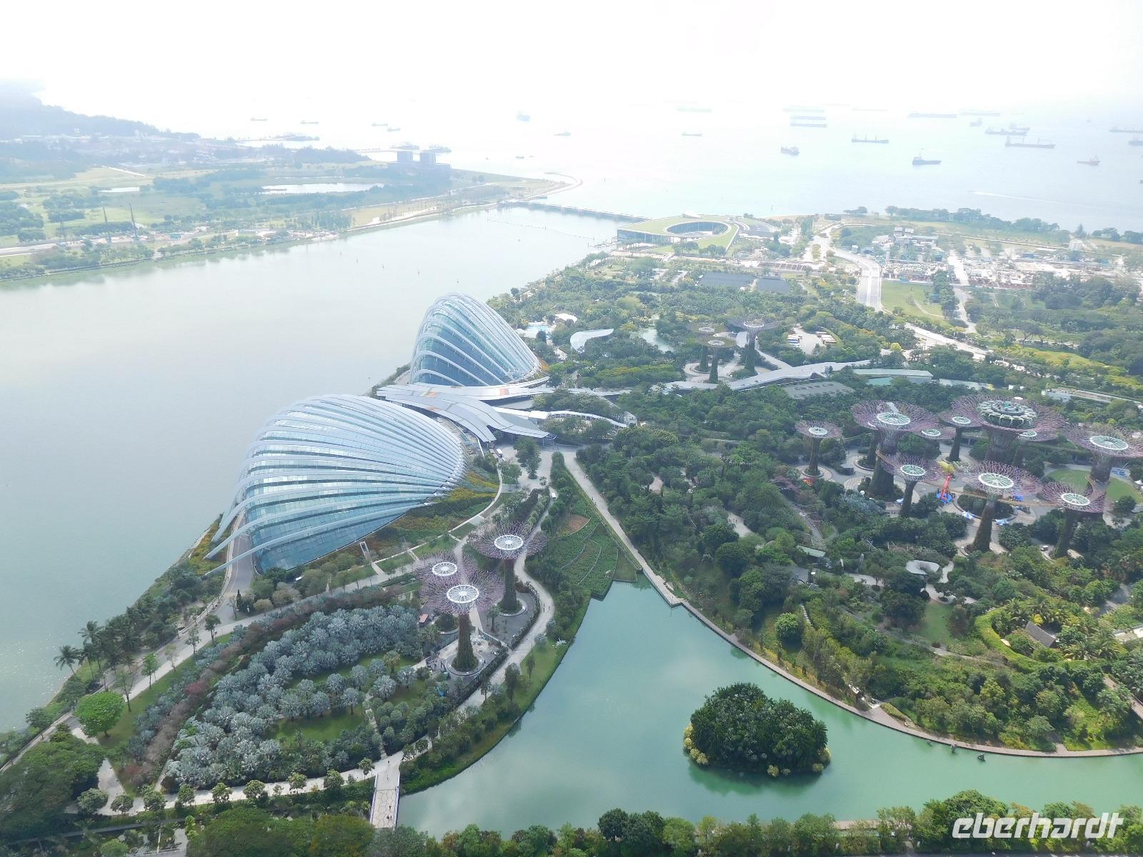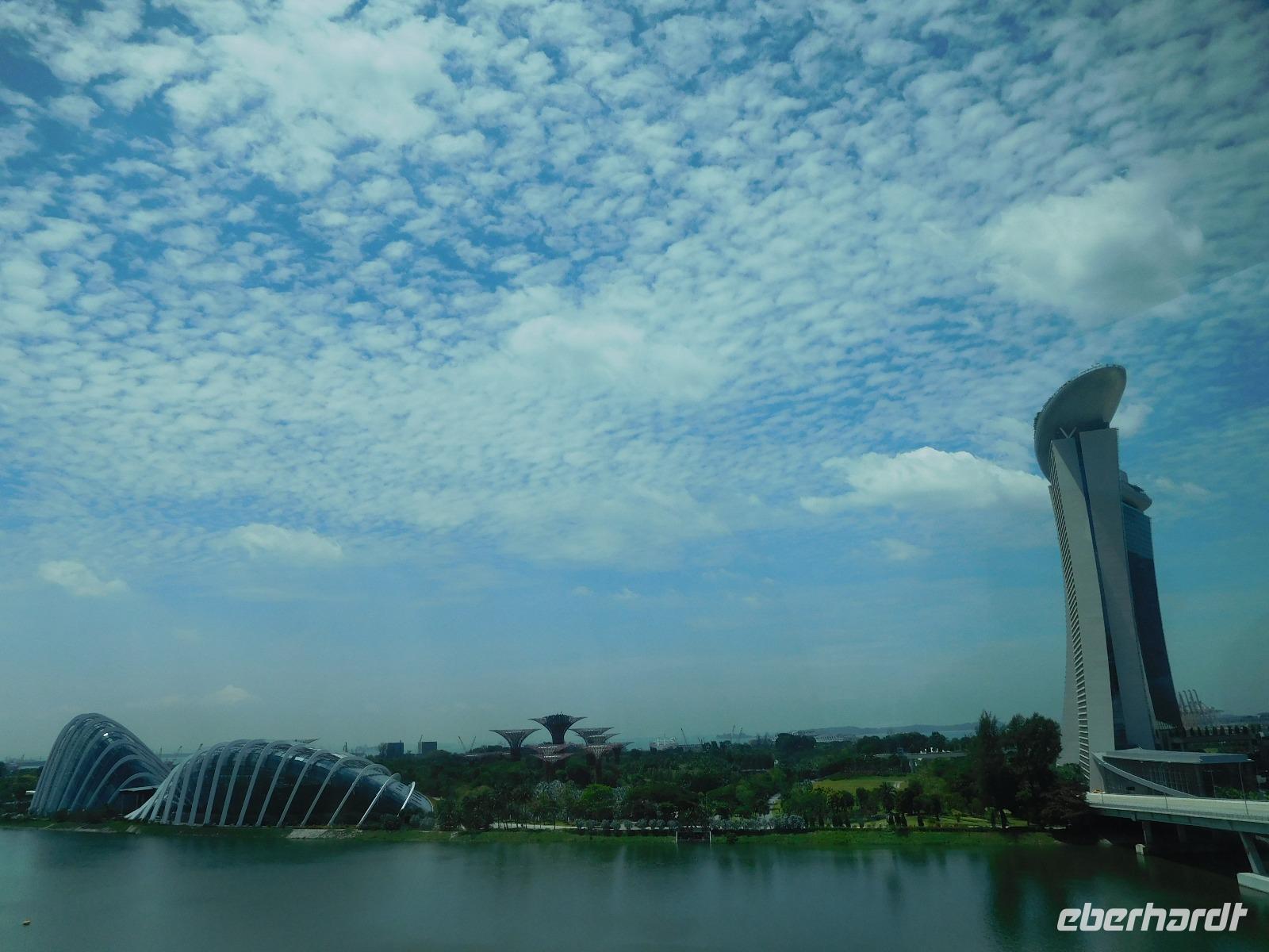 Unser heutiger Tag in der Superstadt Singapur stand ganz im Zeichen der Zukunft: Die Gardens by the Bay standen auf dem Programm und so fuhren wir erst bei Tag in die spektakuläre Anlage aus technischen Supertrees und einer eindrucksvoll großen wie stilvollen Zusammenstellung von botanischen Exponaten aus der ganzen Welt. Im ersten Gewächshaus verschlug es uns - mit Blick auf das Marina Bay Sands Hotel - in die romantische Kirschblüte Japans, während wir uns im zweiten Gewächshaus in einer tropischen Wasserfallwelt wiederfanden, die sich auf vier Etagen erstreckte. Hier war es mit 20 Grad direkt kalt!