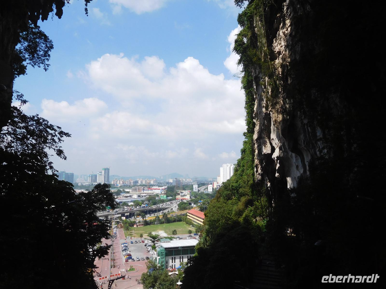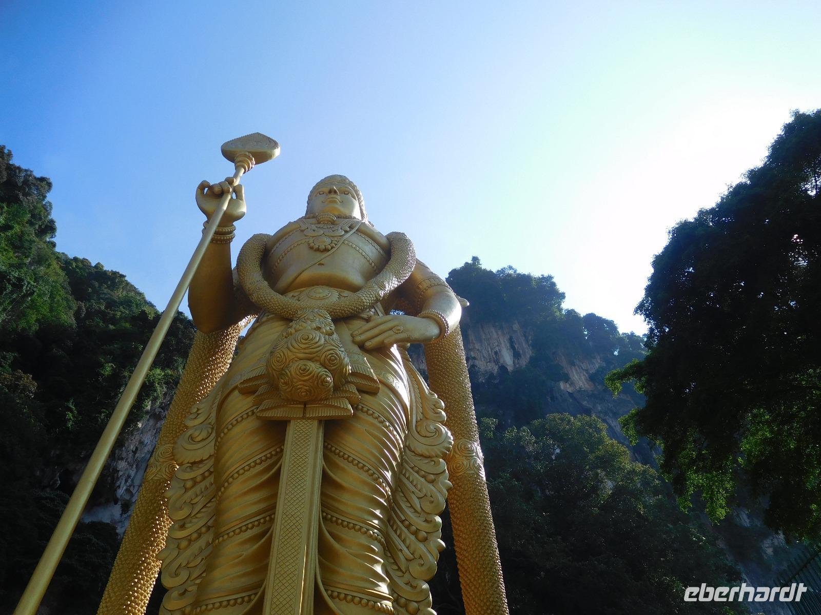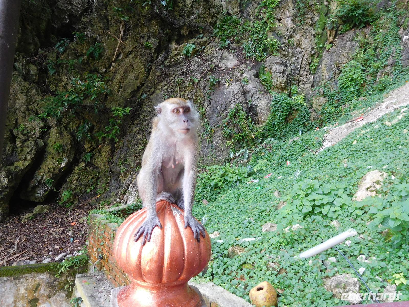 Als erstes zeigte er uns die Batu-Höhlen, in denen eine Tempelanlage zu Ehren des Sohns Shiva errichtet wurde. Um dorthin zu gelangen, muss man 272 schmale Stufen erklimmen. Wem das zu einfach ist, dem geben die dortigen Aufseher noch gern ein bis zwei Eimer Sand in die Hand, um den Weg als beschwerlichen Opfergang zu den Göttern zu empfinden. (Noch) nicht zum Hinduismus konvertiert, verzichteten wir auf diesen Teil und nutzten die erholsamen Stopps auf der Treppe für einen Blick über die Stadt. Die Höhlen selbst beeindrucken mit ihrer Höhe, die Götter warten in den Ecken auf uns. Mehr Interesse zogen die vielen Affen auf sich, die Essen erbettelten - oder es sich einfach von unaufmerksamen Touristen schnappten.
