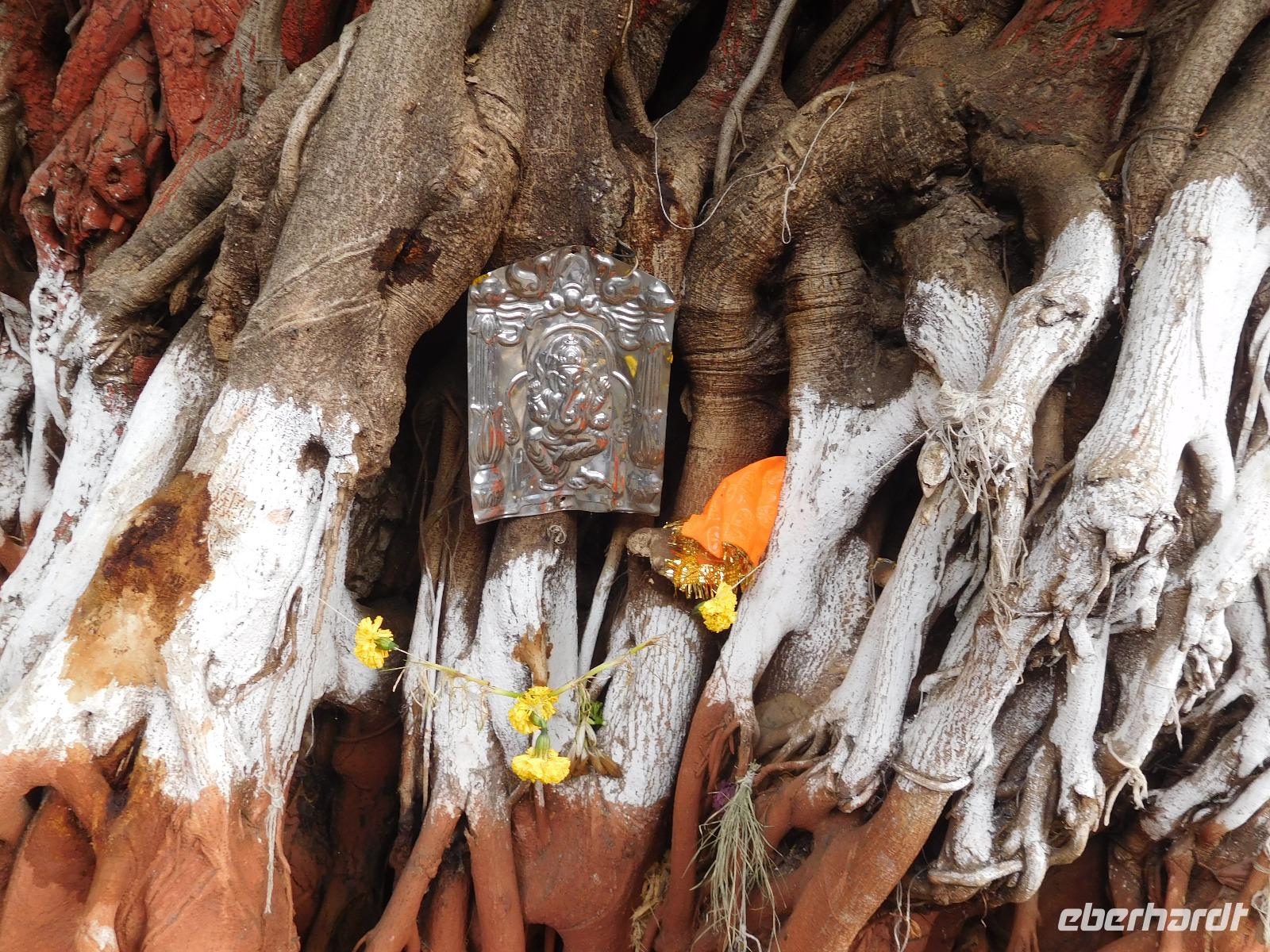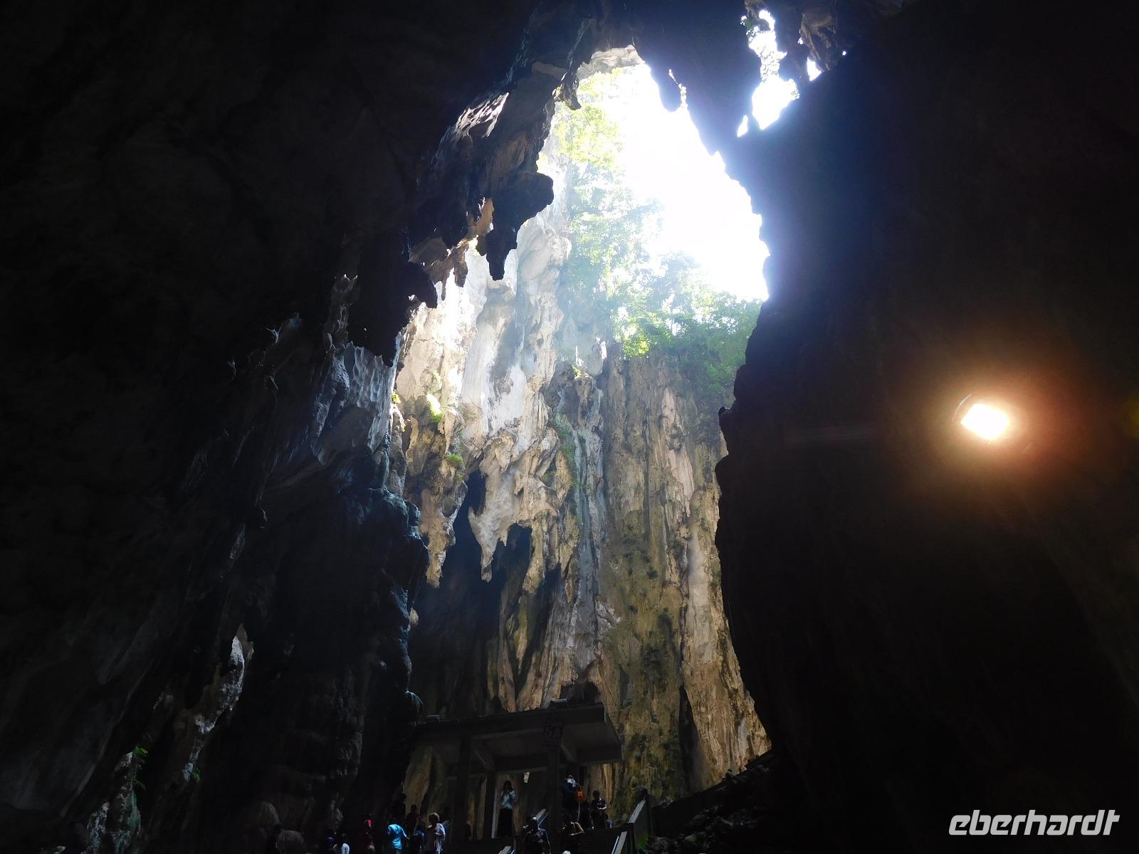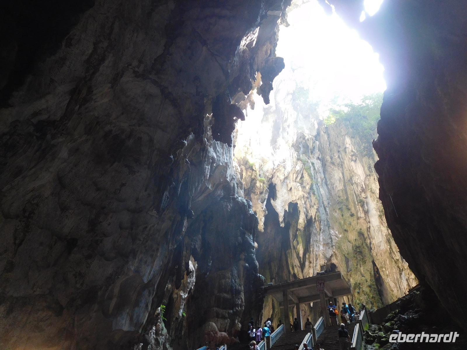 Als erstes zeigte er uns die Batu-Höhlen, in denen eine Tempelanlage zu Ehren des Sohns Shiva errichtet wurde. Um dorthin zu gelangen, muss man 272 schmale Stufen erklimmen. Wem das zu einfach ist, dem geben die dortigen Aufseher noch gern ein bis zwei Eimer Sand in die Hand, um den Weg als beschwerlichen Opfergang zu den Göttern zu empfinden. (Noch) nicht zum Hinduismus konvertiert, verzichteten wir auf diesen Teil und nutzten die erholsamen Stopps auf der Treppe für einen Blick über die Stadt. Die Höhlen selbst beeindrucken mit ihrer Höhe, die Götter warten in den Ecken auf uns. Mehr Interesse zogen die vielen Affen auf sich, die Essen erbettelten - oder es sich einfach von unaufmerksamen Touristen schnappten.
