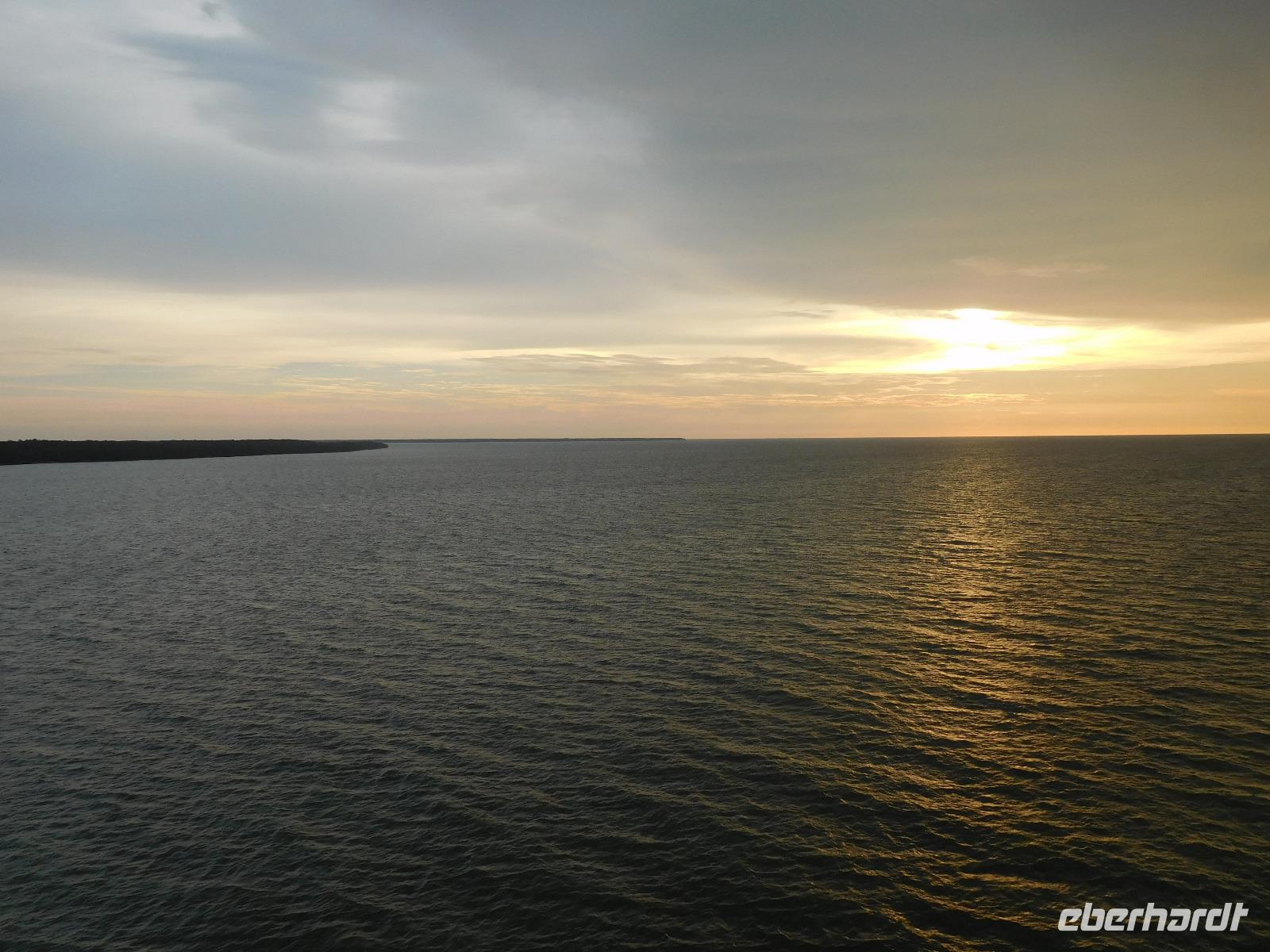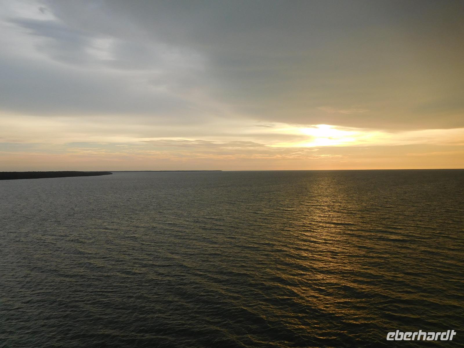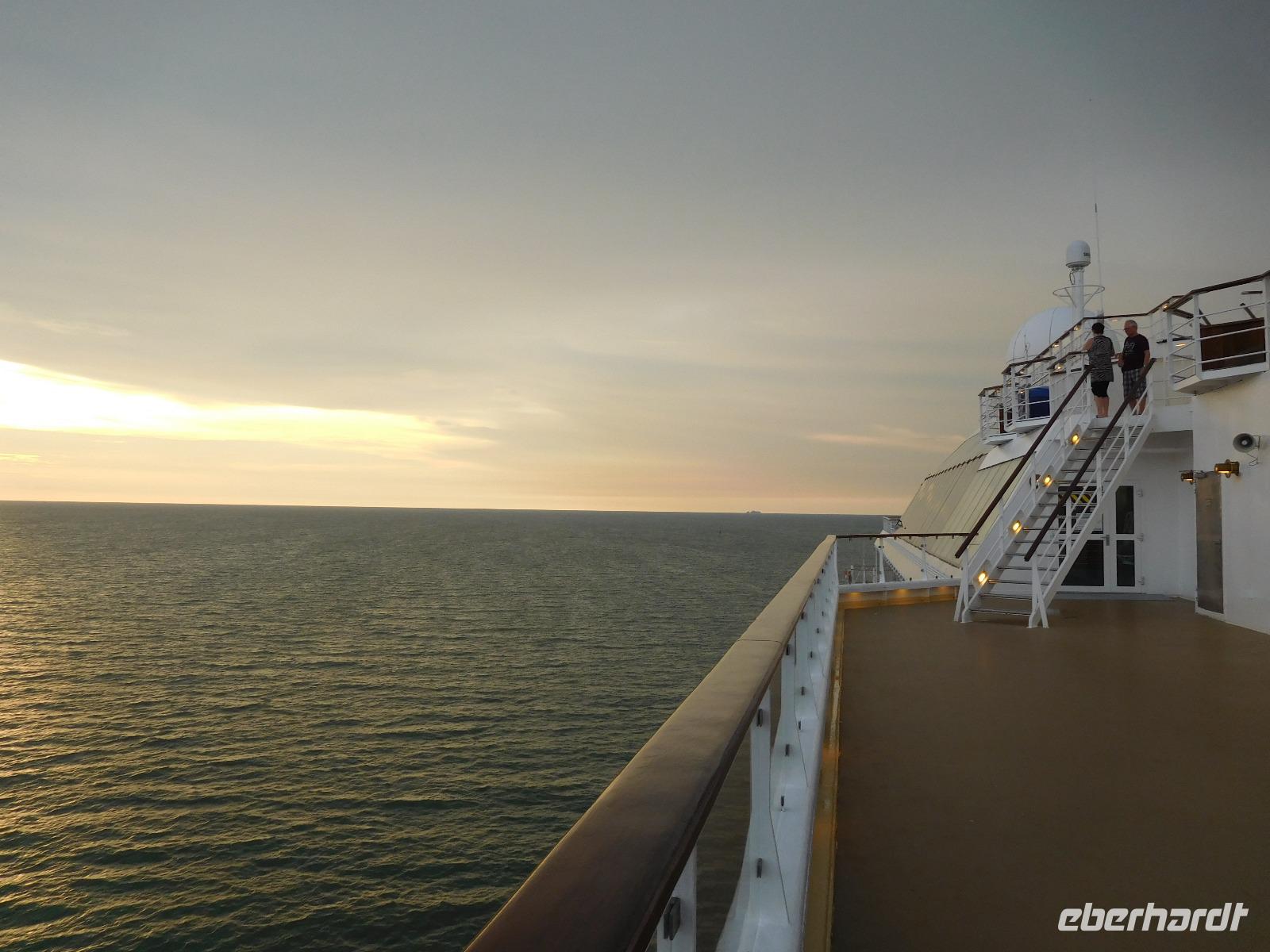 Zuvor mussten wir natürlich noch die Seenotrettungsübung mitmachen, damit wir für den Ernstfall geschult waren, und konnten dann an Deck bei einem leckeren Sekt das Auslaufen in der Abendsonne genießen.
