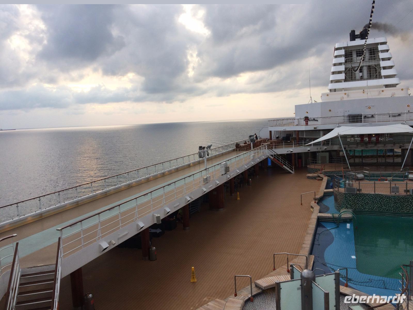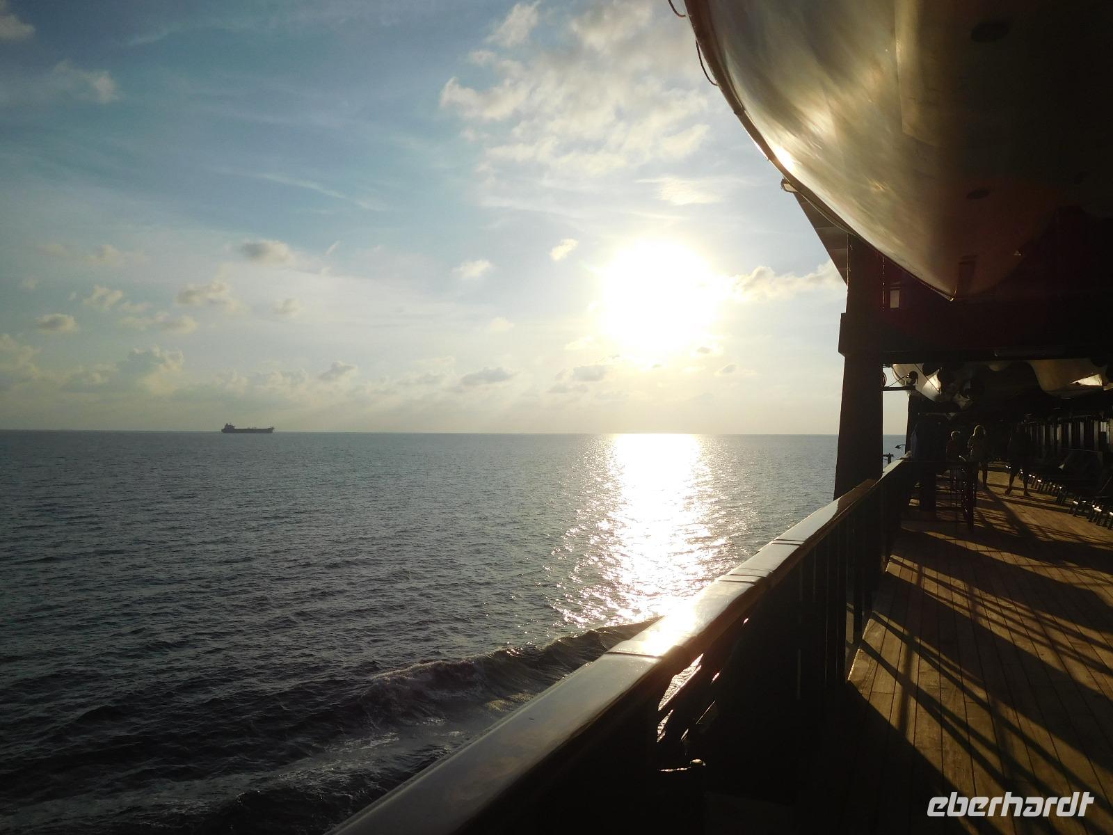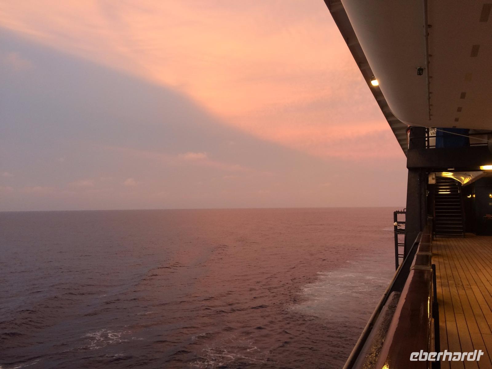 Endlich entspannen! Nach so vielen Eindrücken in den vergangenen Tagen hatten wir nun drei volle Tage auf See Zeit, erlebtes nachklingen zu lassen, Sonne und Kulinarik an Bord zu genießen und die vielseitigen Angebote des Bordlebens ausgiebig zu genießen. Für die einen zählte definitiv der Balkon dazu, andere zogen eher den Pool vor. Gemeinsam lauschten wir den verschiedenen Lektoren-Vorträgen über neue Kreuzfahrten in Nordamerika und natürlich unsere nächste Destination Sri Lanka, getrennt später dem Meeresrauschen, dessen Farbspektrum diesmal von silbergrau bis azurblau reichte und uns teils mit spiegelglatter Fläche faszinierte oder uns in leichten Wellen sanft wiegte. Abends trafen wir uns zum Restaurant-Testen, erst Atlantik, dann das Gosch. Je nach Interesse besuchten wir dann die Shows im Theater oder die einladenden Bars an Deck.
