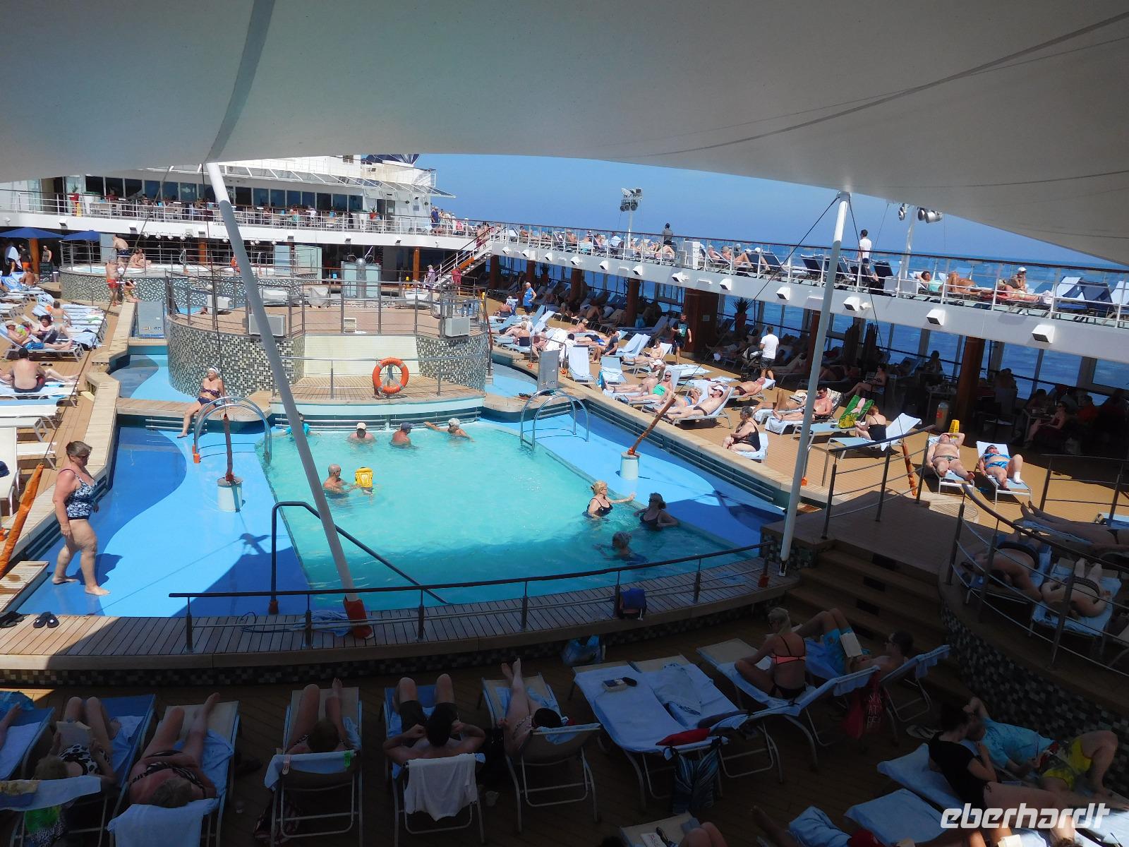 Schon war es Zeit, weiter zu ziehen, denn im Hafen erwartete uns schon sehnsüchtig die Mein Schiff 1. Bevor wir die Kabinen beziehen konnten, durften wir schon die Annehmlichkeiten unseres schwimmenden Hotels nutzen, wozu das außerordentliche kulinarische Angebot ebenso zählt wie die Poollandschaft an Deck.