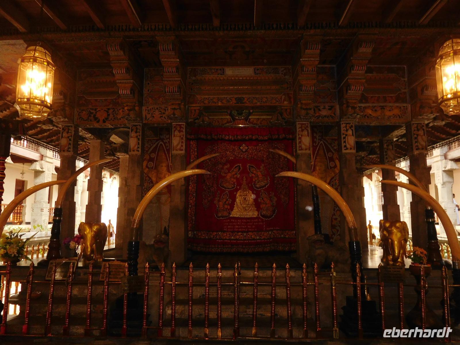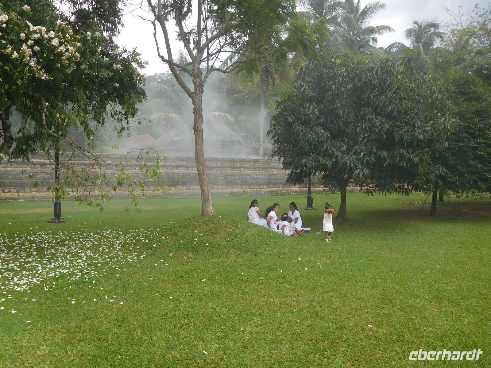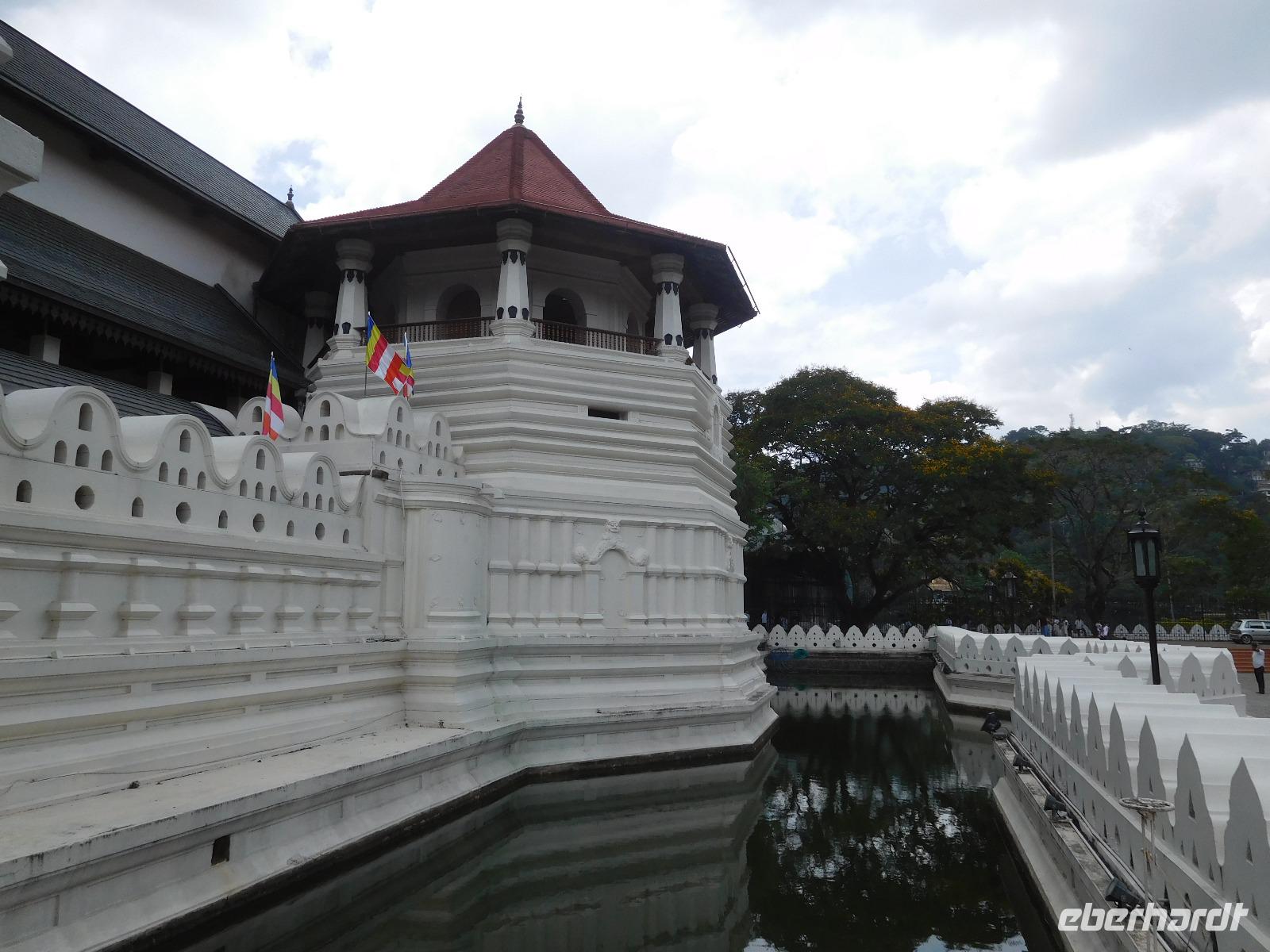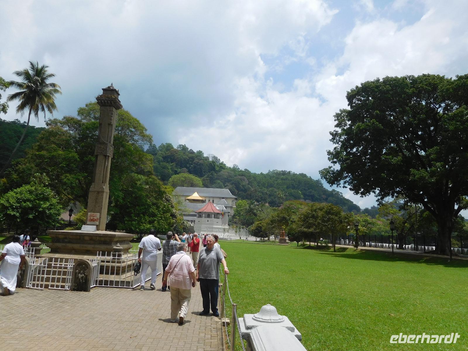 Wer nicht den feinen Sandstrand genoss, fuhr ins Herz der Insel zum "Zahntempel", offiziell dem Sri Dalada Maligawa Tempel nach Kandy. Nach 100 Kilometern Wegstrecke, die wir bei vier Stunden Fahrtzeit zurück gelegt hatten, waren wir endlich da. In Kandy wird das buddhistische Heiligtum, ein Eckzahn Buddhas, aufbewahrt. Den konnten wir zwar leider nicht sehen - stattdessen konnten wir uns davon überzeugen, dass er in seinen sieben reich verzierten Schatullen bestens gewürdigt wird und hinter einer ebenso prachtvollen wie verschlossenen Tür bestens aufgehoben ist. Während der Führung erfuhren wir viel über die schöne Tempelanlage, die ein wichtiger Pilgerort der Buddhisten ist.
