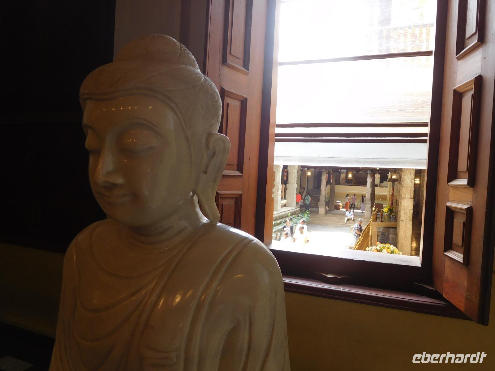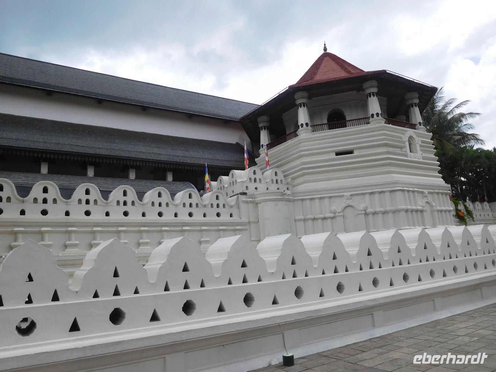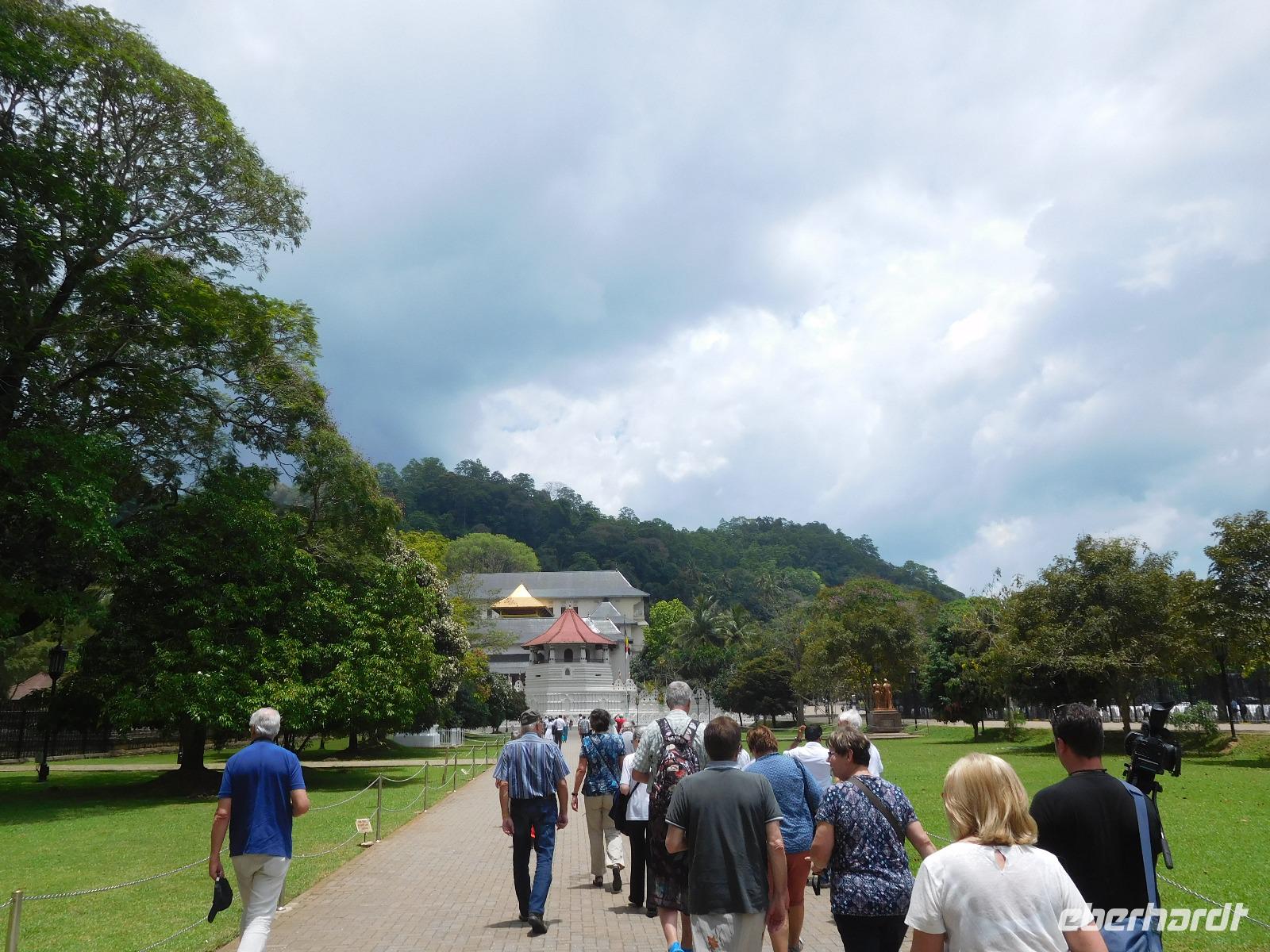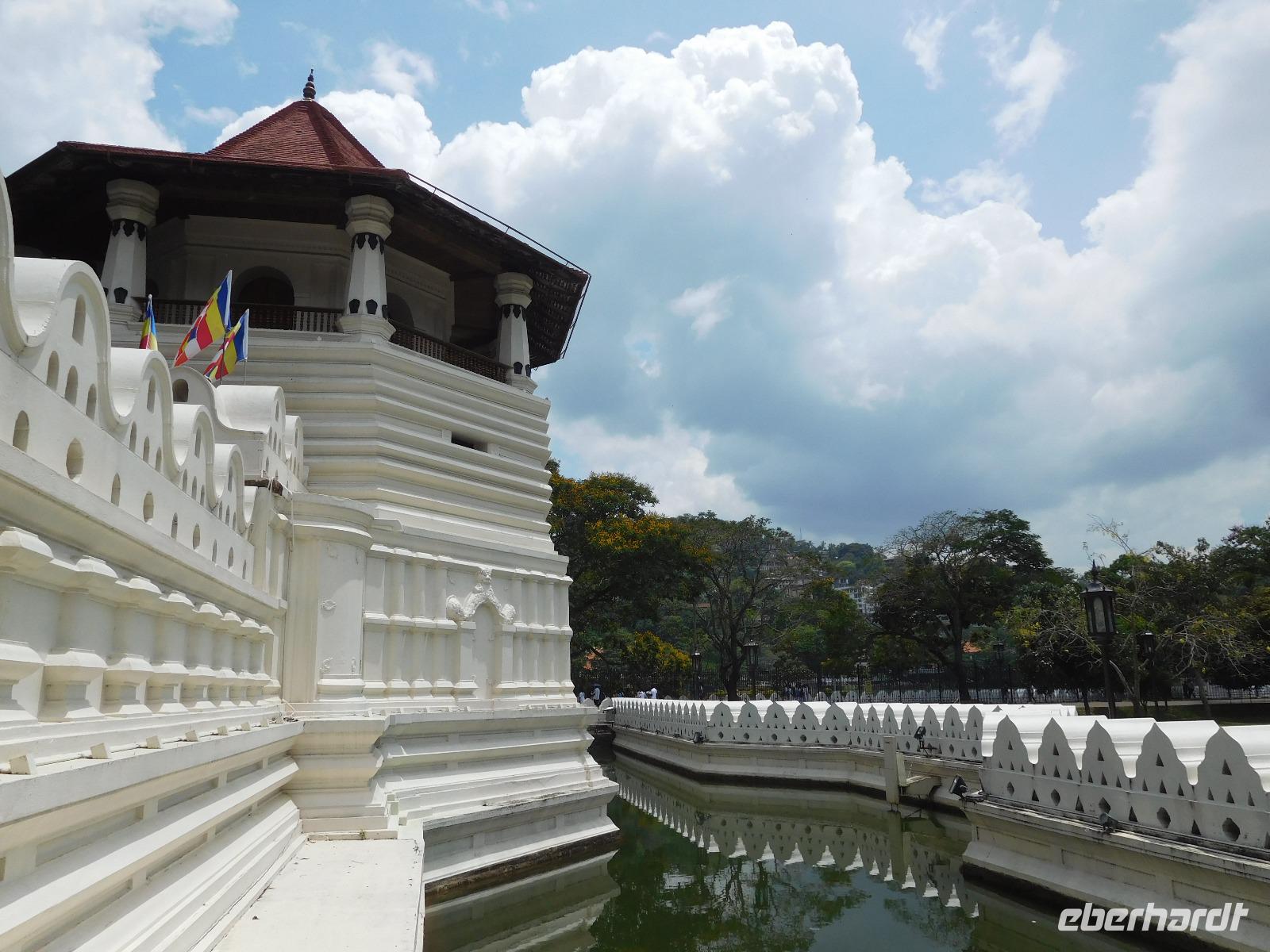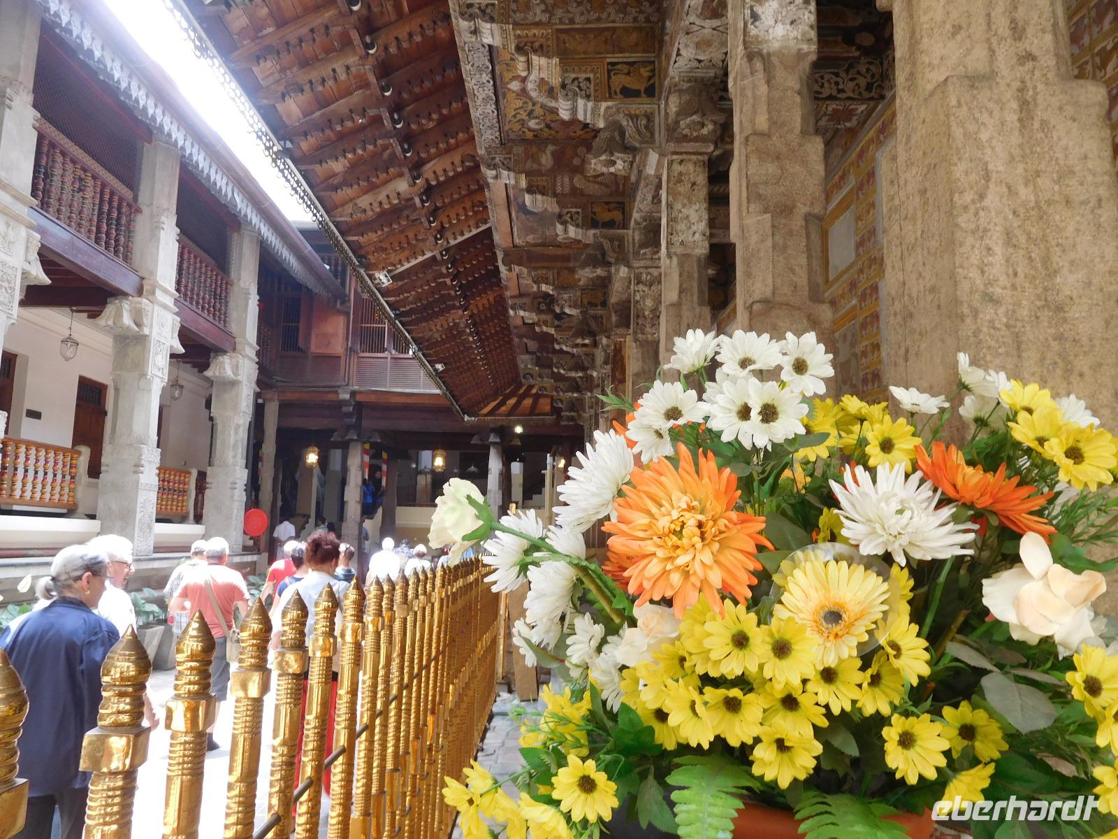 Wer nicht den feinen Sandstrand genoss, fuhr ins Herz der Insel zum "Zahntempel", offiziell dem Sri Dalada Maligawa Tempel nach Kandy. Nach 100 Kilometern Wegstrecke, die wir bei vier Stunden Fahrtzeit zurück gelegt hatten, waren wir endlich da. In Kandy wird das buddhistische Heiligtum, ein Eckzahn Buddhas, aufbewahrt. Den konnten wir zwar leider nicht sehen - stattdessen konnten wir uns davon überzeugen, dass er in seinen sieben reich verzierten Schatullen bestens gewürdigt wird und hinter einer ebenso prachtvollen wie verschlossenen Tür bestens aufgehoben ist. Während der Führung erfuhren wir viel über die schöne Tempelanlage, die ein wichtiger Pilgerort der Buddhisten ist.