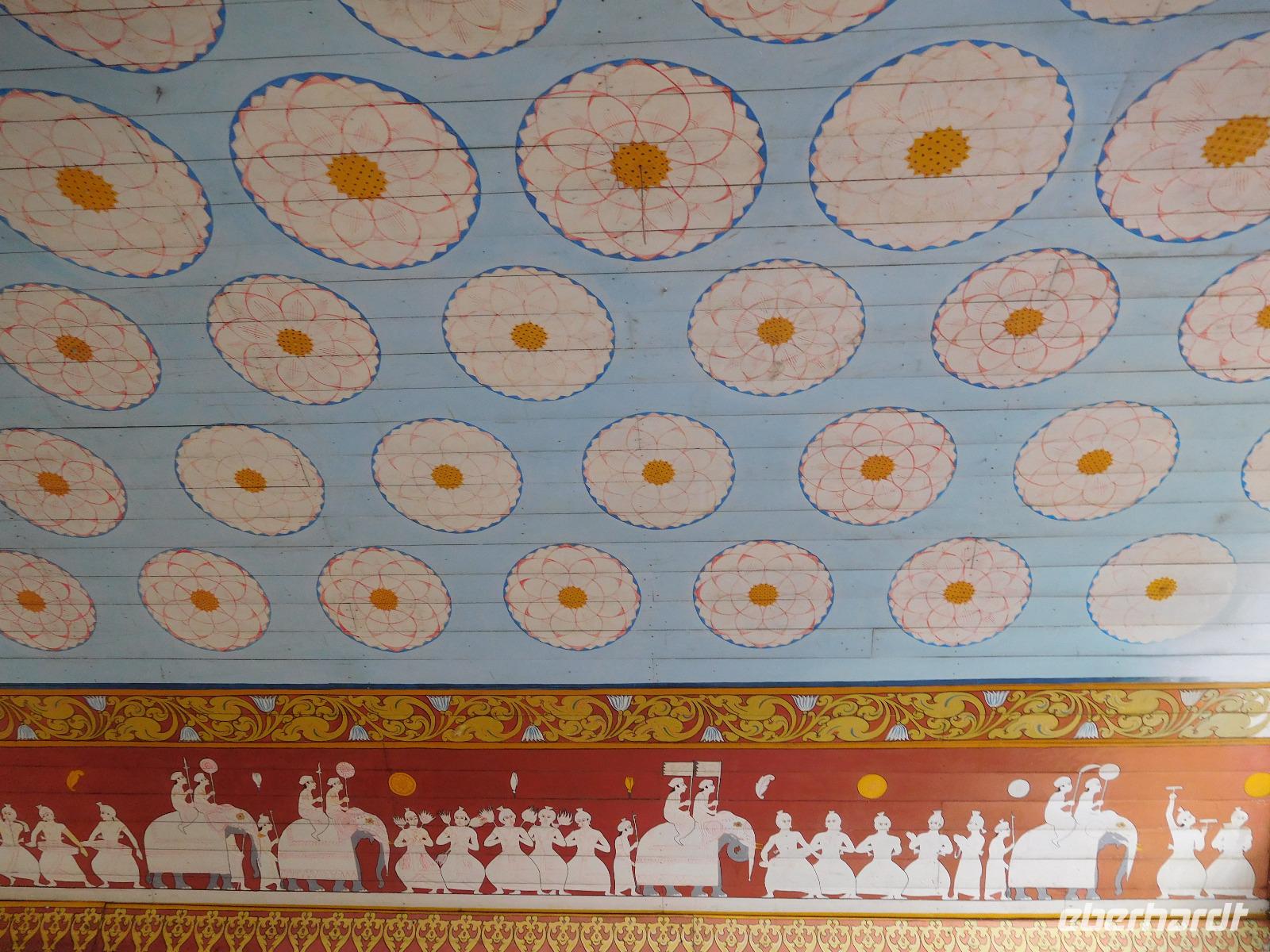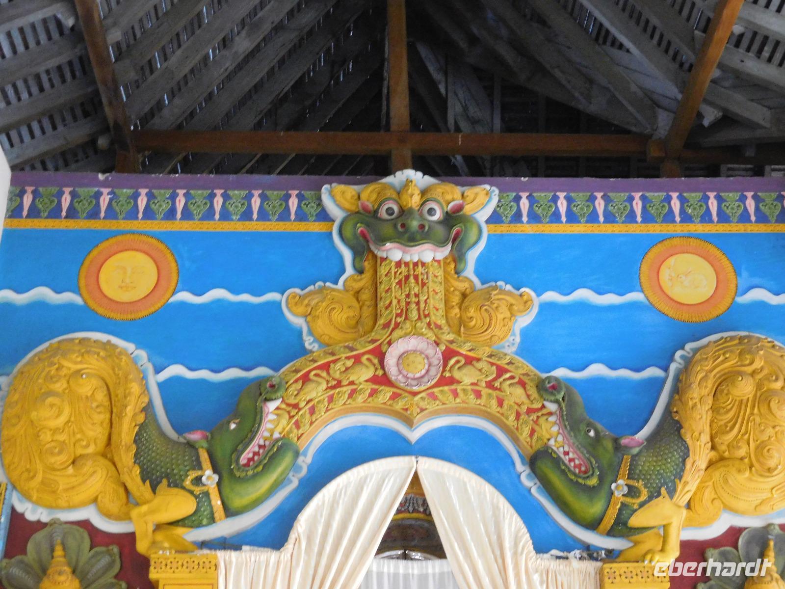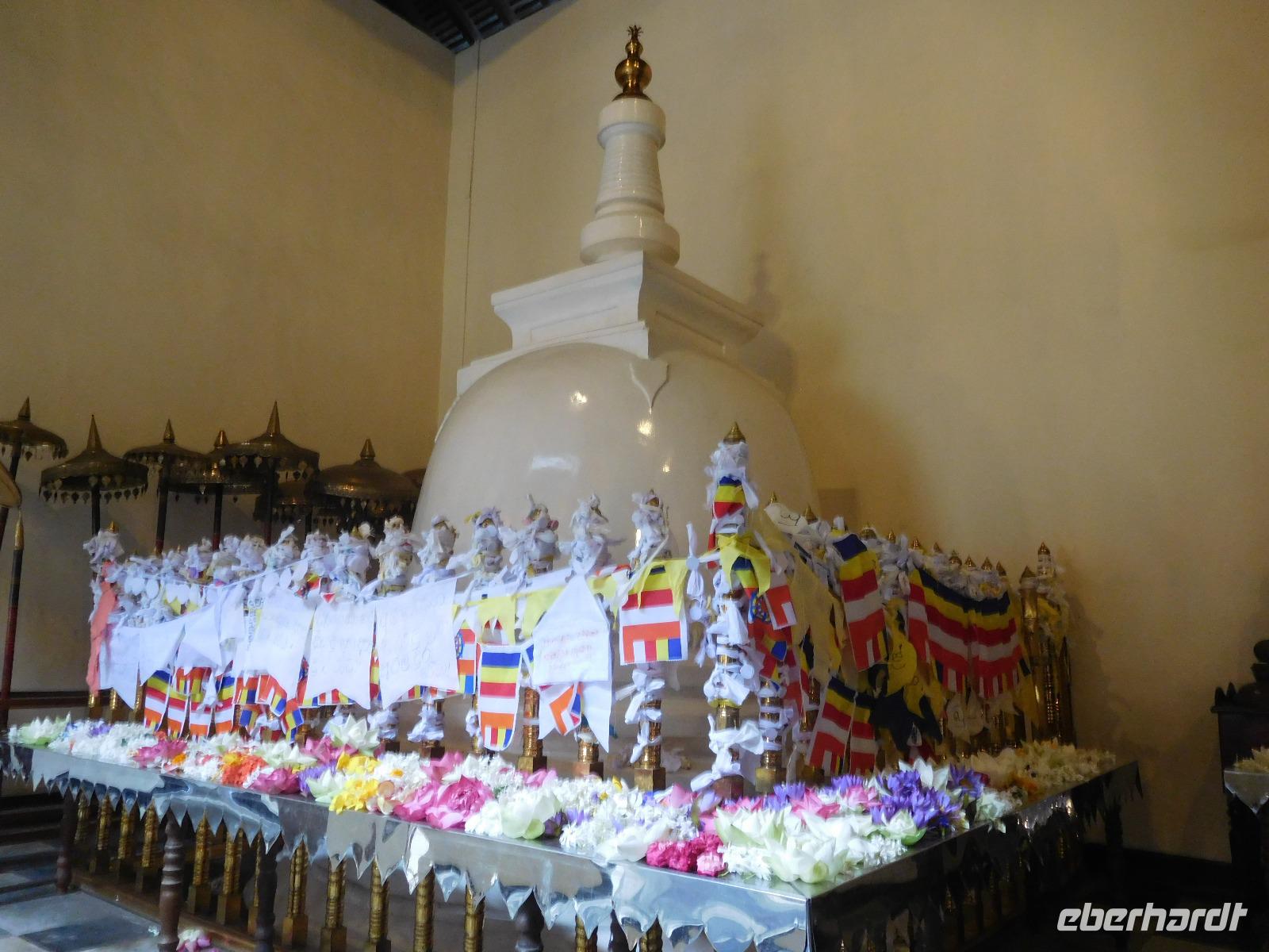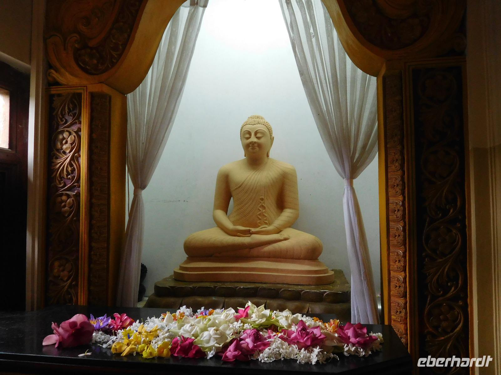 Wer nicht den feinen Sandstrand genoss, fuhr ins Herz der Insel zum "Zahntempel", offiziell dem Sri Dalada Maligawa Tempel nach Kandy. Nach 100 Kilometern Wegstrecke, die wir bei vier Stunden Fahrtzeit zurück gelegt hatten, waren wir endlich da. In Kandy wird das buddhistische Heiligtum, ein Eckzahn Buddhas, aufbewahrt. Den konnten wir zwar leider nicht sehen - stattdessen konnten wir uns davon überzeugen, dass er in seinen sieben reich verzierten Schatullen bestens gewürdigt wird und hinter einer ebenso prachtvollen wie verschlossenen Tür bestens aufgehoben ist. Während der Führung erfuhren wir viel über die schöne Tempelanlage, die ein wichtiger Pilgerort der Buddhisten ist.